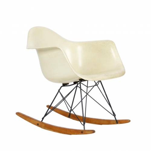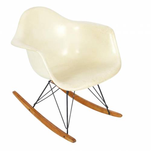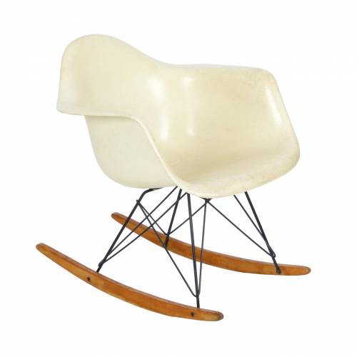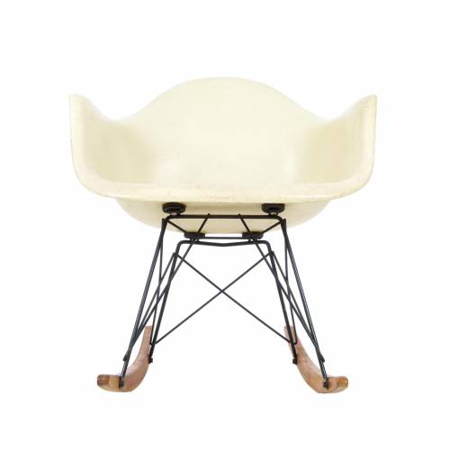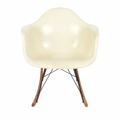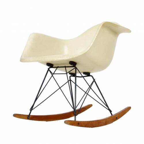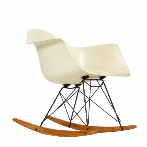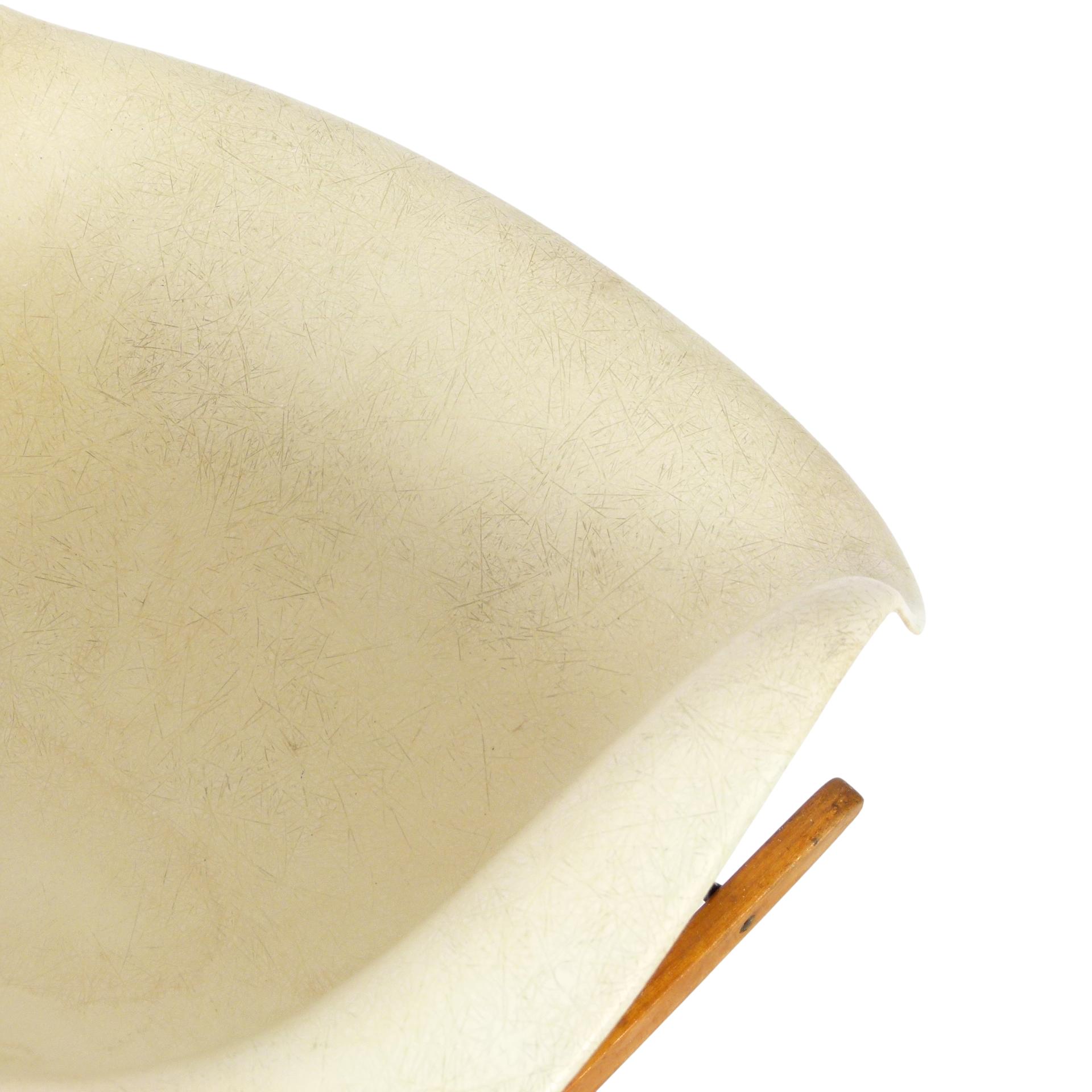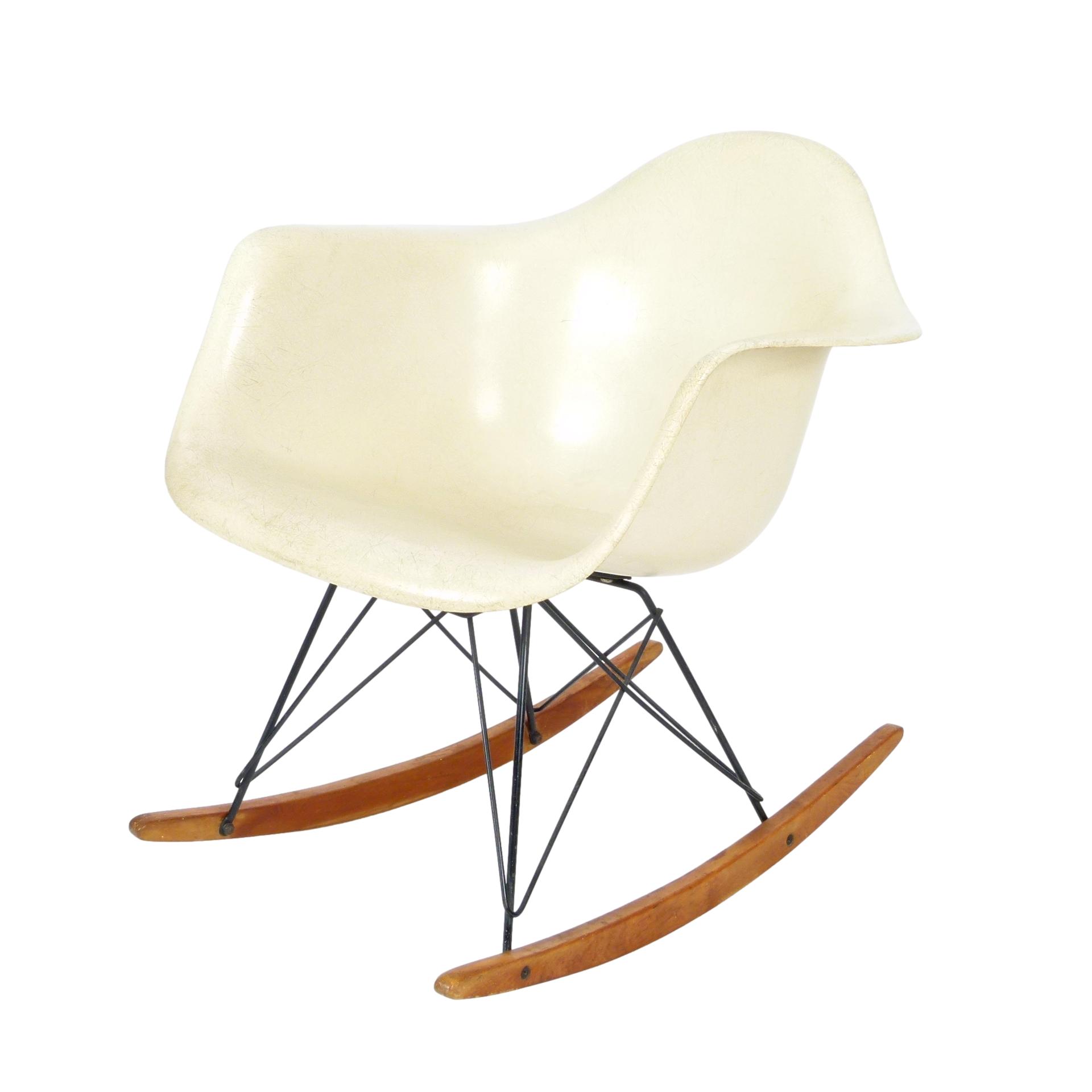 Eames armshell on original rocker base designed for Herman Miller. Retains original Herman Miller label as well as 1957 date stamp.