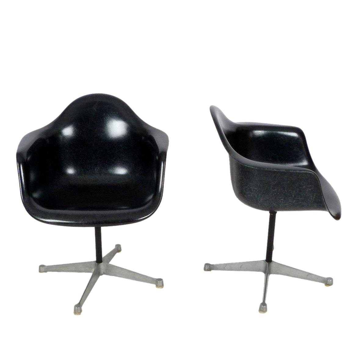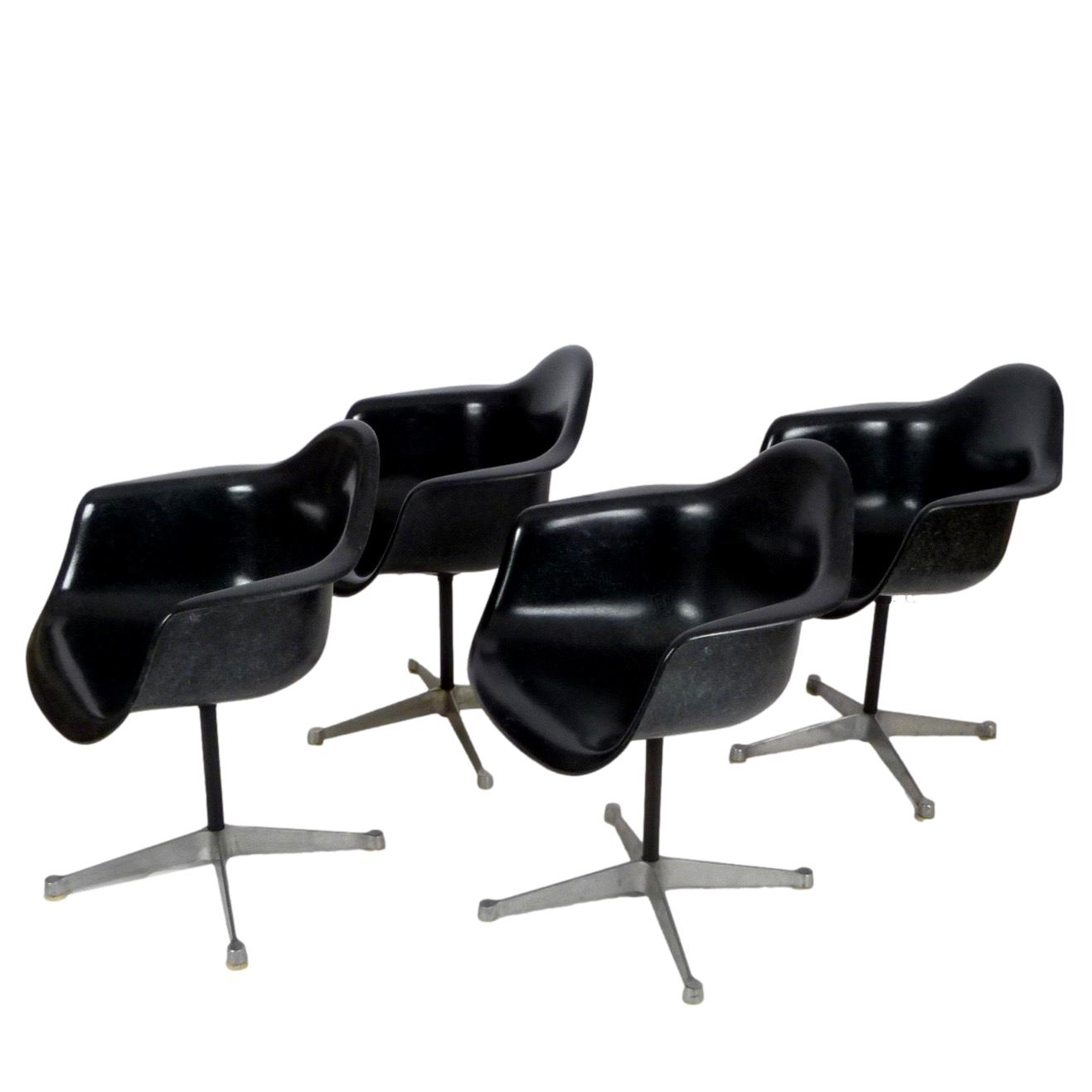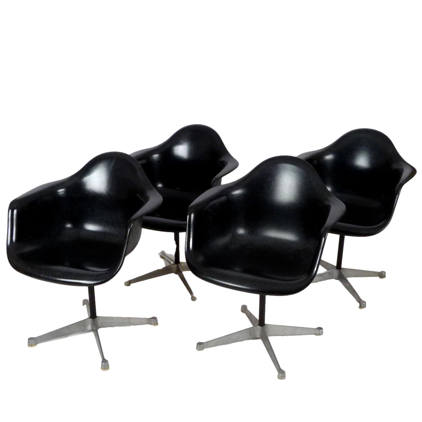 Set of 4 vintage Eames black fiberglass shell armchairs by Modernica with Herman Miller swivel pedestal bases.
