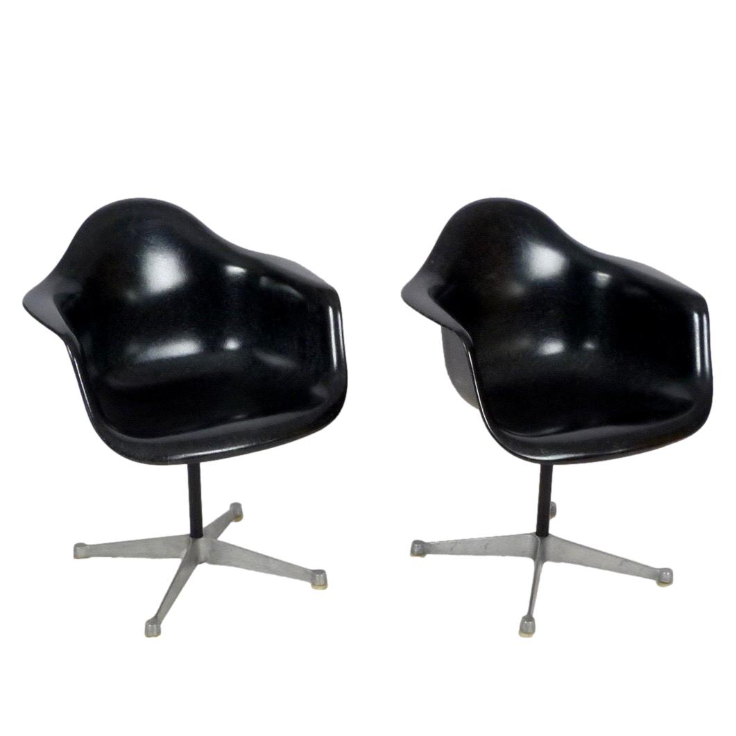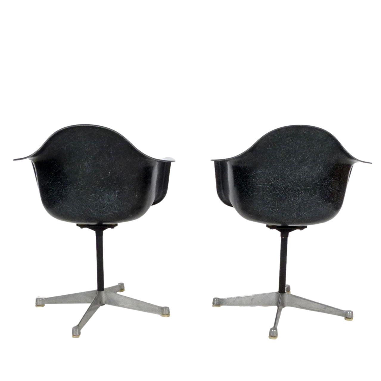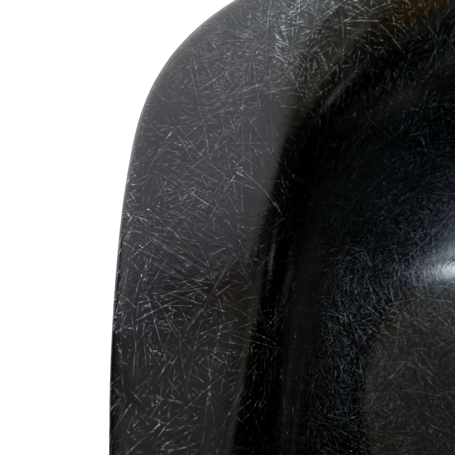 Set of 4 vintage Eames black fiberglass shell armchairs by Modernica with Herman Miller swivel pedestal bases.