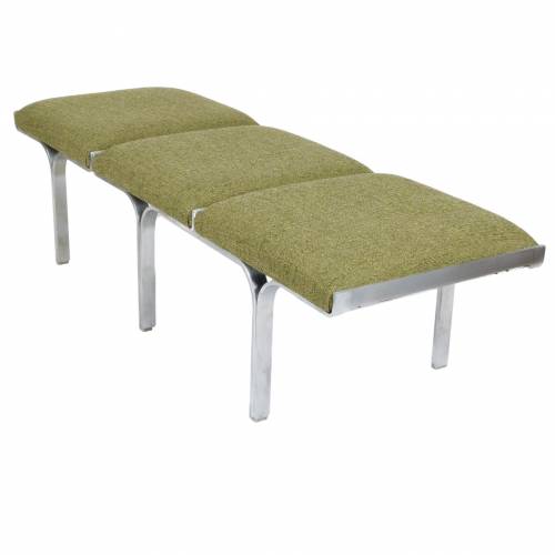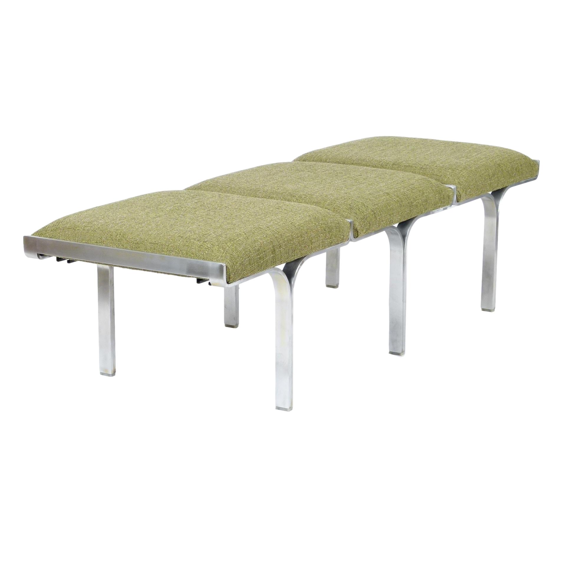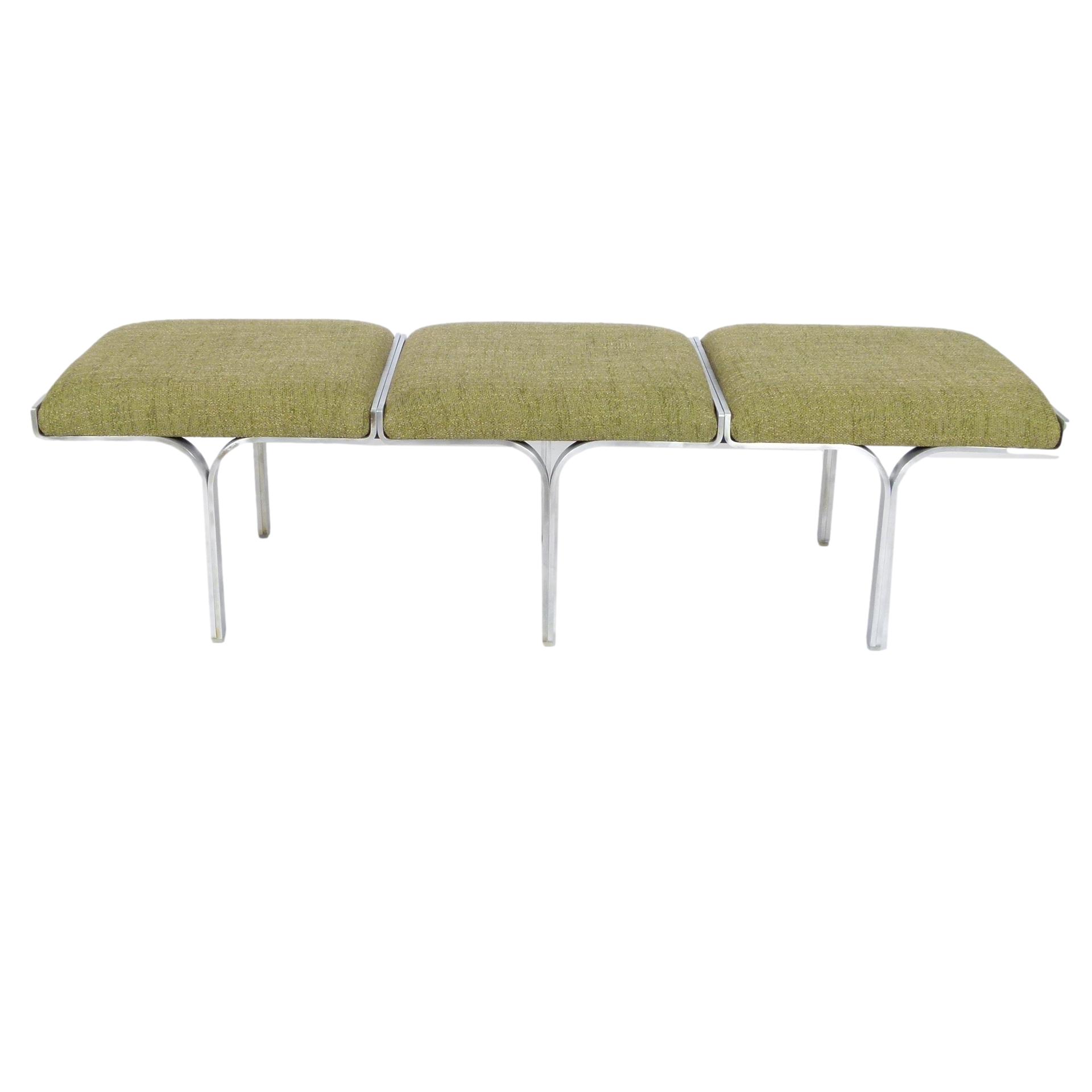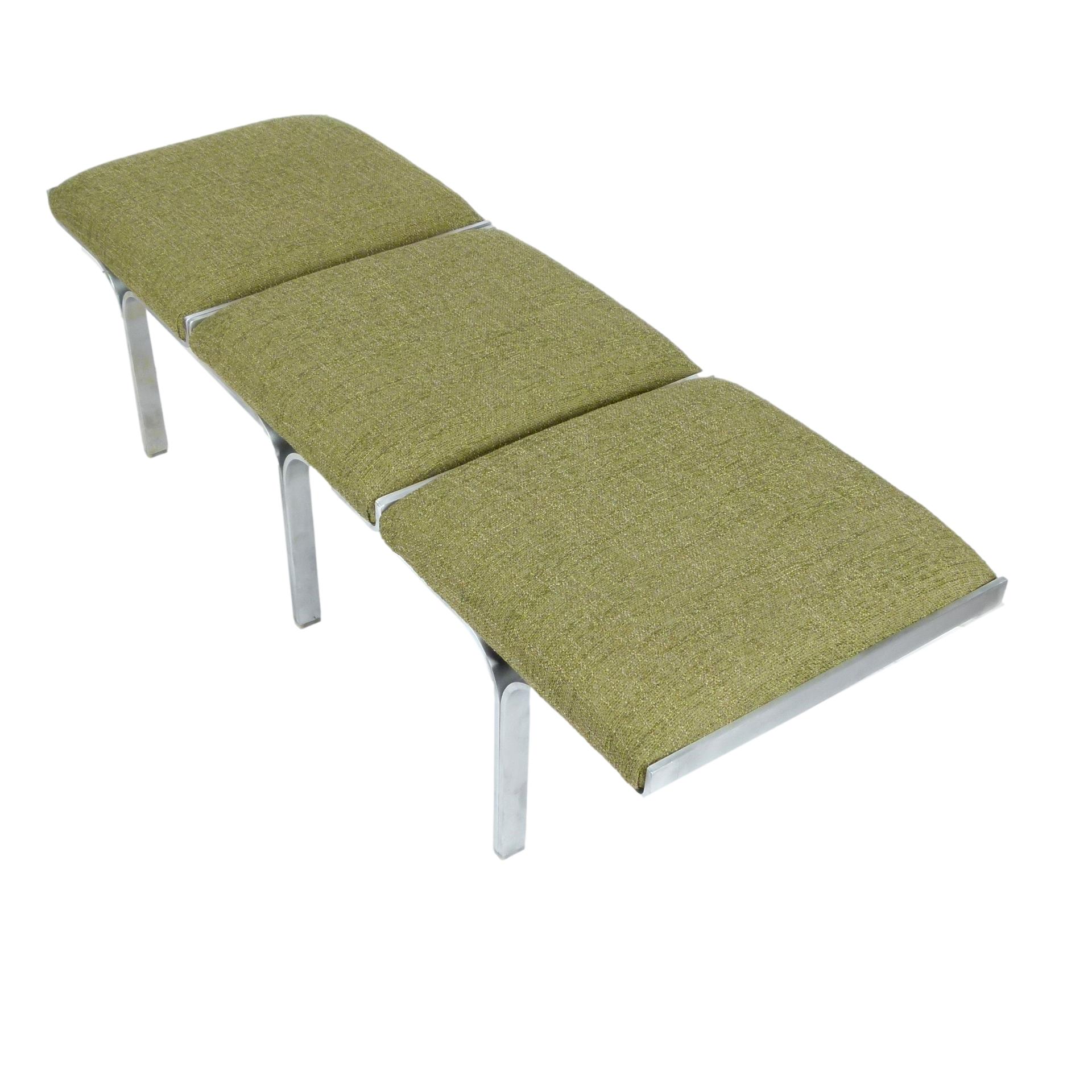 1960s upholstered three seat "Link" bench with steel arch construction and new upholstery designed by John Behringer for Fabry Associates, Inc.