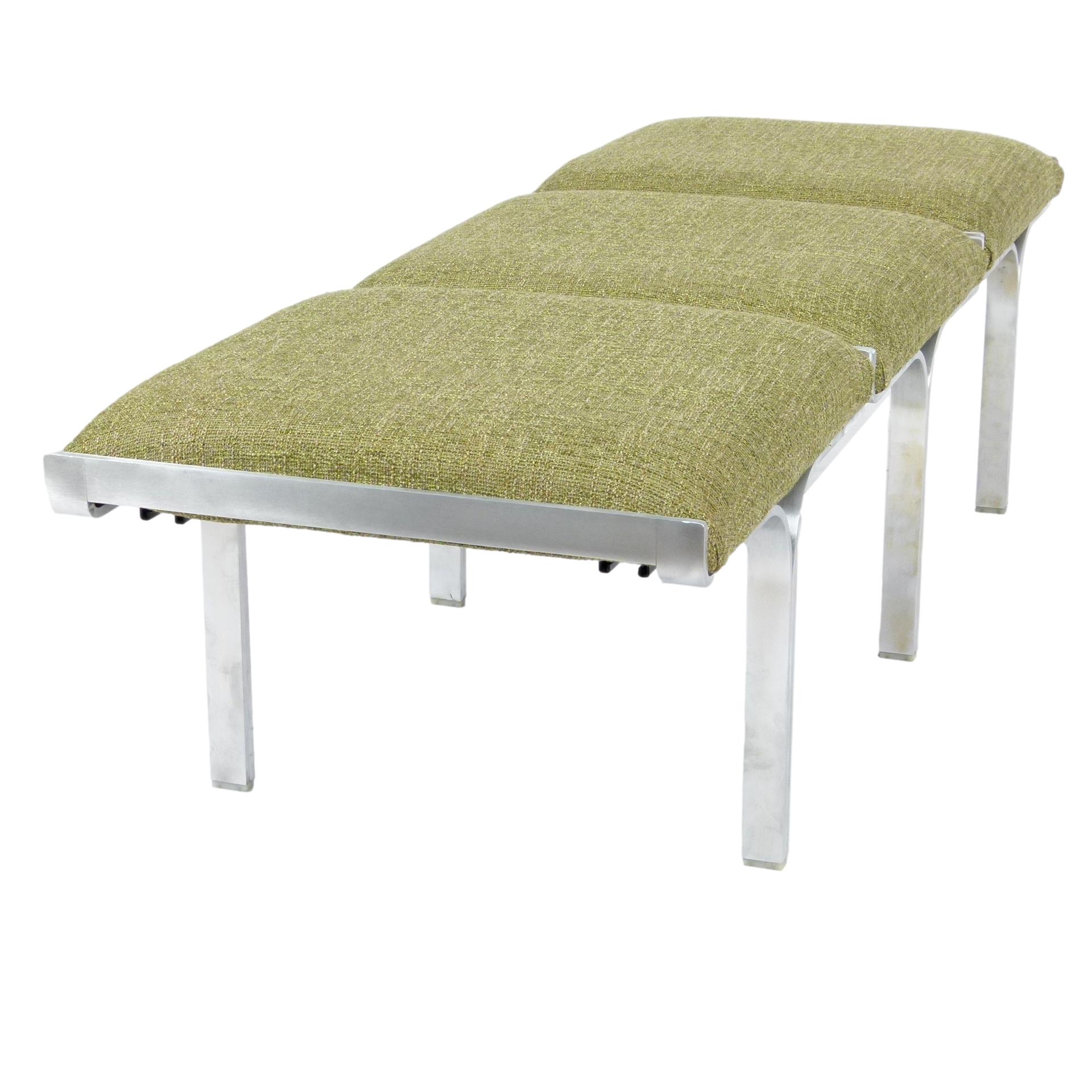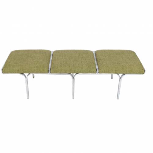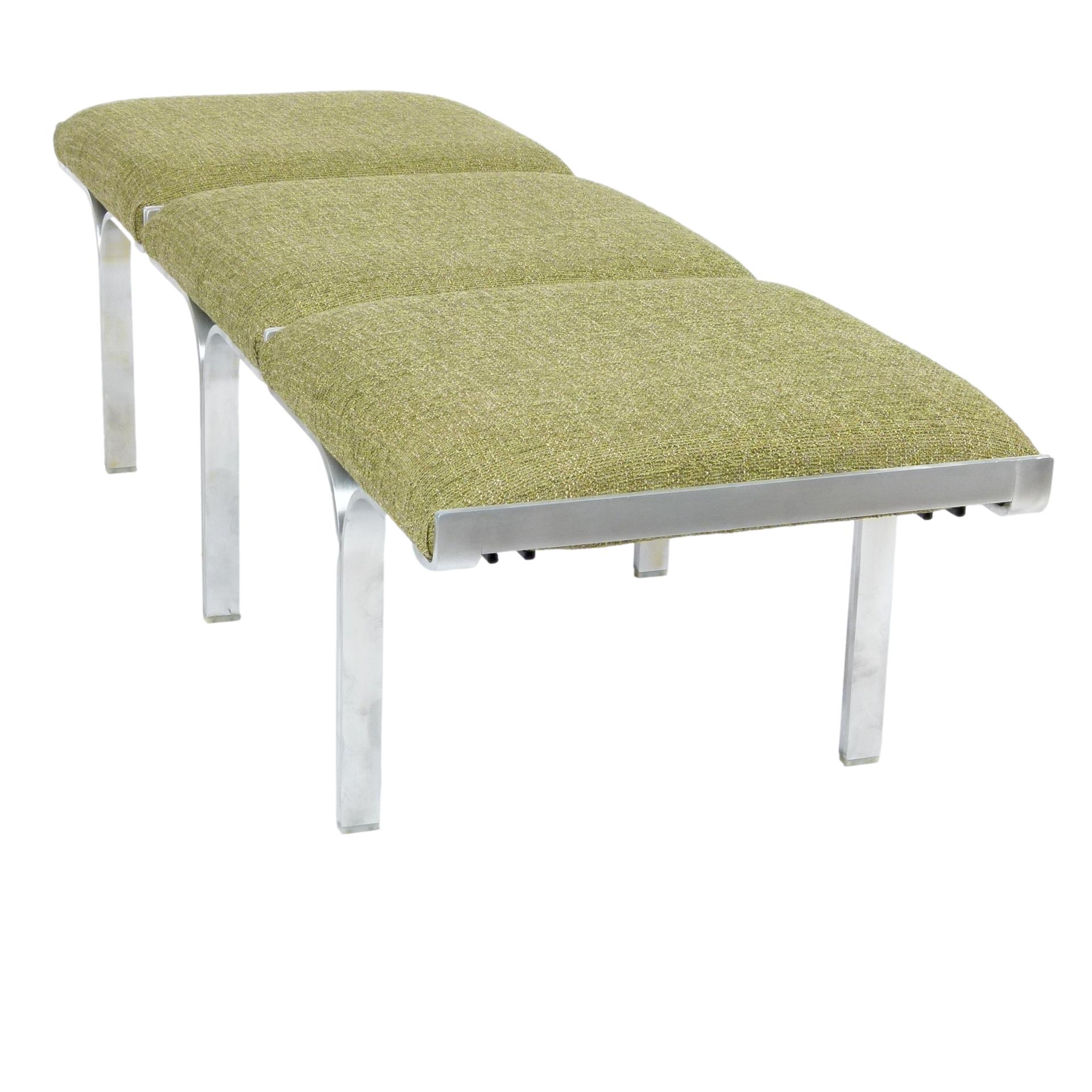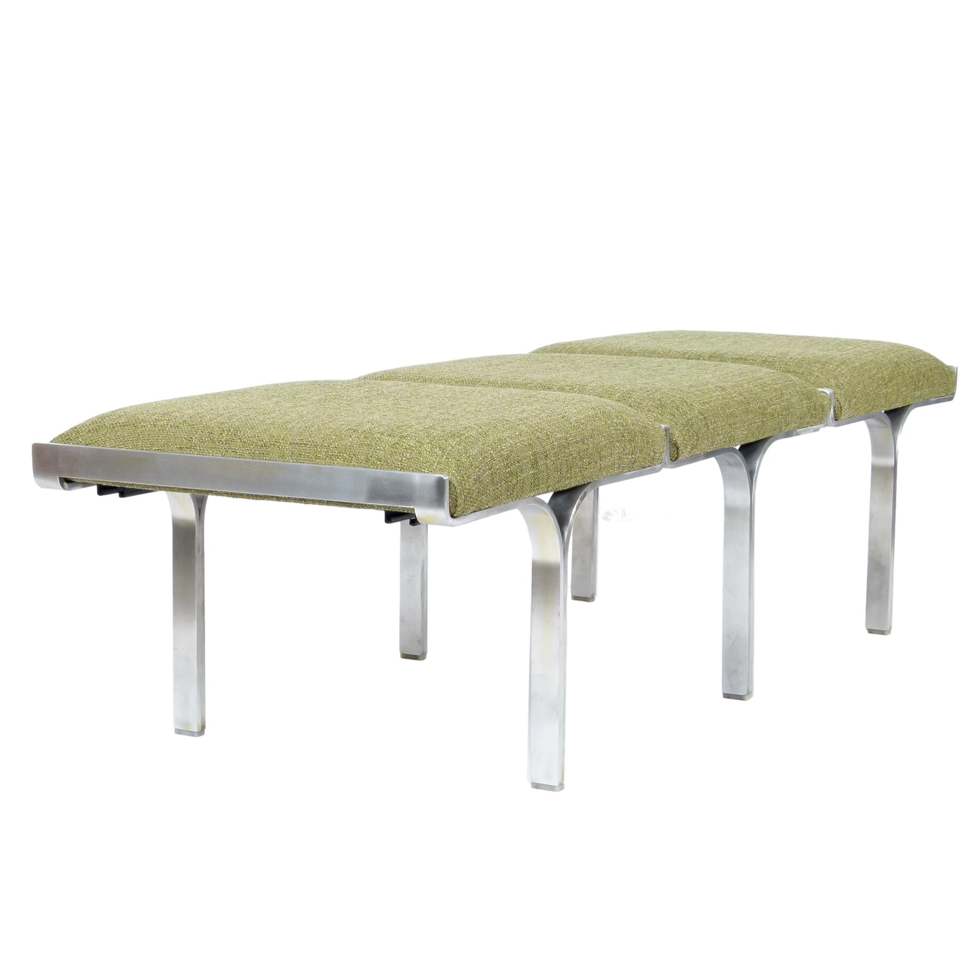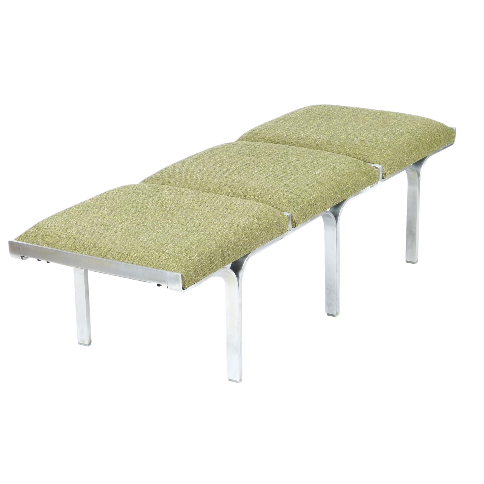 1960s upholstered three seat "Link" bench with steel arch construction and new upholstery designed by John Behringer for Fabry Associates, Inc.