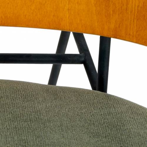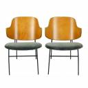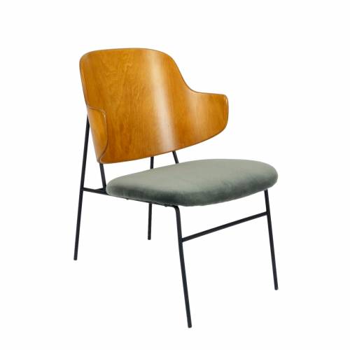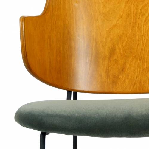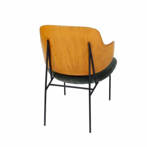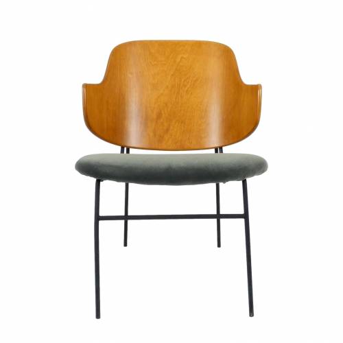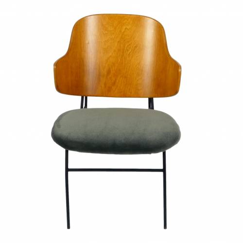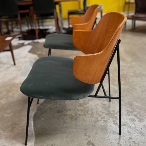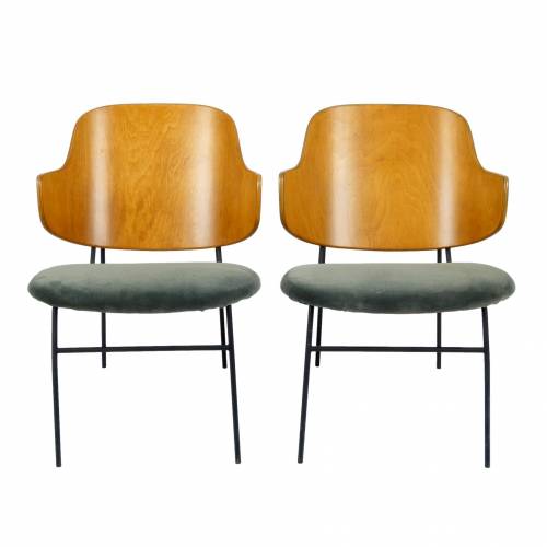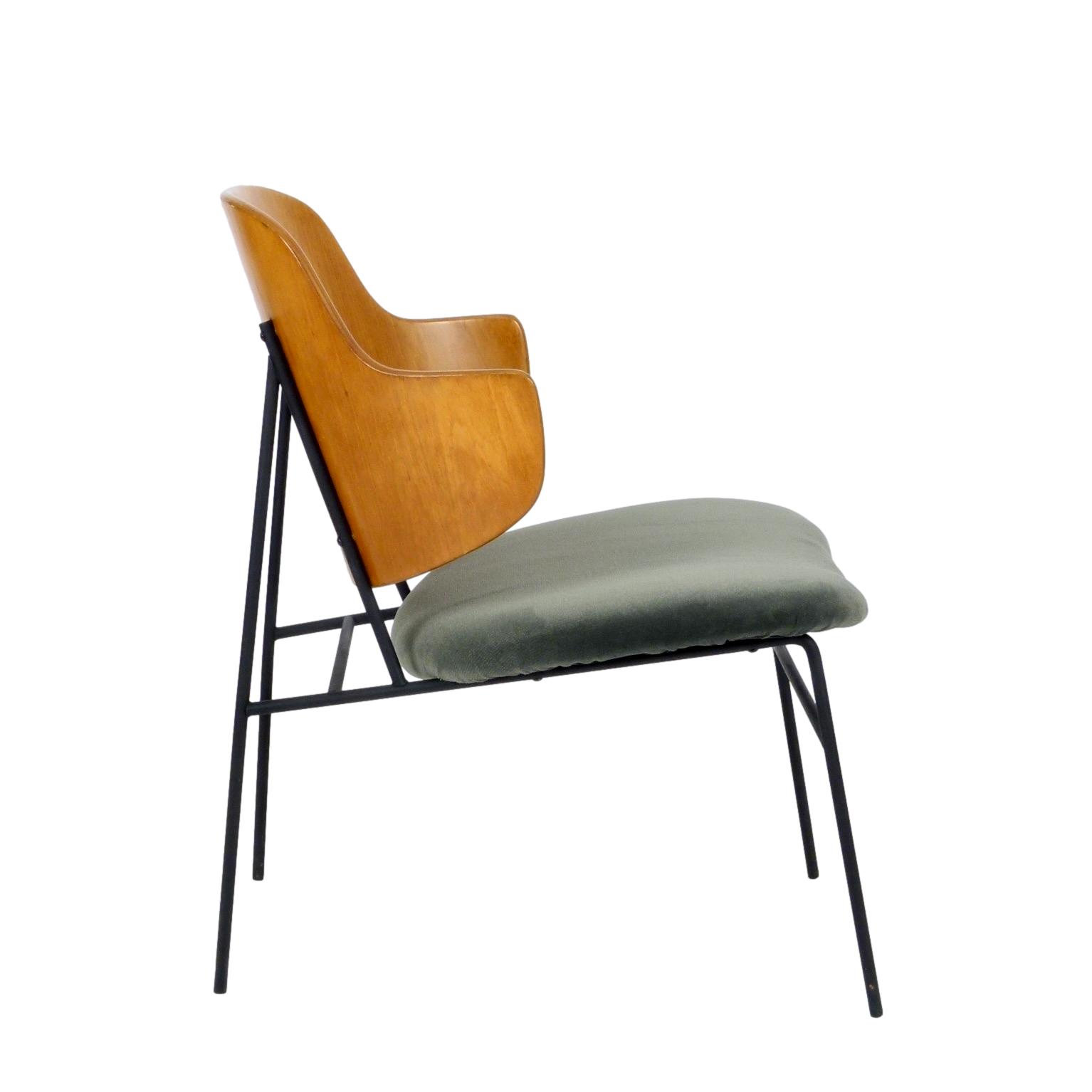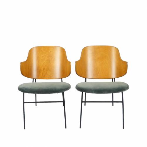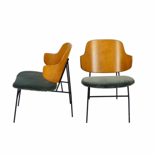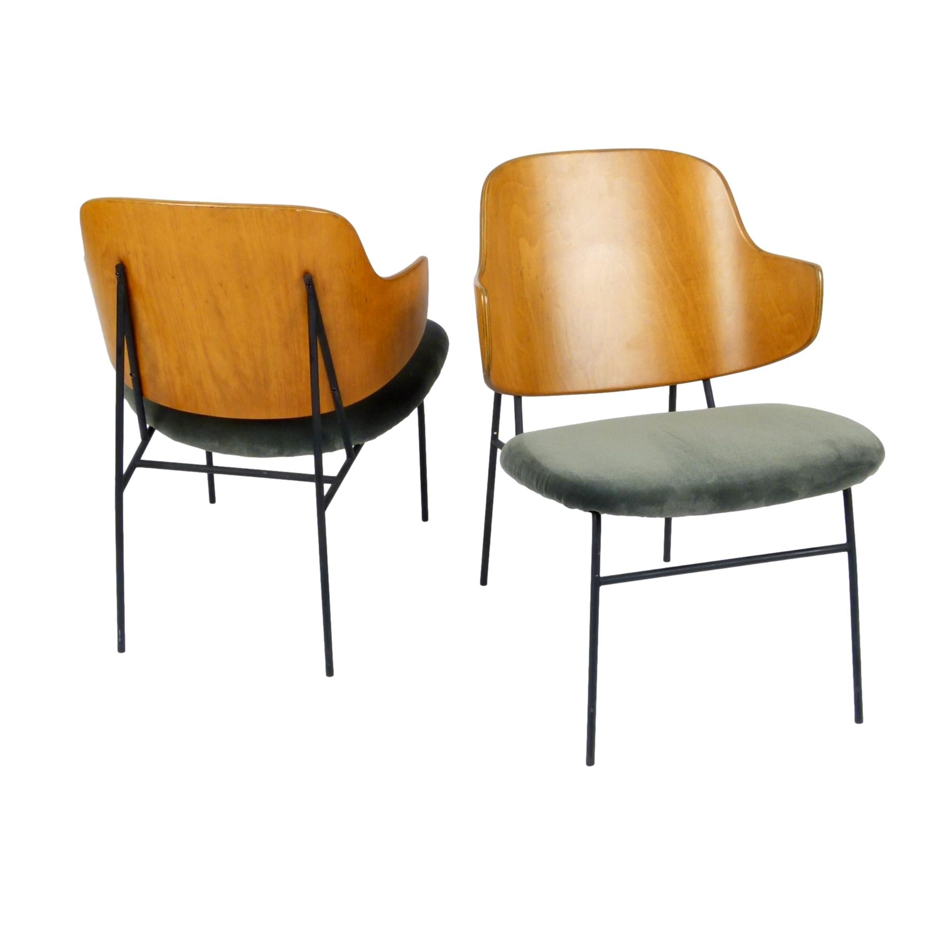 Pair of Penguin lounge chair by Ib Kofod-Larsen, Denmark. Wrought iron frames with molded maple plywood backs, and new performance velvet upholstery.
