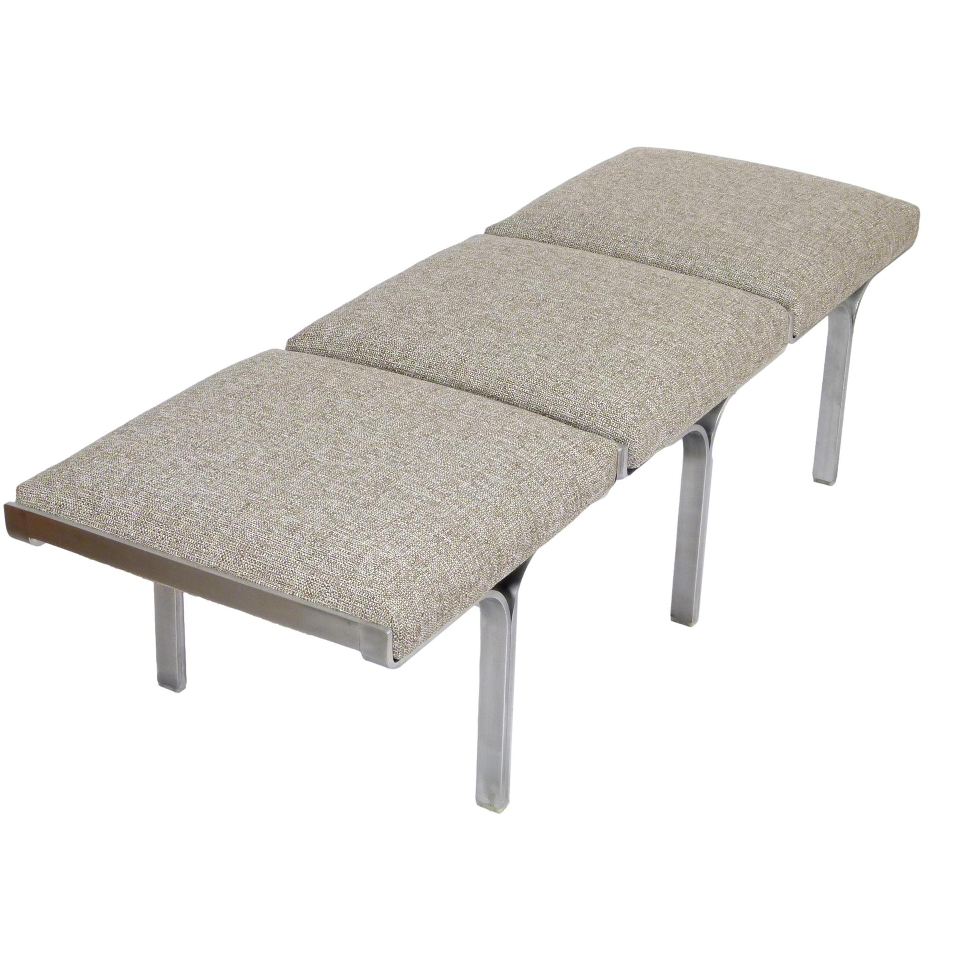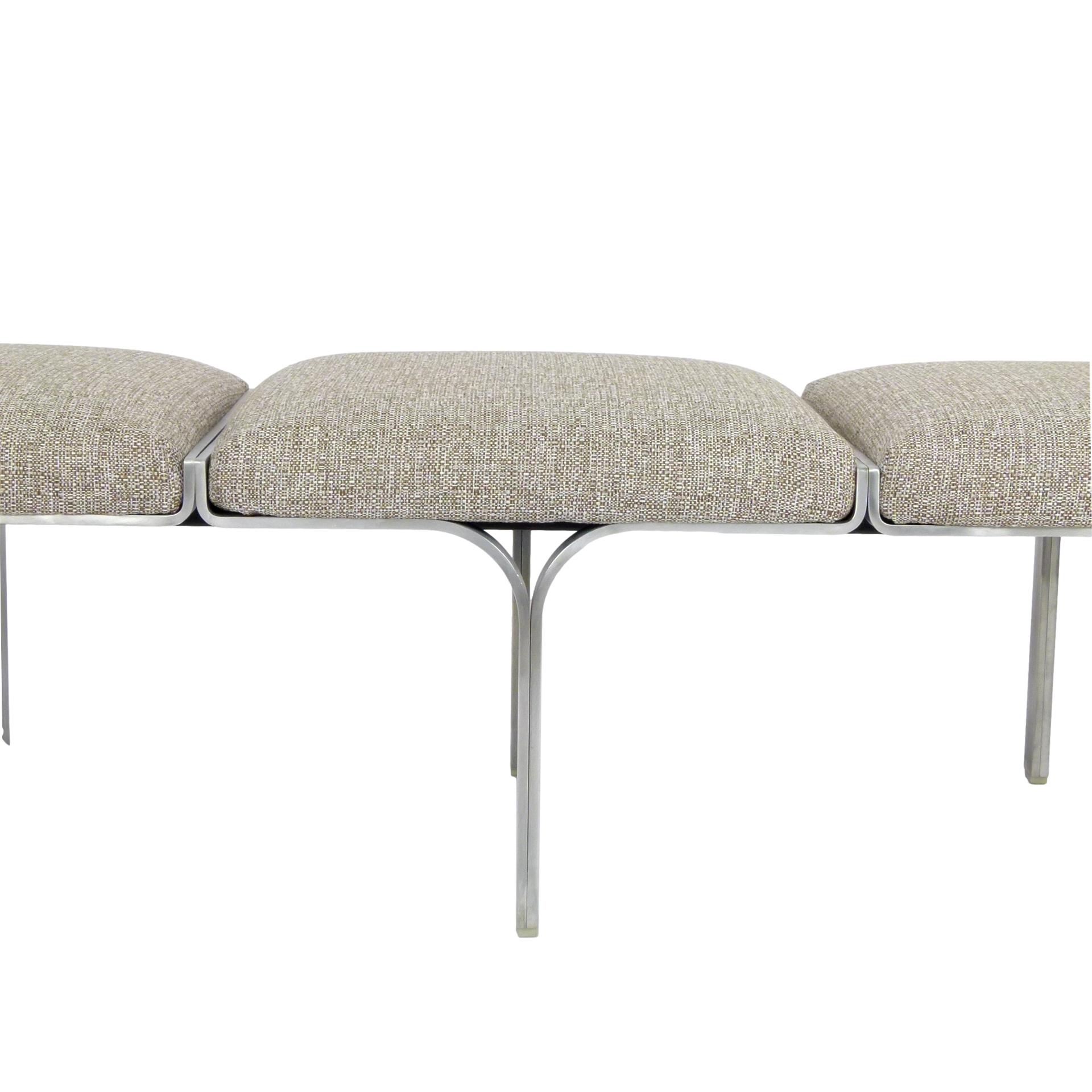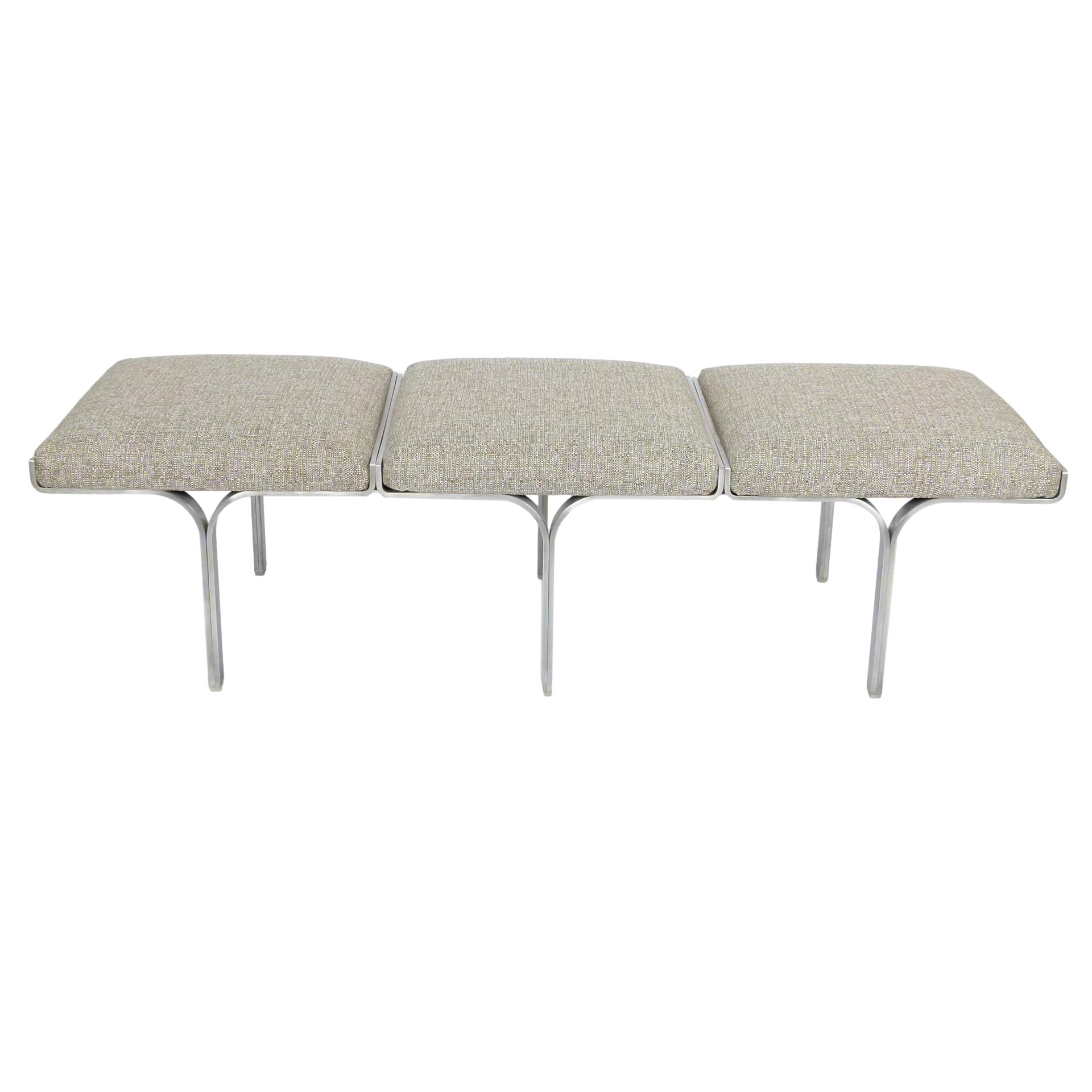 1960s upholstered three seat "Link" bench with steel arch construction and new upholstery designed by John Behringer for Fabry Associates, Inc.