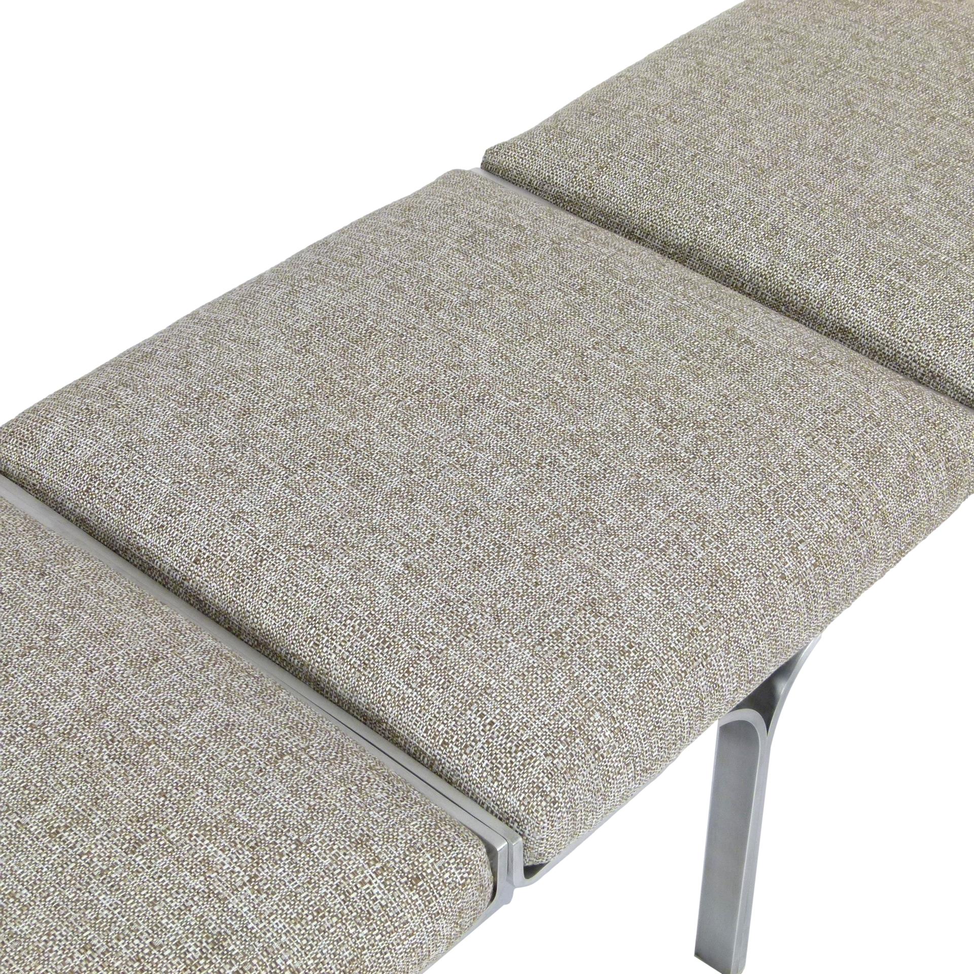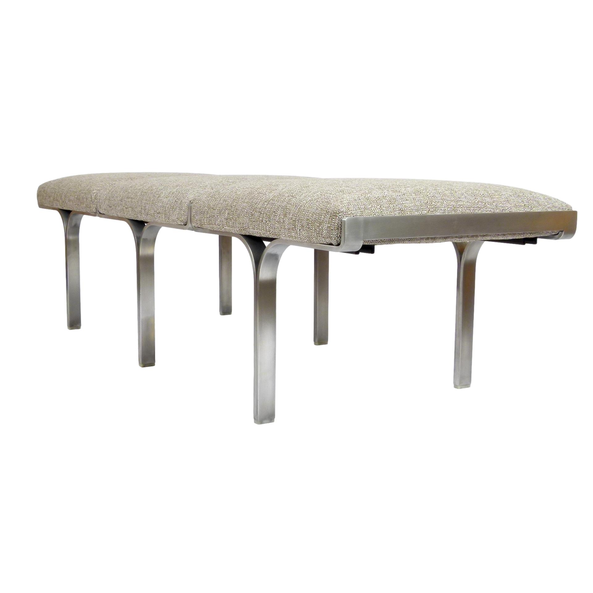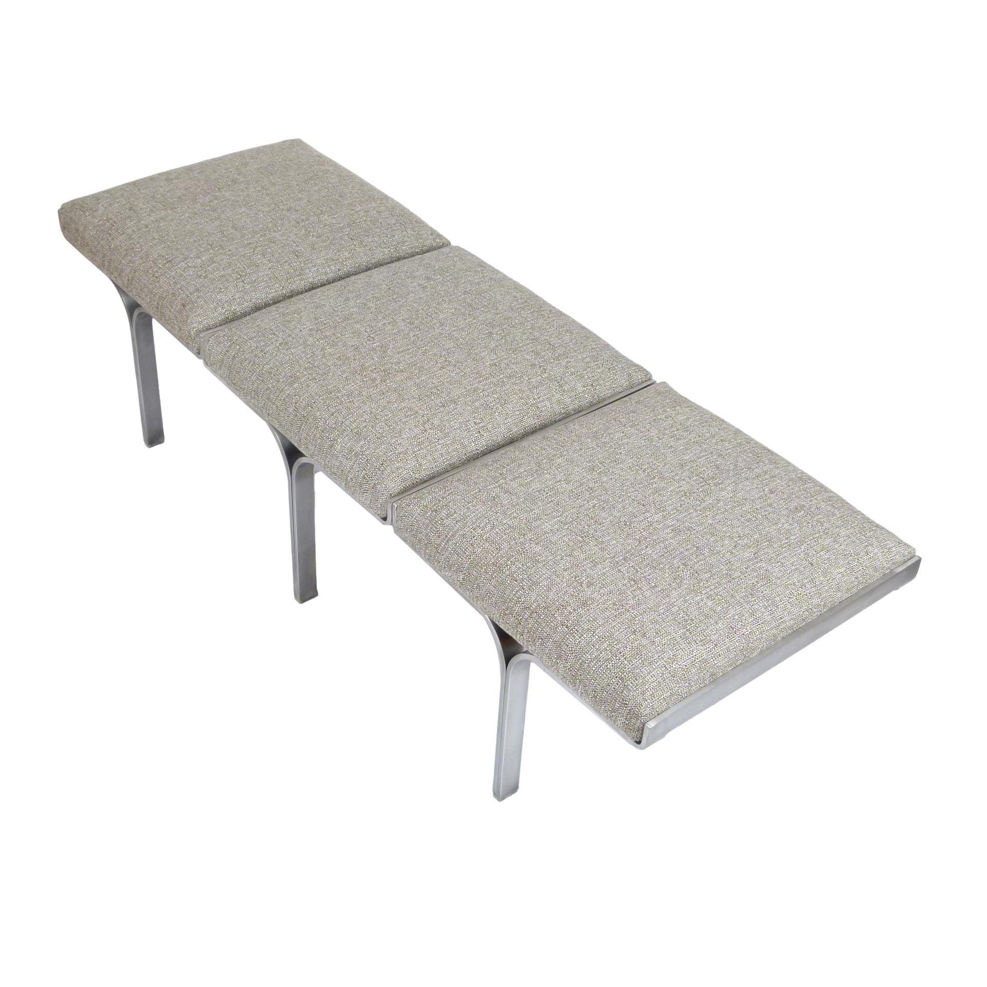 1960s upholstered three seat "Link" bench with steel arch construction and new upholstery designed by John Behringer for Fabry Associates, Inc.