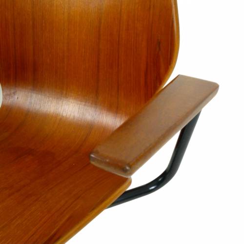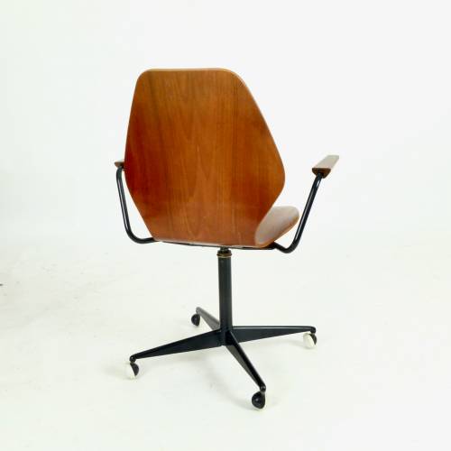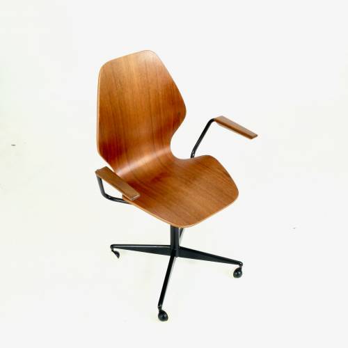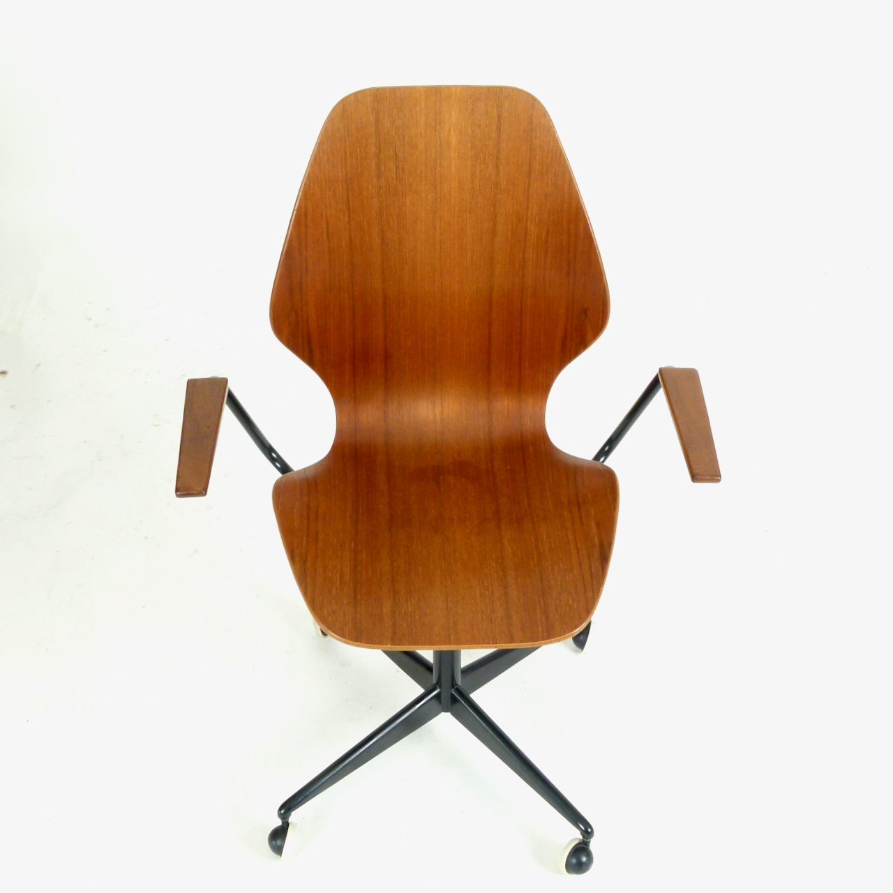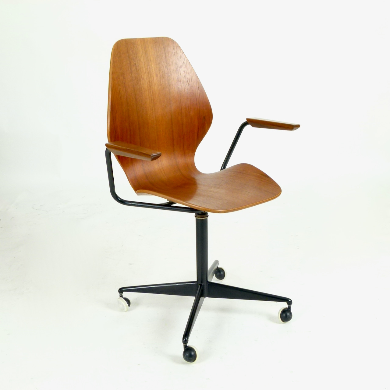 C.1970 "City" swivel armchair designed by Øyvind Iversen, imported by Westnofa, Norway. Molded teak frame over enameled steel frame and original Fora Form casters.