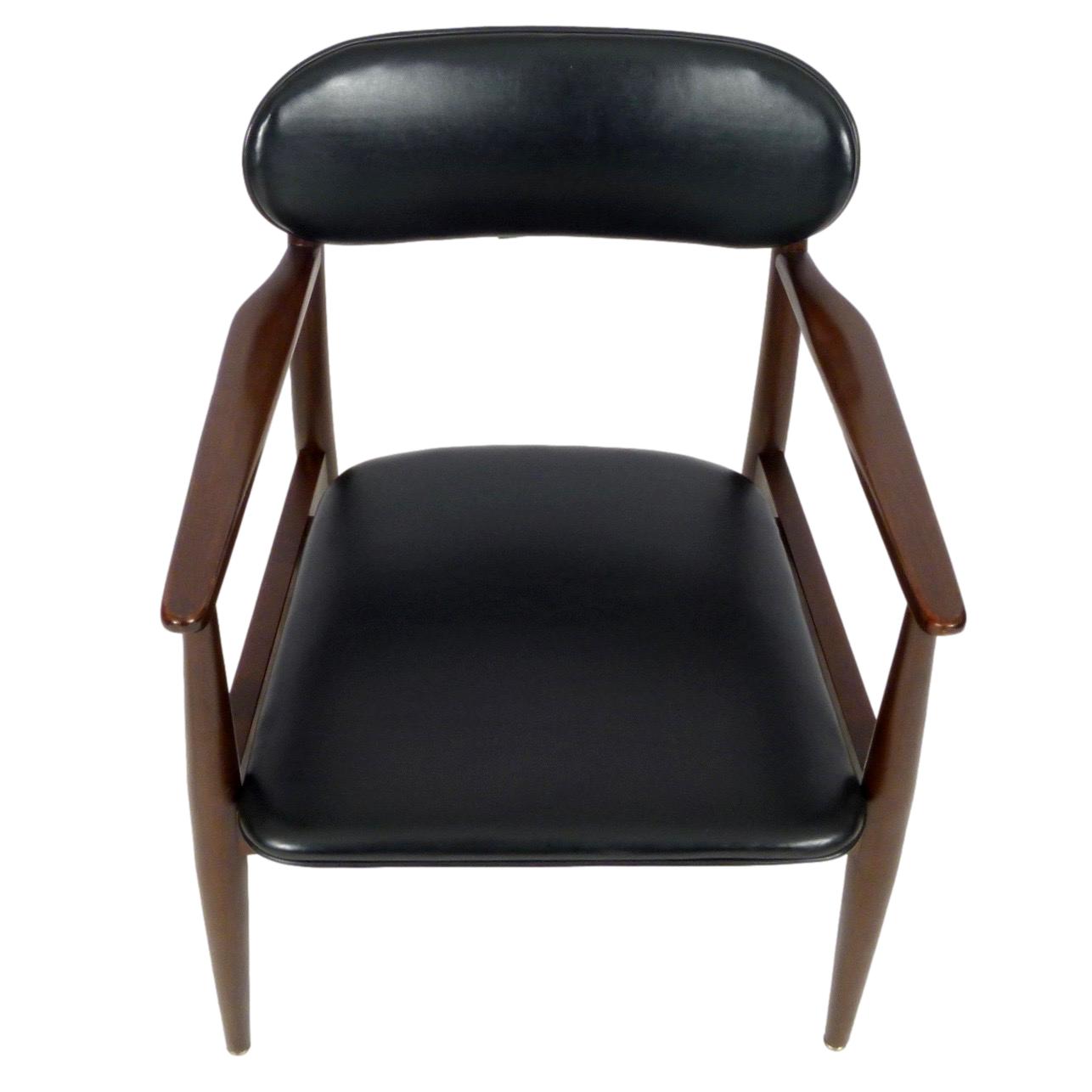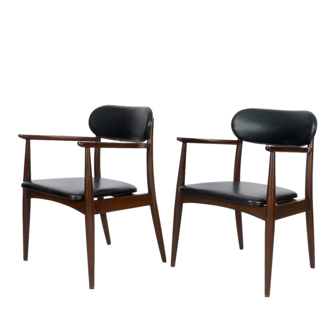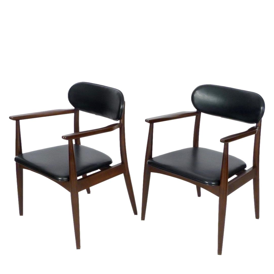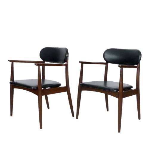 Pair of 1970s armchairs in dark stained wood and faux leather upholstery.