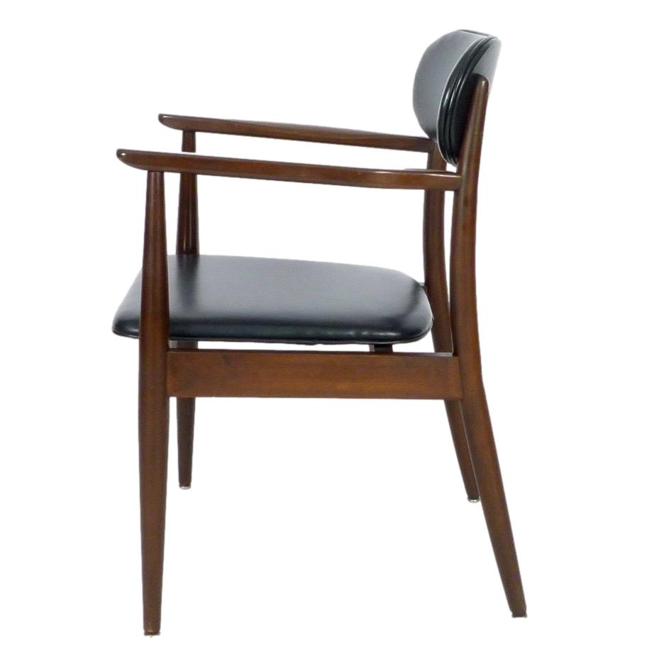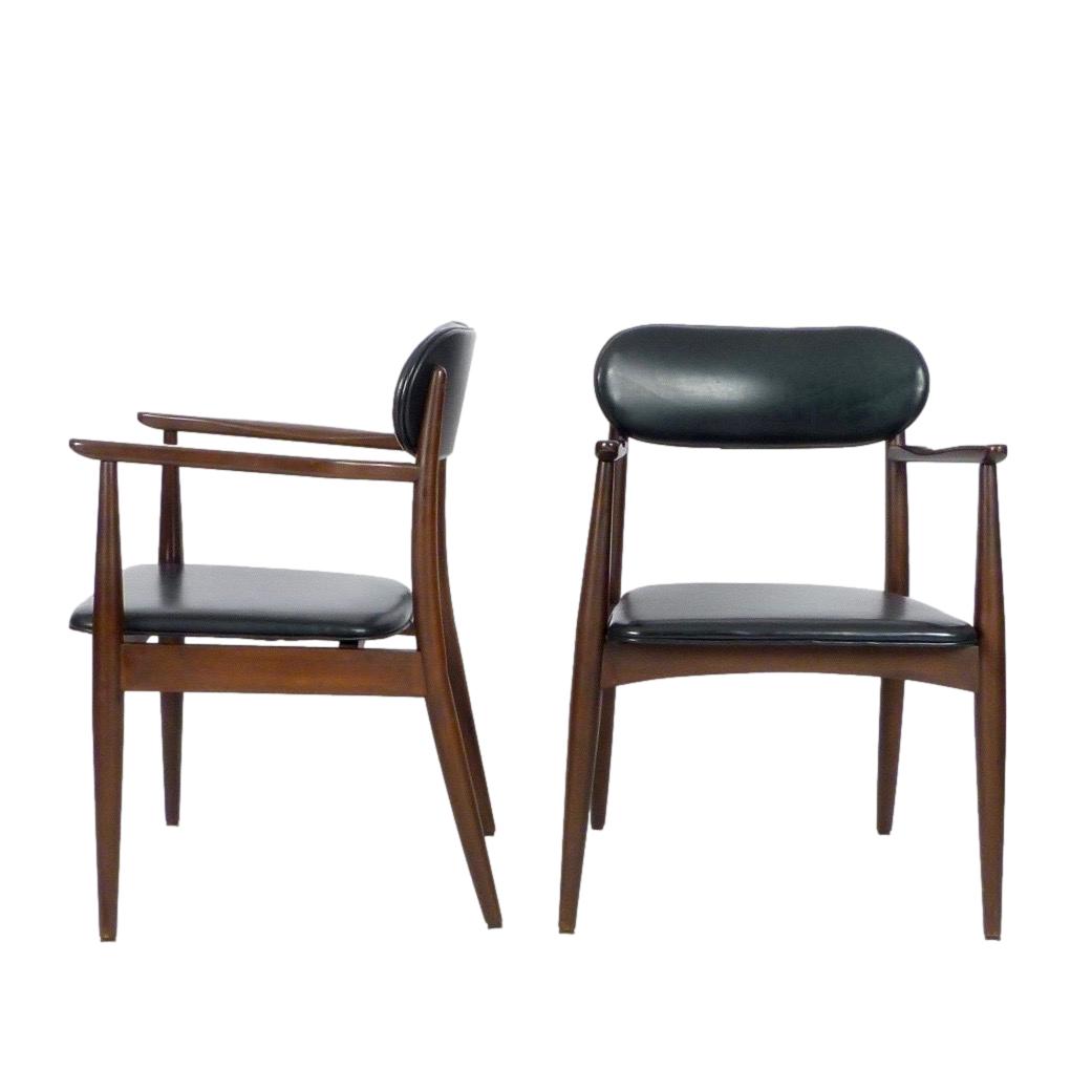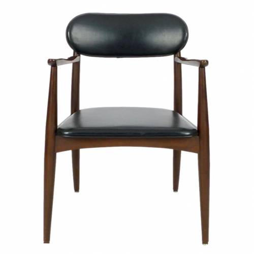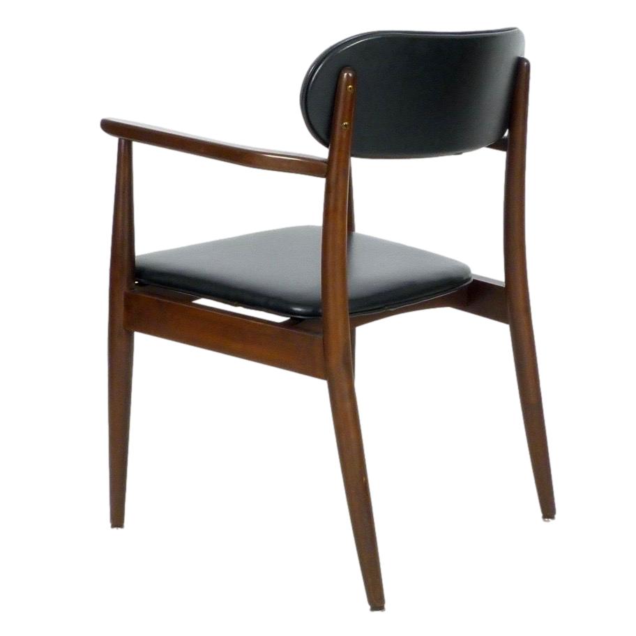 Pair of 1970s armchairs in dark stained wood and faux leather upholstery.