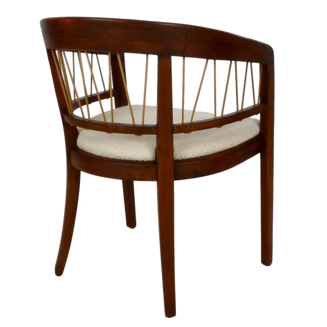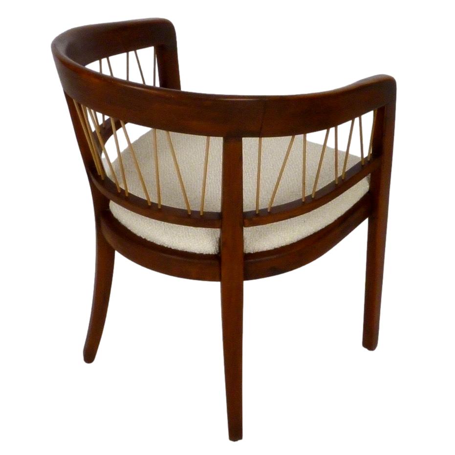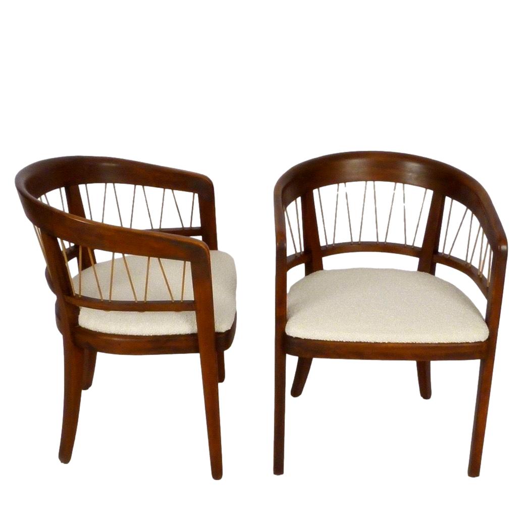 Pair of c.1950 walnut model 229-4 barrel back armchairs by Edward Wormley from his Precedent Line for Drexel. New upholstery.