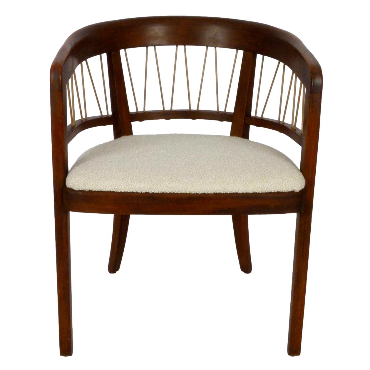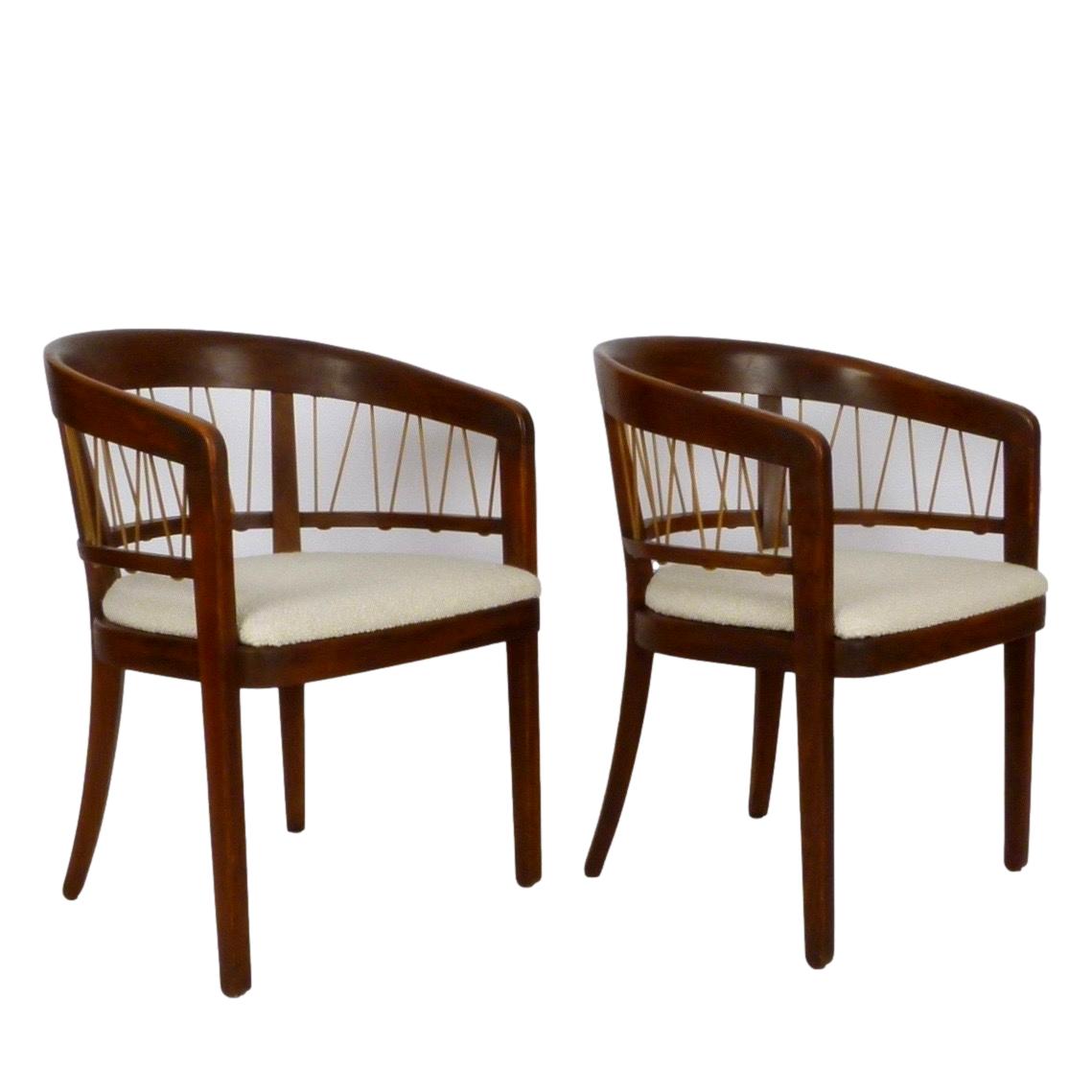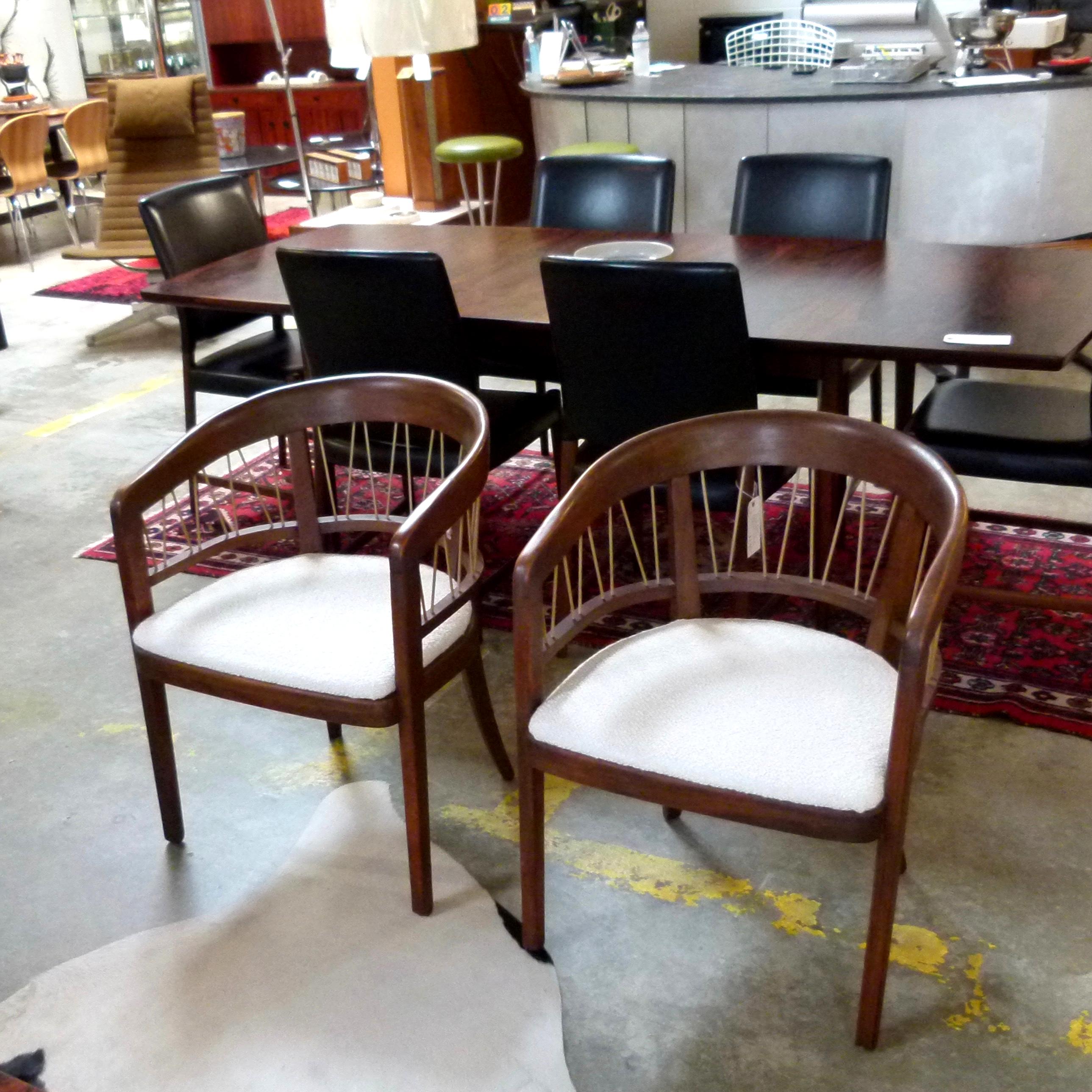 Pair of c.1950 walnut model 229-4 barrel back armchairs by Edward Wormley from his Precedent Line for Drexel. New upholstery.