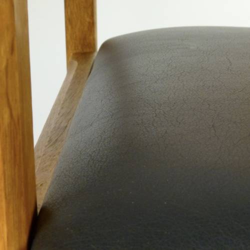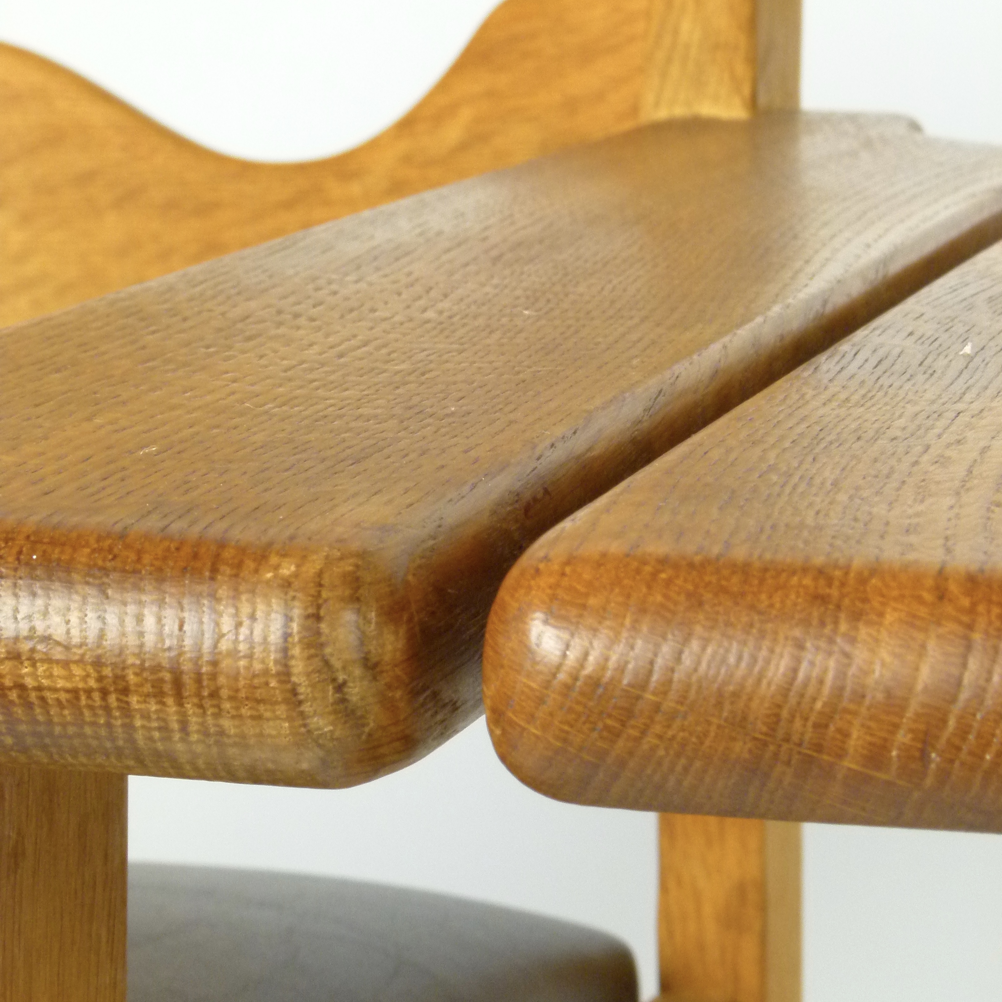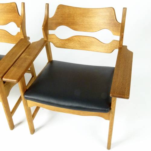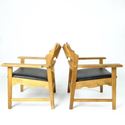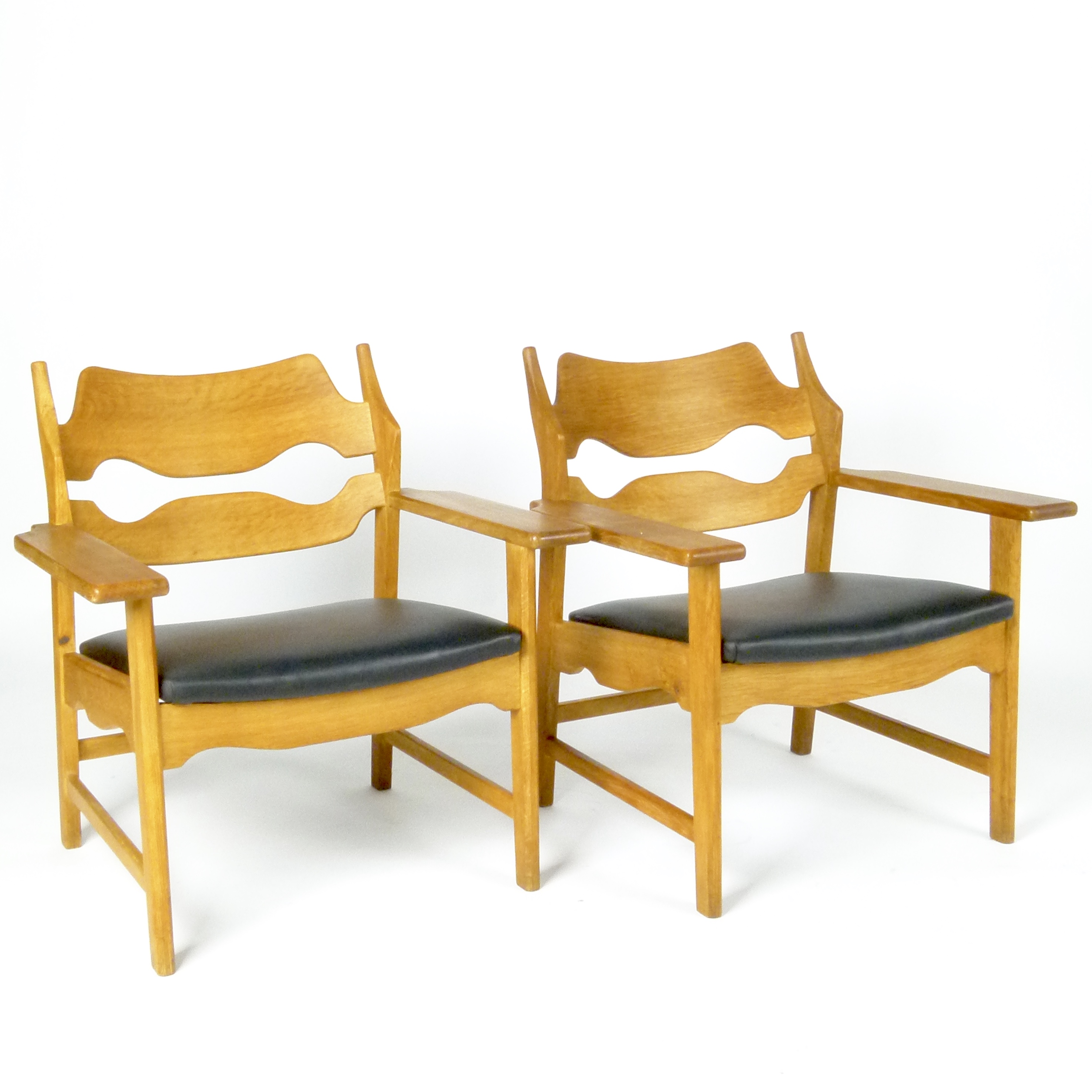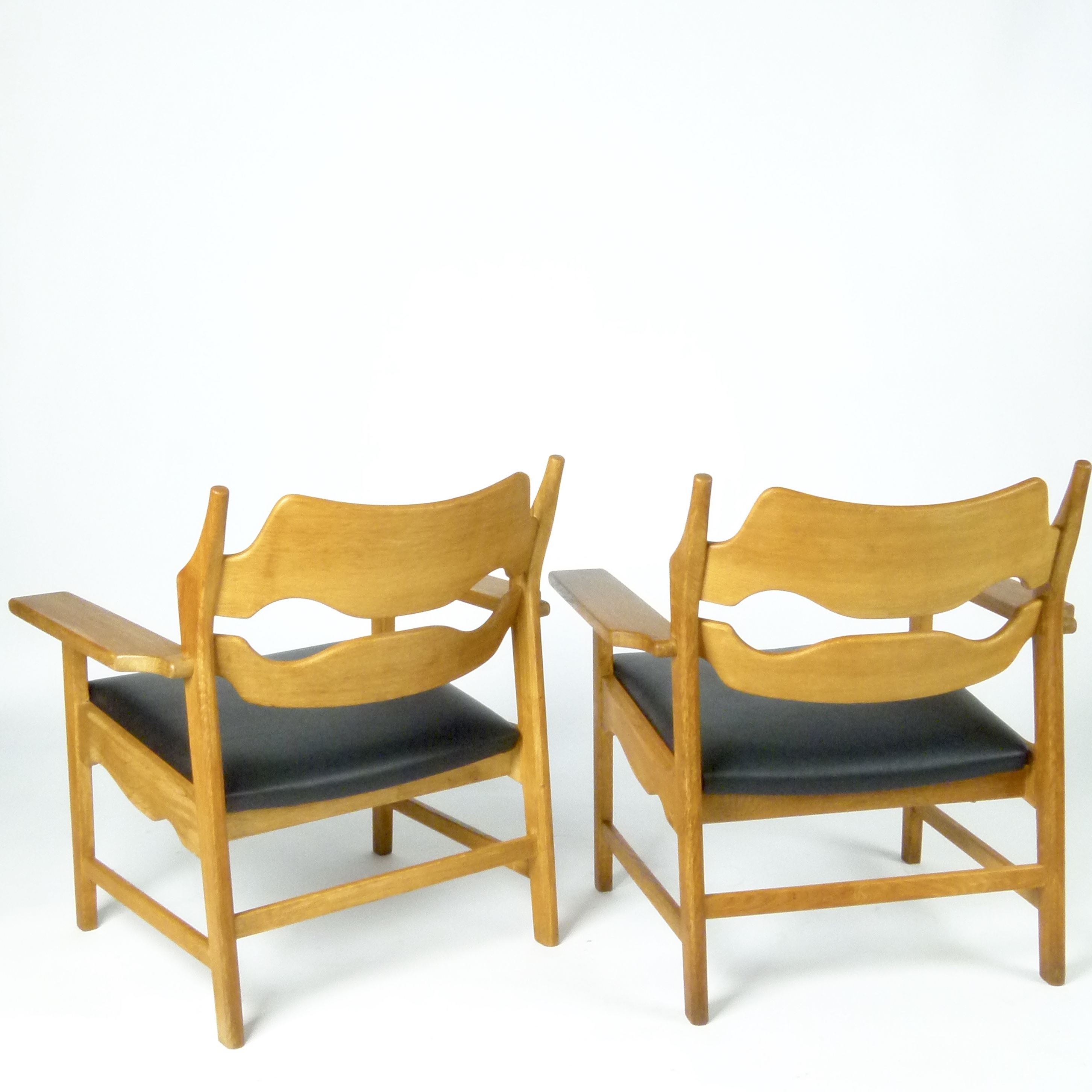 Pair of c. 1960 solid, quarter sawn oak frame lounge chairs with characteristic razor blade design on back by Henning Kjaernulf for EG, Denmark. Restored with new Edelman Italian leather seats.