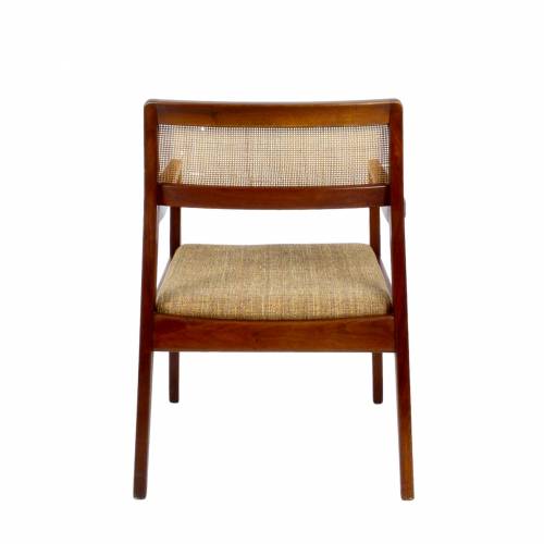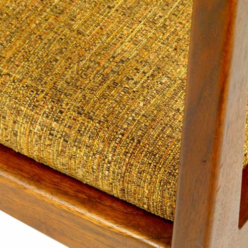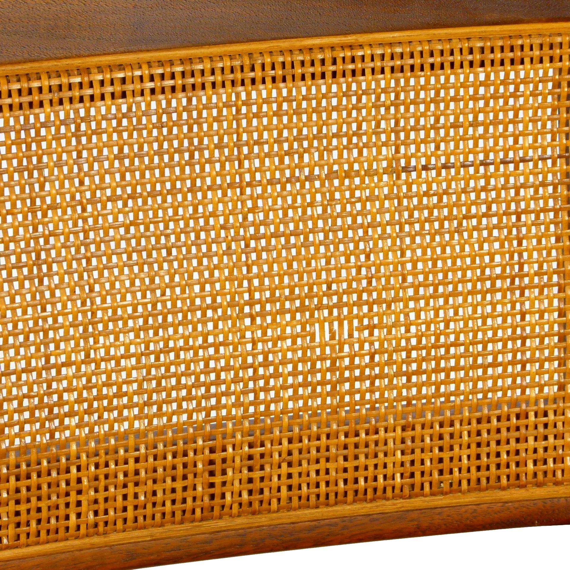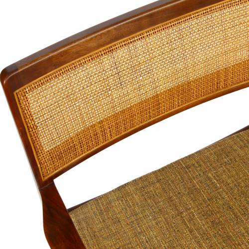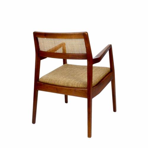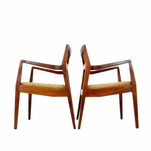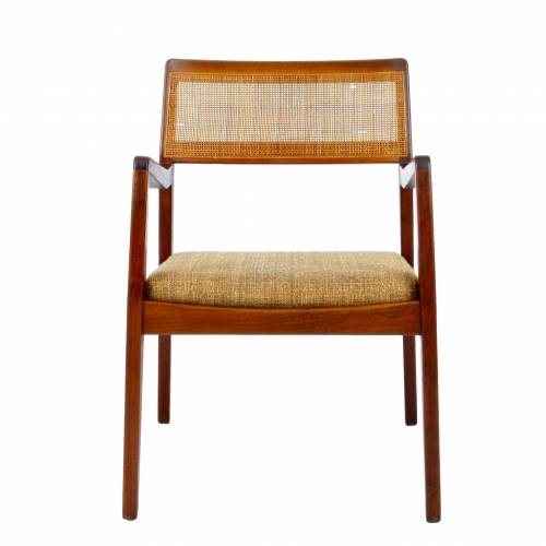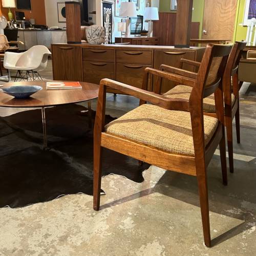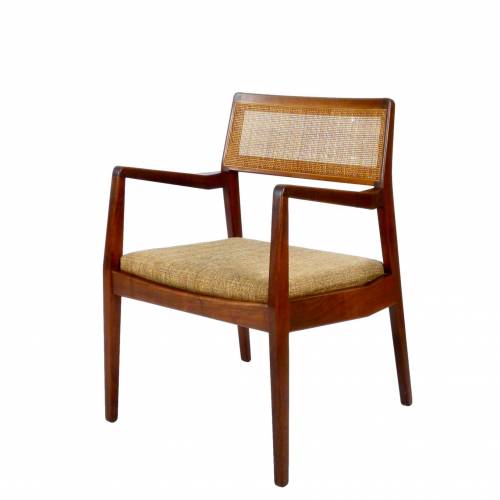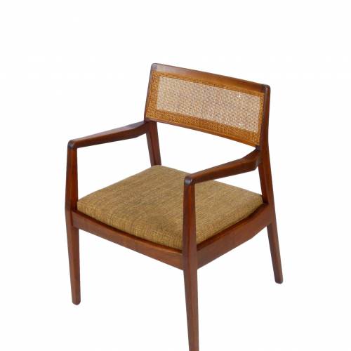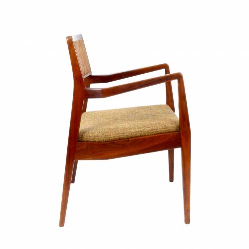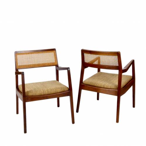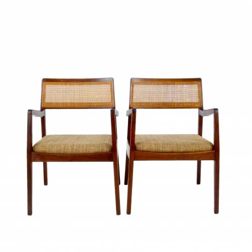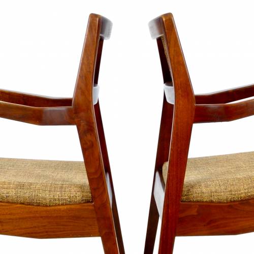 Pair of solid oiled walnut frame armchairs 1105 by Jens Risom. This iconic chair is beautifully crafted in solid black walnut with upholstered seats and caned backs. Sold as a pair.