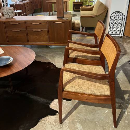 Condition: Good to very good, a few places of missing cane on each, recently reupholstered with new fabric.