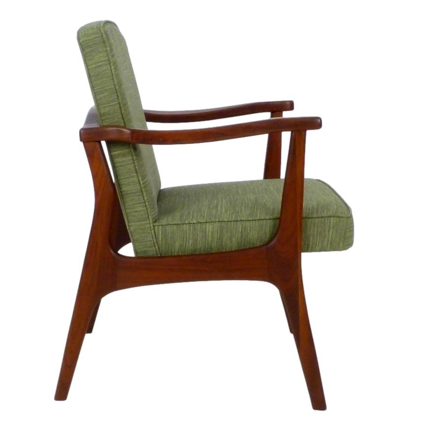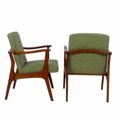 Pair of 1960s armchairs with sculpted walnut frames and new upholstery.