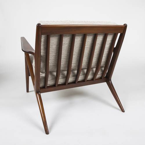 Pair of c. 1960 lounge chairs in walnut by Poul Jensen, Denmark. Imported by Selig. Restored with new cushions.