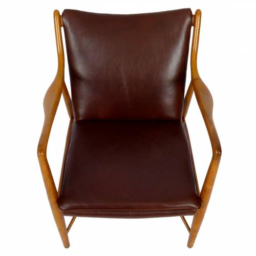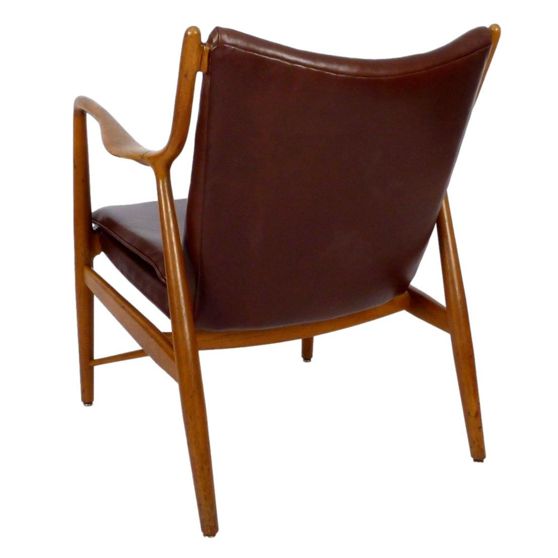 1950s NV45 walnut framed lounge chair with new leather upholstery by Finn Juhl for Baker Furniture.