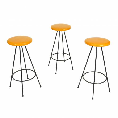 Set of three of wrought iron frame bar height stools with orange vinyl upholstery. Price is for the set.
