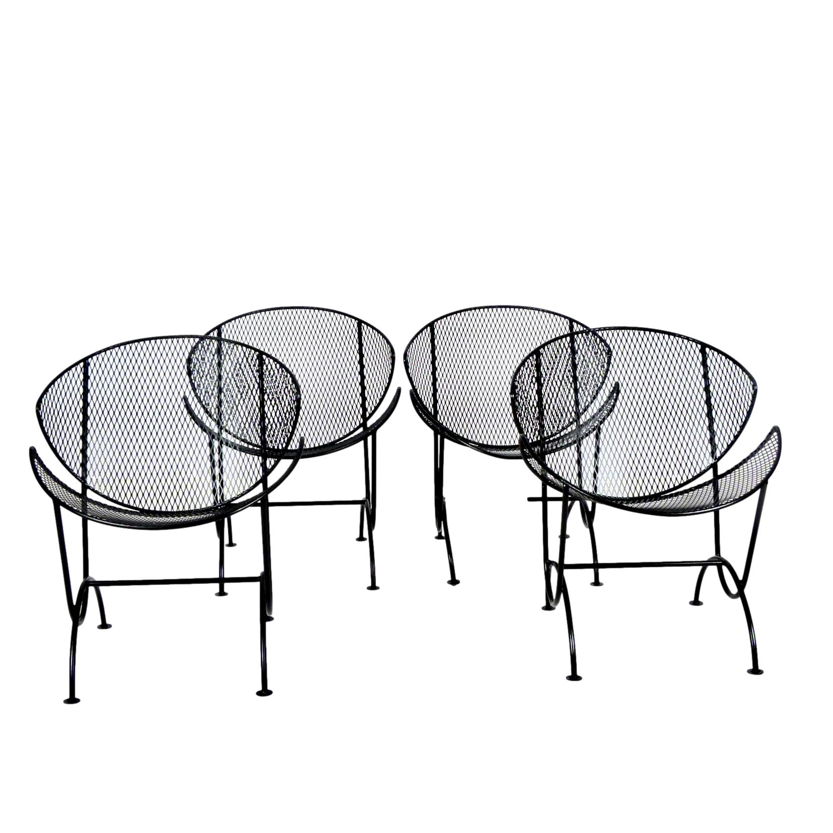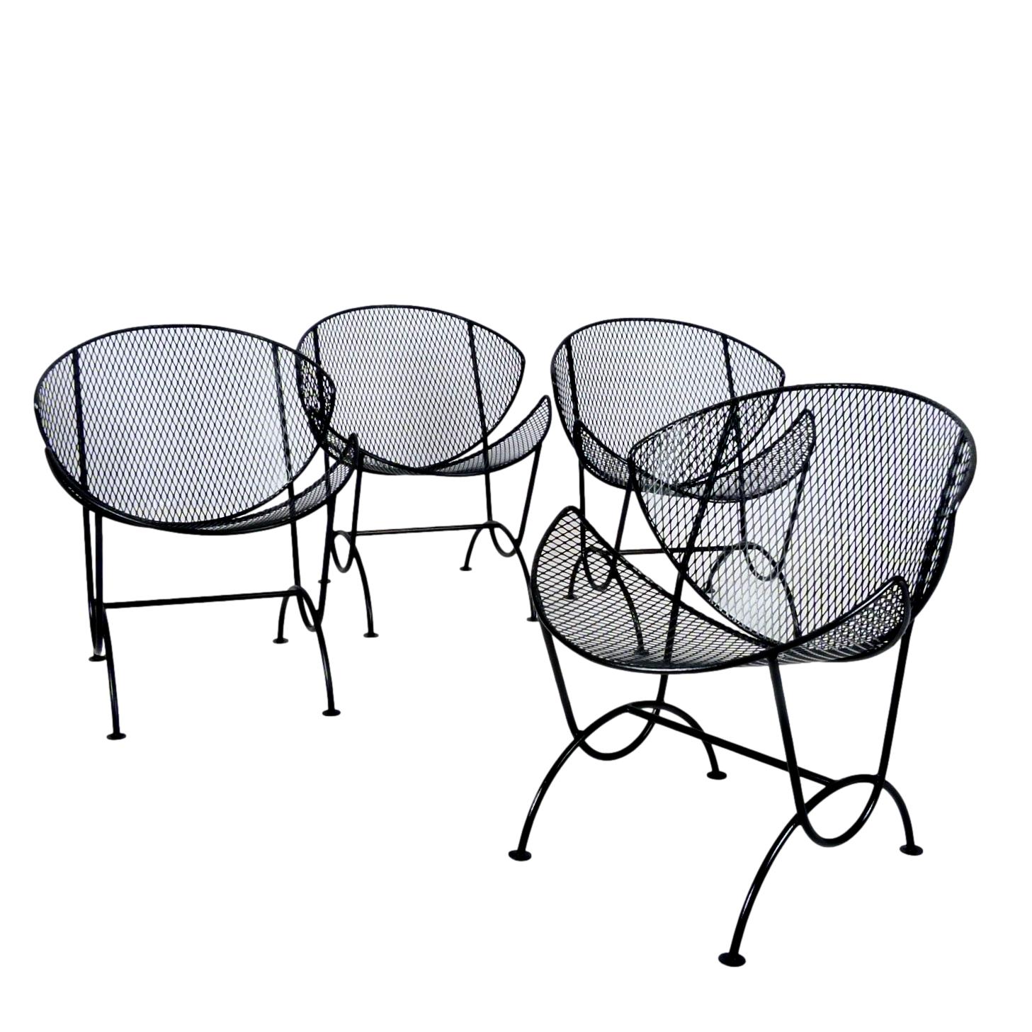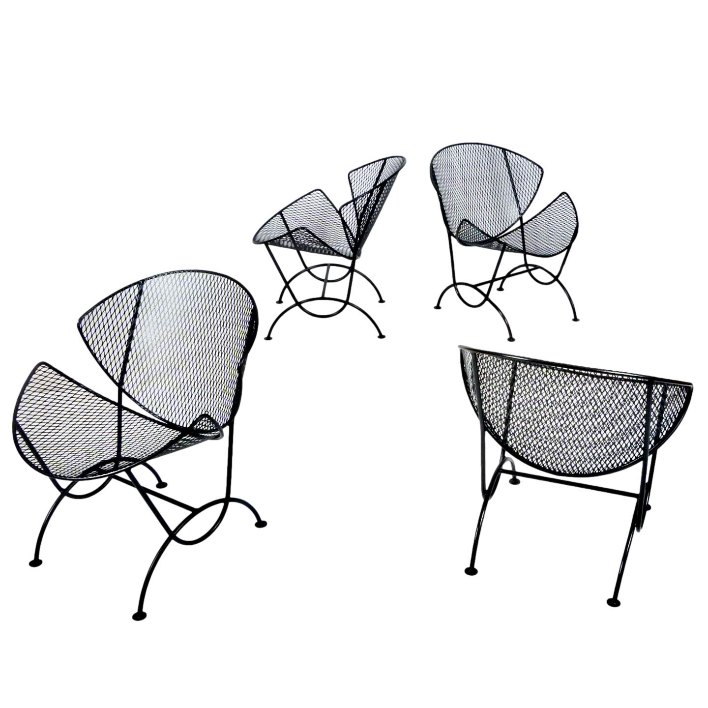 Set of 4 clam shell style chairs designed by Maurizio Tempestini for Salterini, Italy, 1950s. Wrought iron frames with mesh steel seat and back, restored with a new powder coat finish in black - perfect for outdoor use and very comfortable.