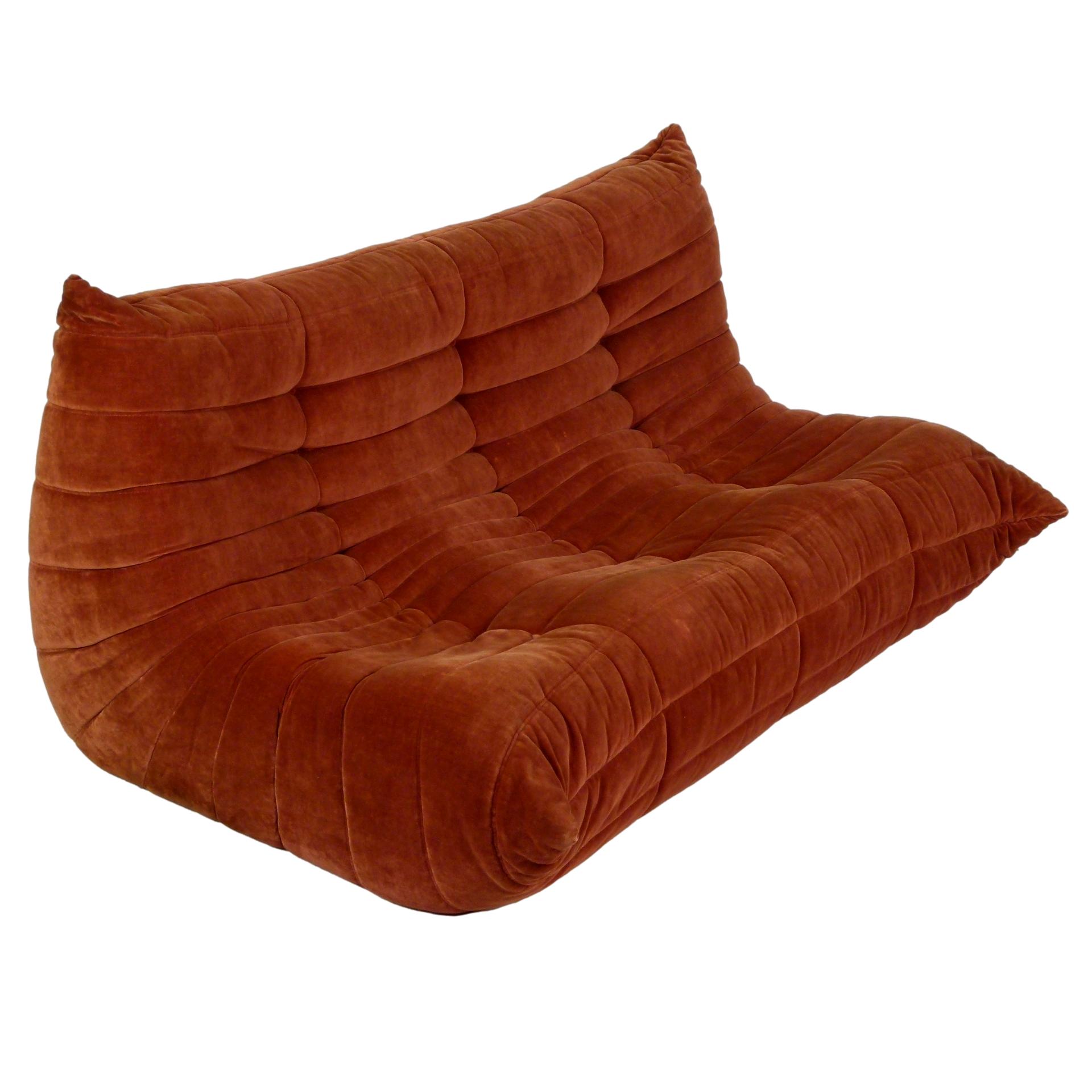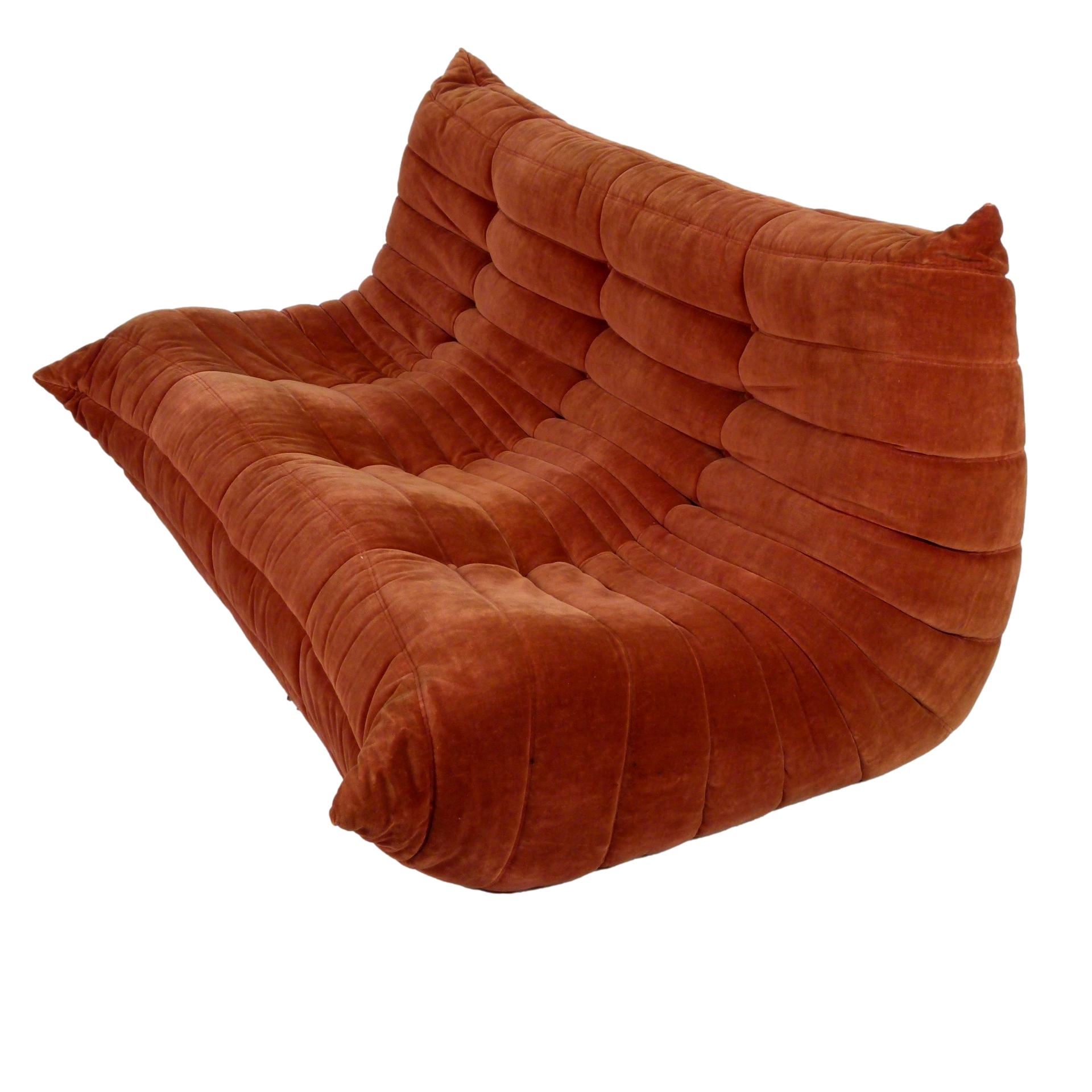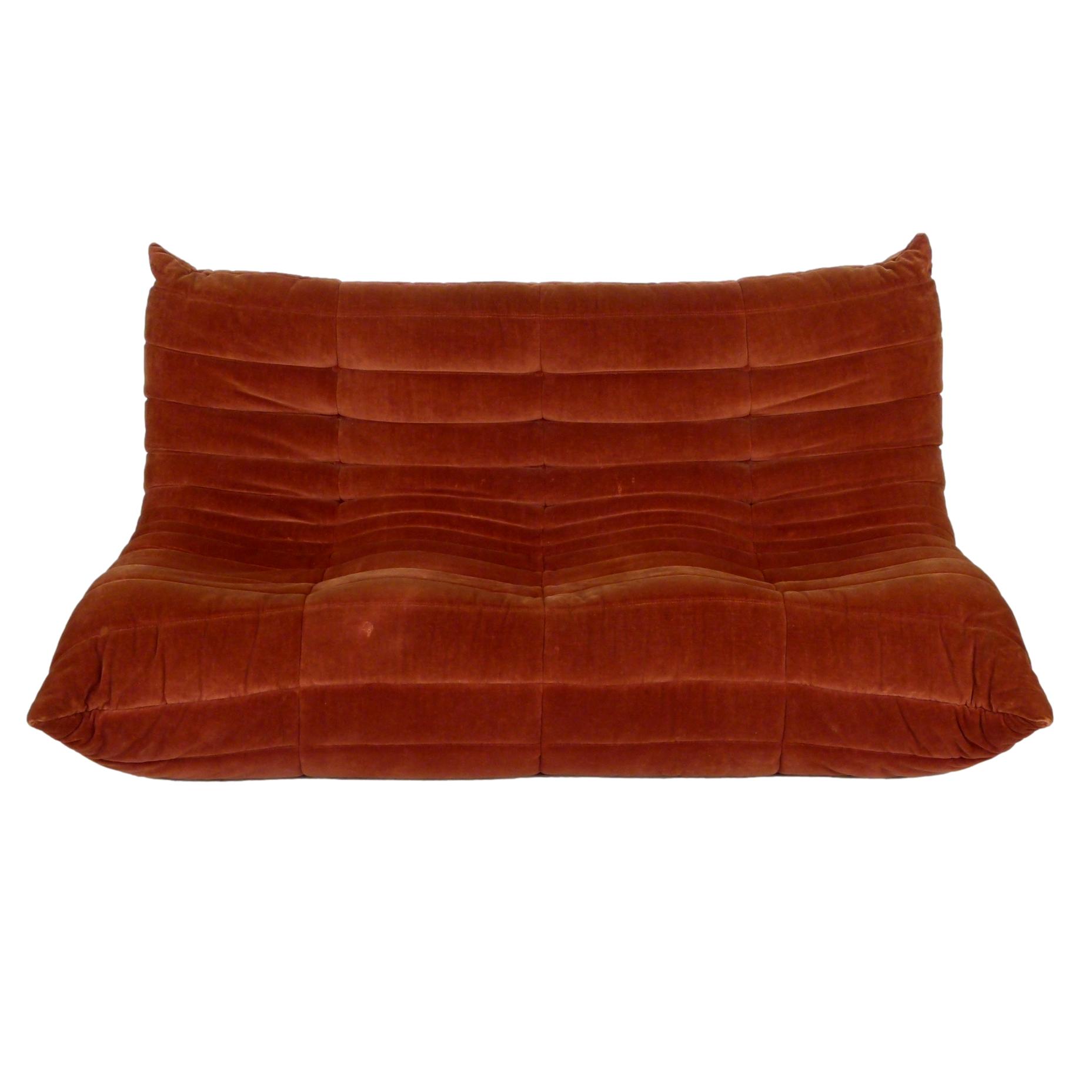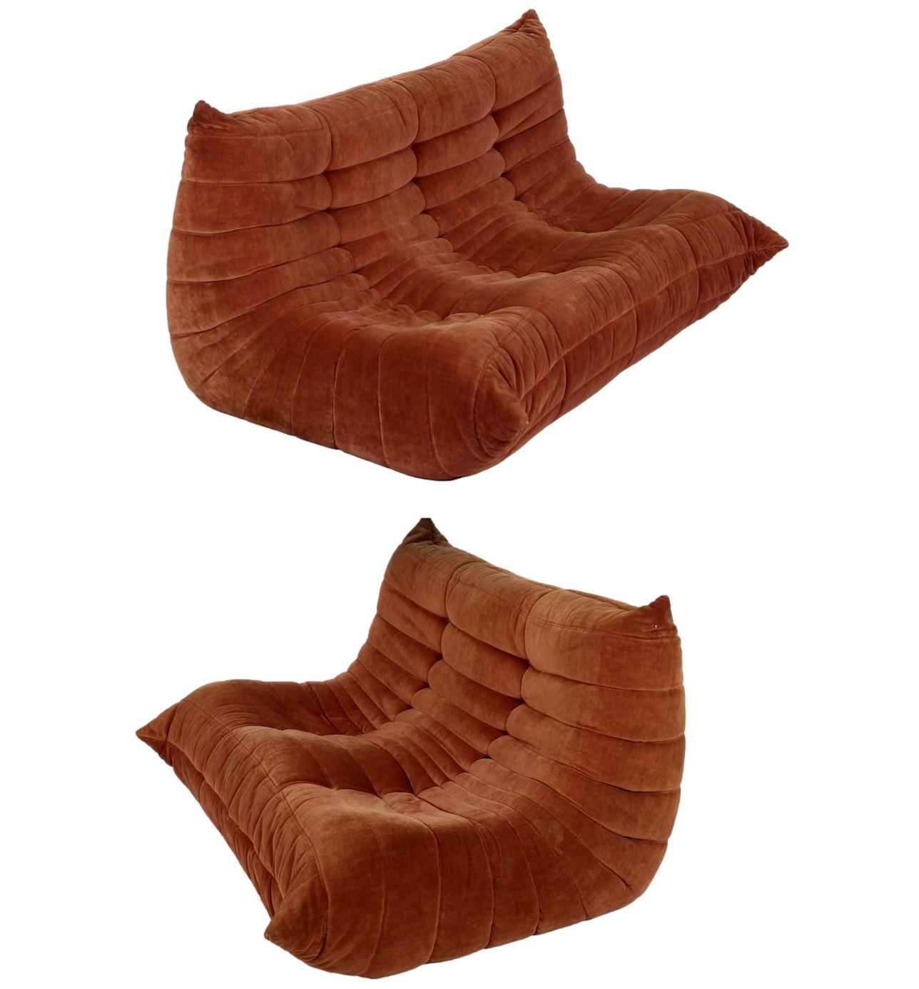 1980s "Togo" two and three seat sofa designed by Michel Ducaroy for Ligne Roset and made by Ameublements Belus, Canada. This set includes a two-seat loveseat and three-piece sofa in original rust colored velvet. Sold as a set.