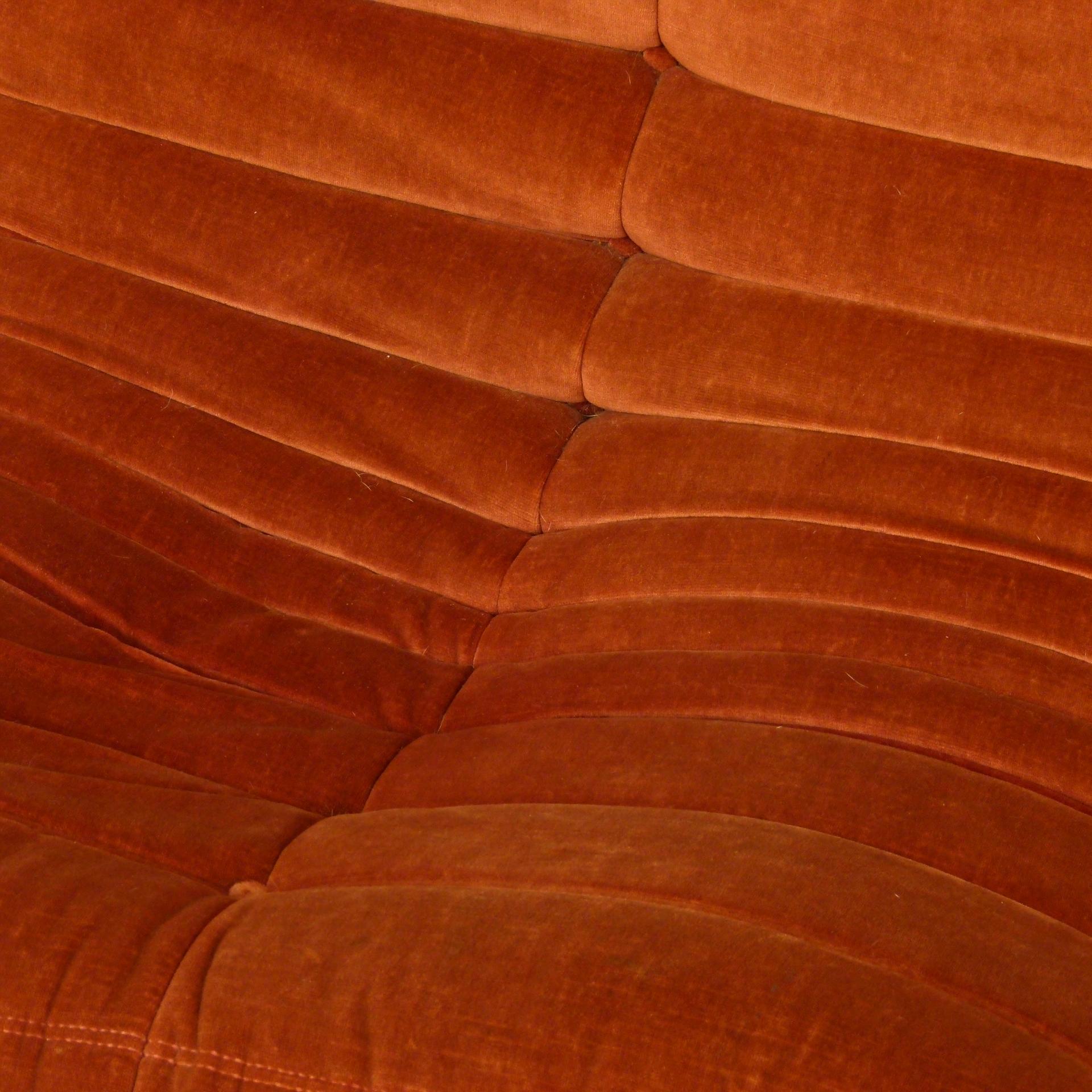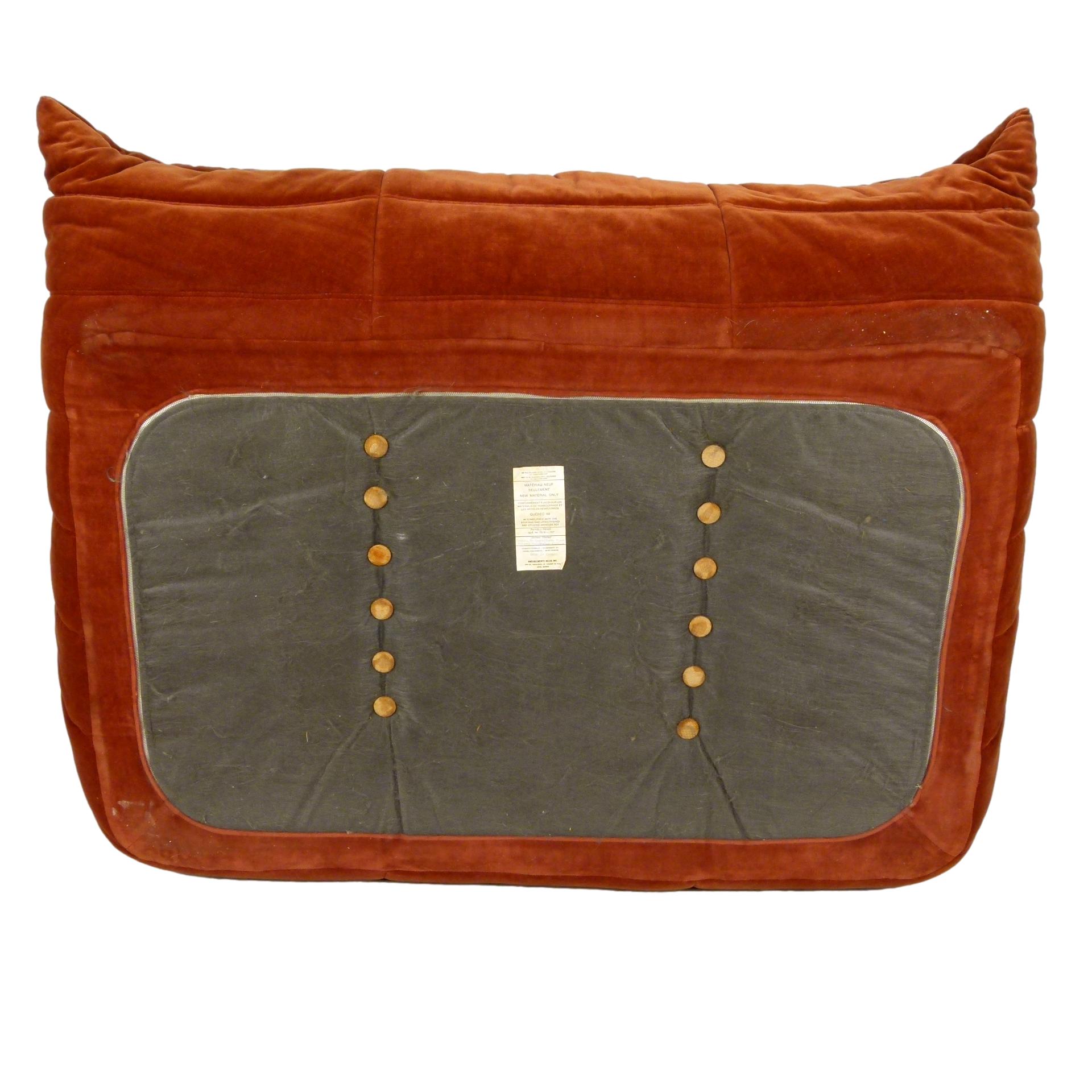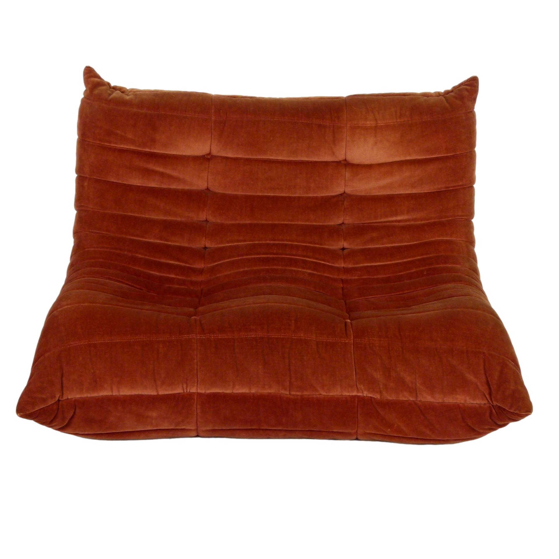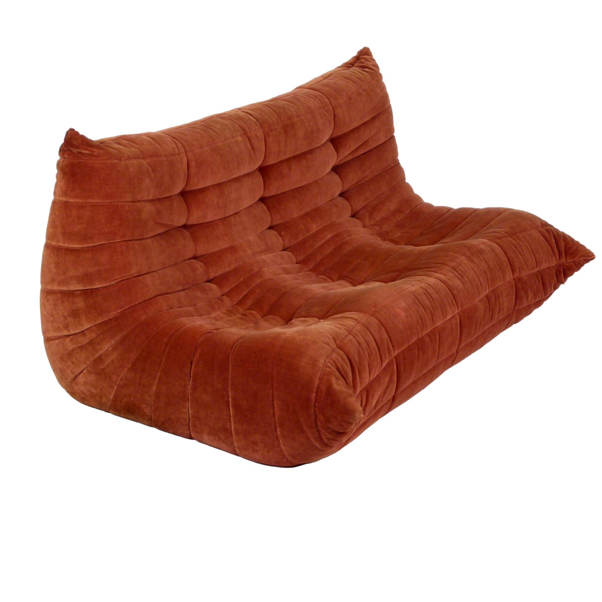 1980s "Togo" two and three seat sofa designed by Michel Ducaroy for Ligne Roset and made by Ameublements Belus, Canada. This set includes a two-seat loveseat and three-piece sofa in original rust colored velvet. Sold as a set.
