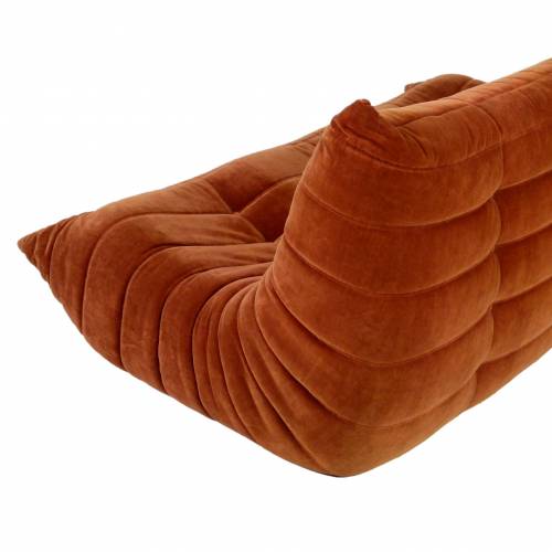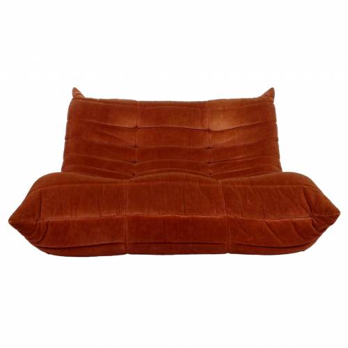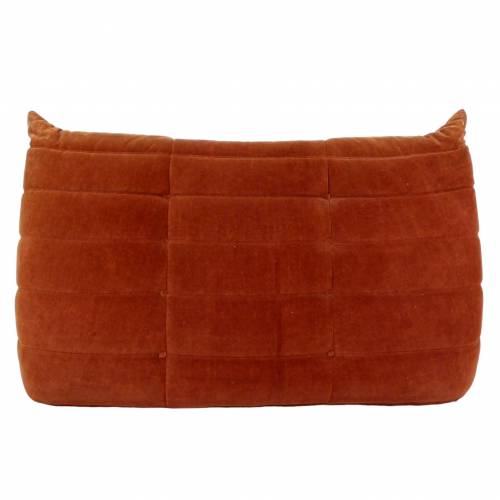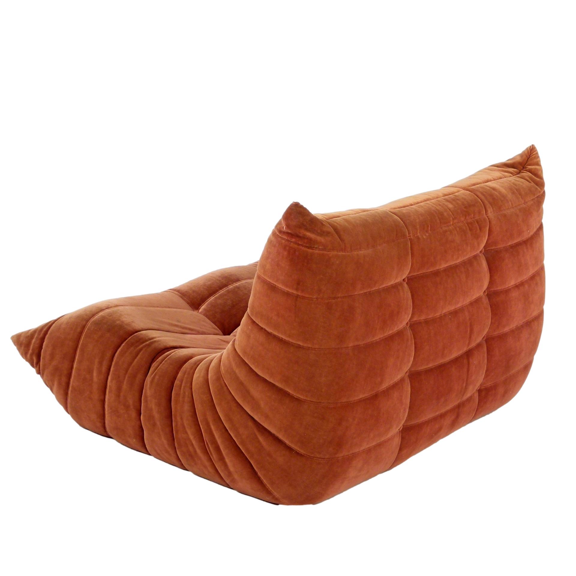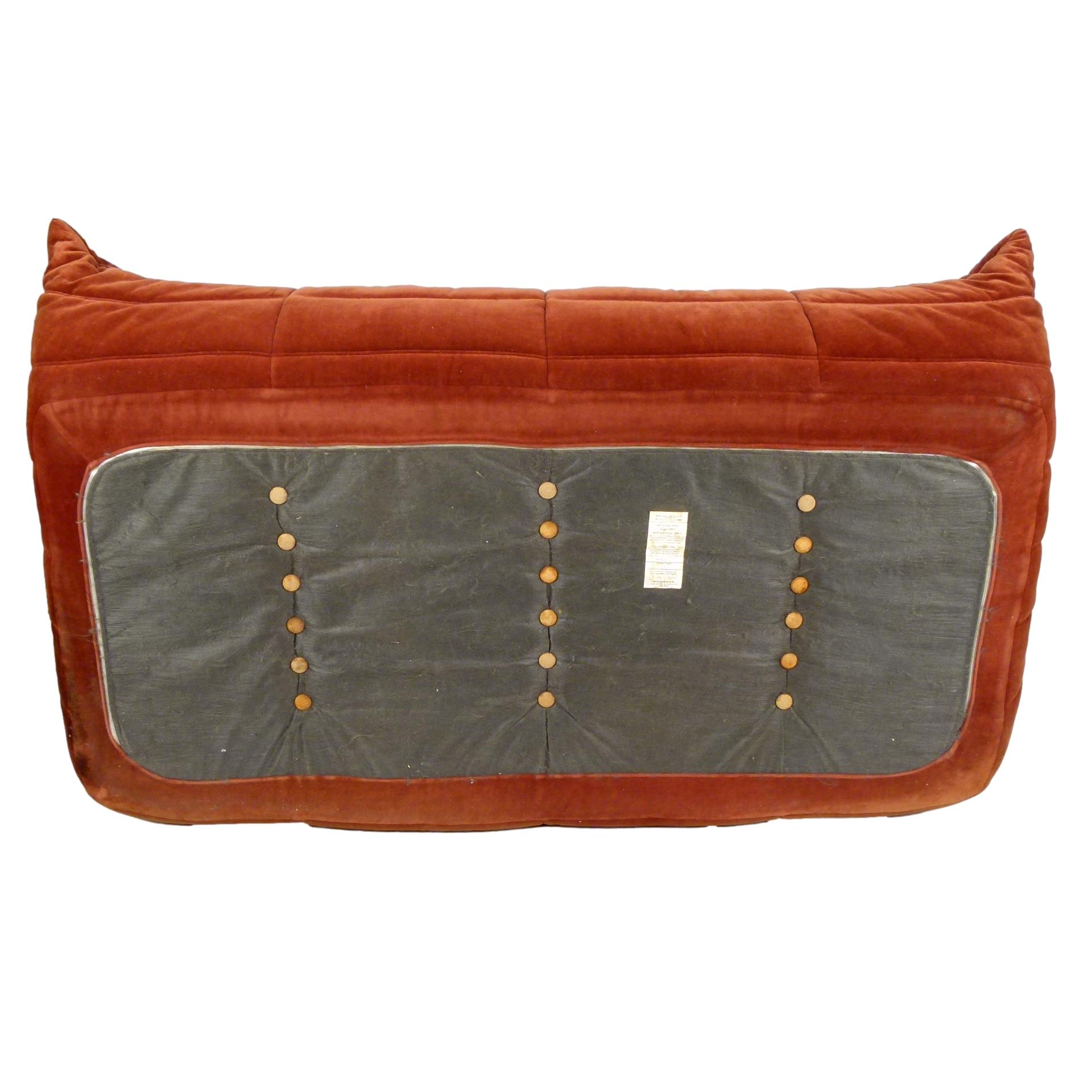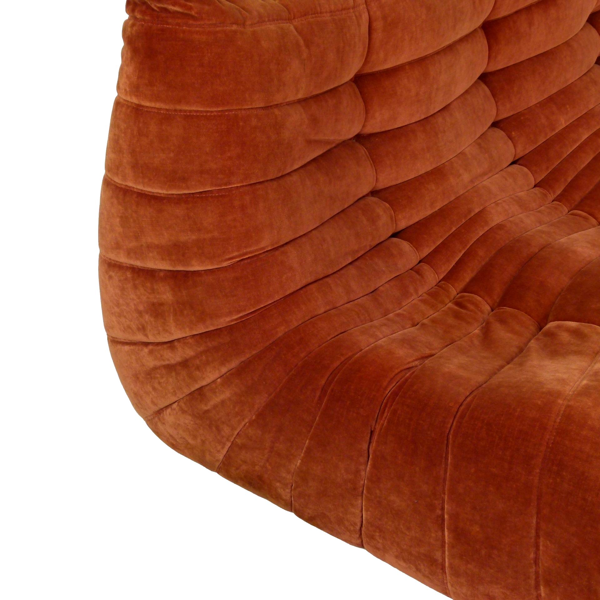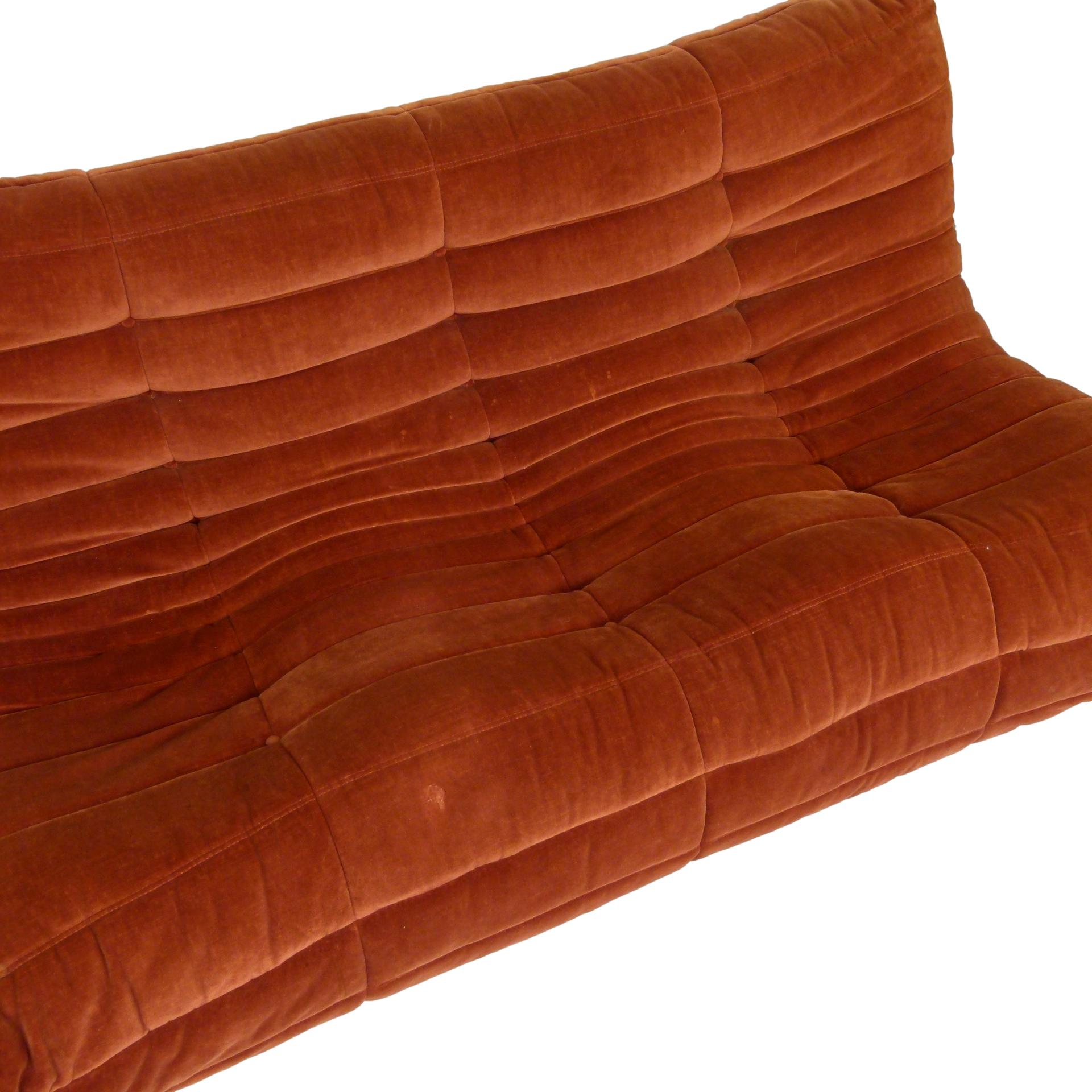 1980s "Togo" two and three seat sofa designed by Michel Ducaroy for Ligne Roset and made by Ameublements Belus, Canada. This set includes a two-seat loveseat and three-piece sofa in original rust colored velvet. Sold as a set.