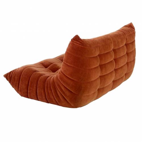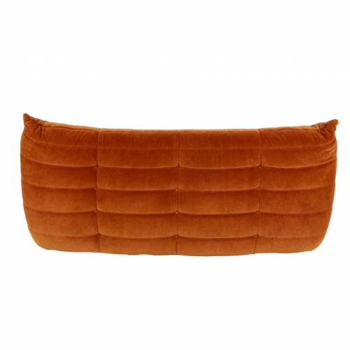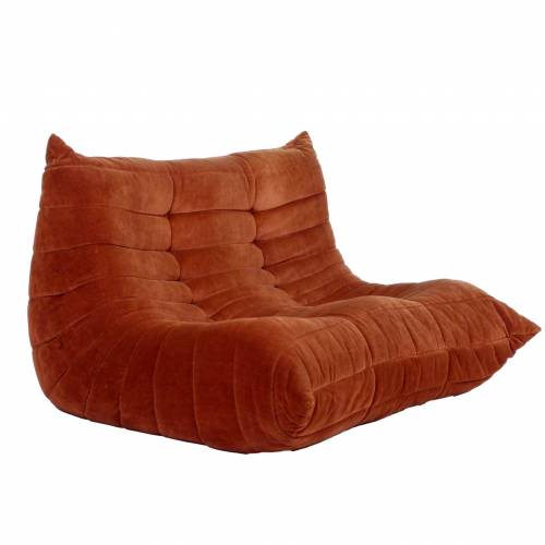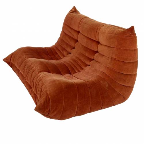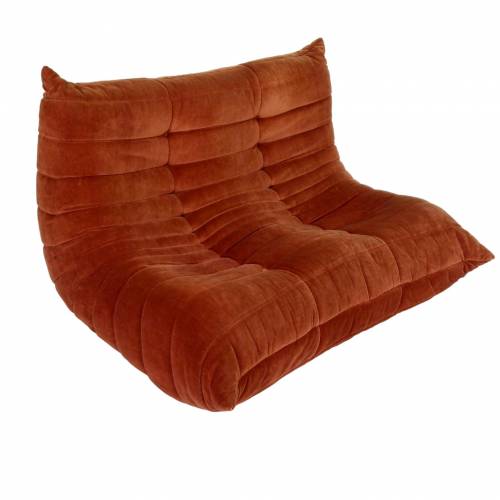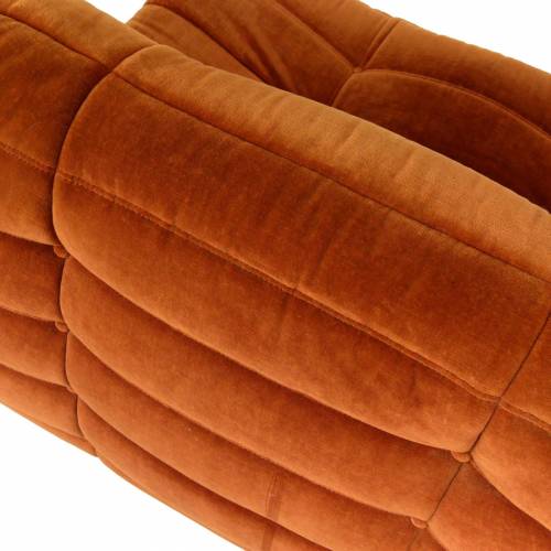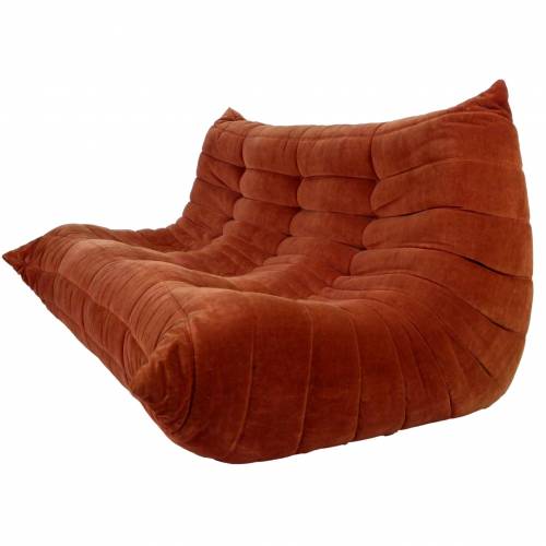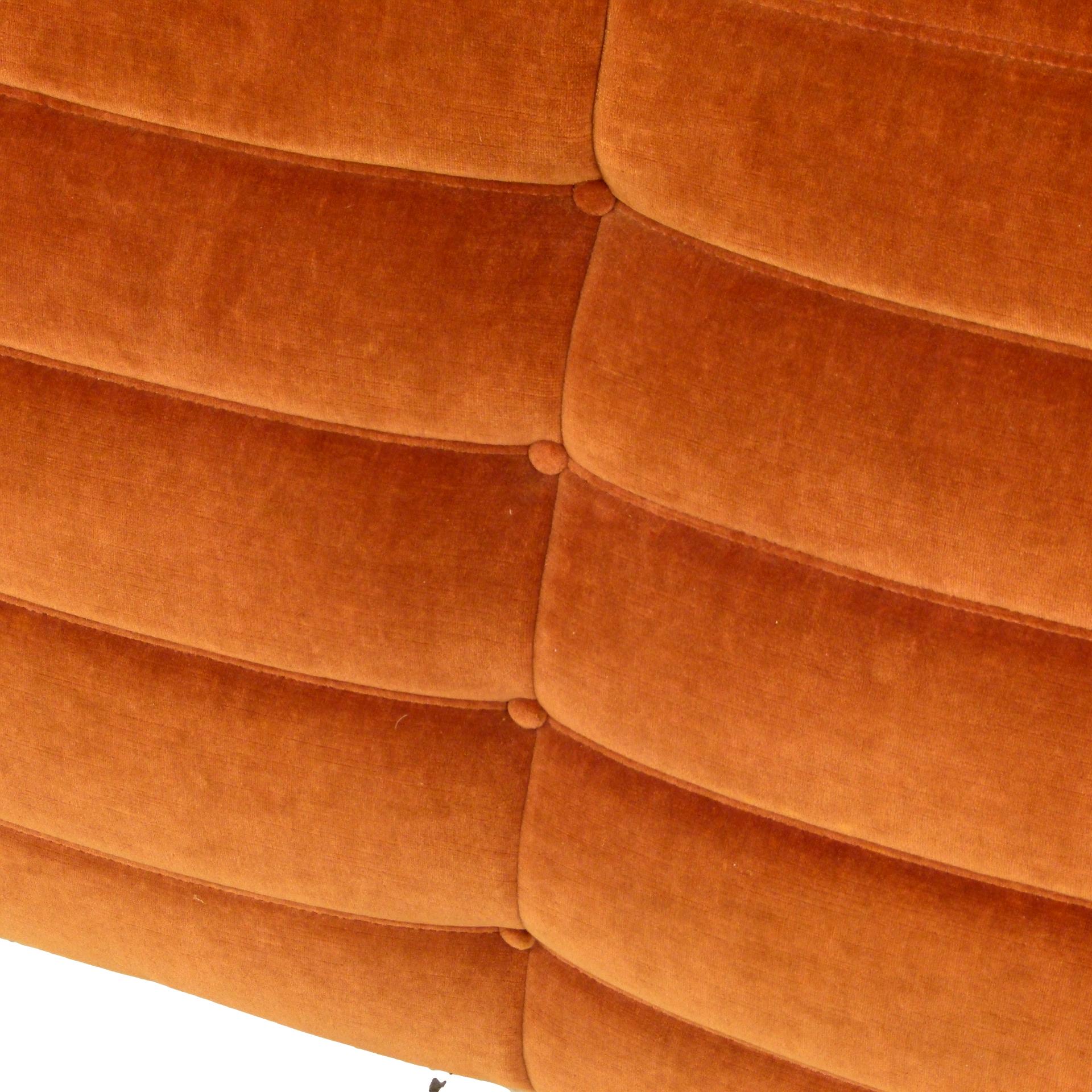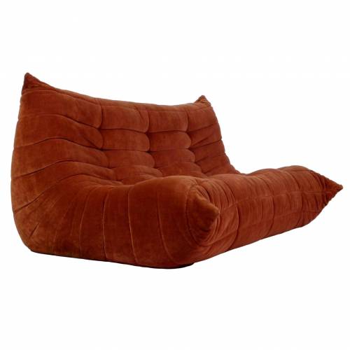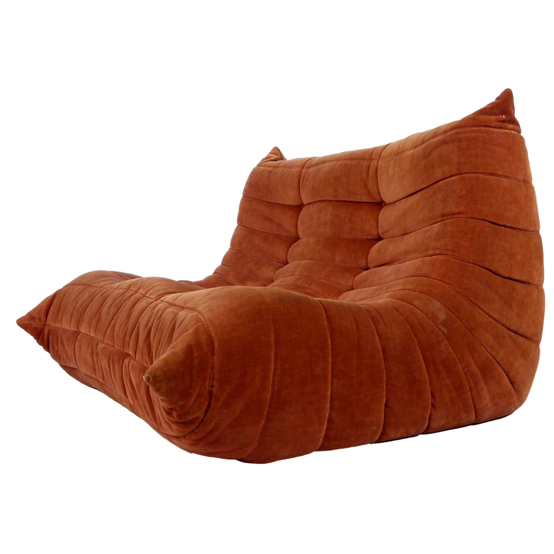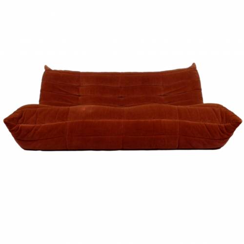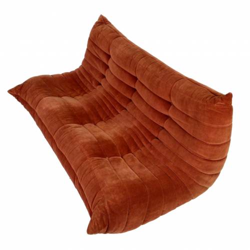 1980s "Togo" two and three seat sofa designed by Michel Ducaroy for Ligne Roset and made by Ameublements Belus, Canada. This set includes a two-seat loveseat and three-piece sofa in original rust colored velvet. Sold as a set.