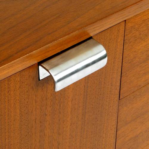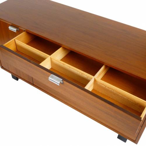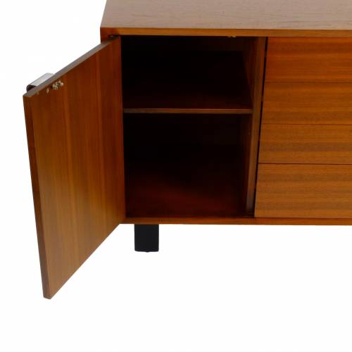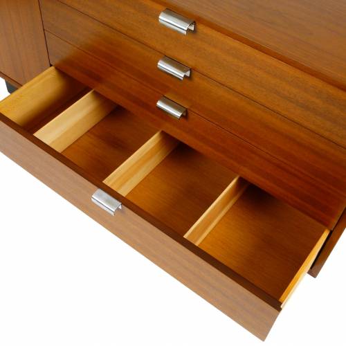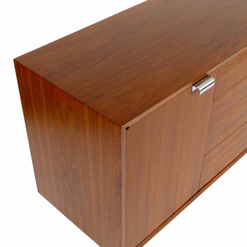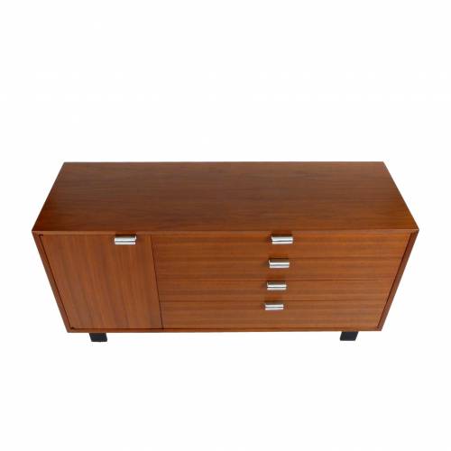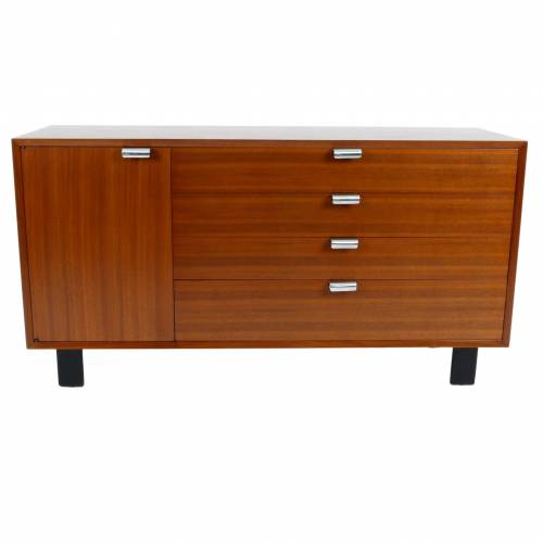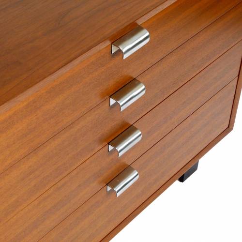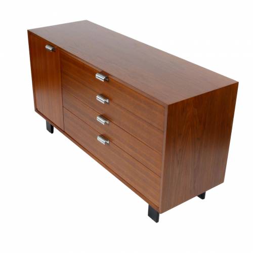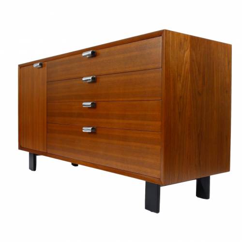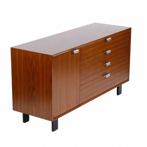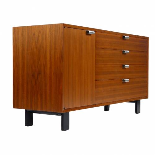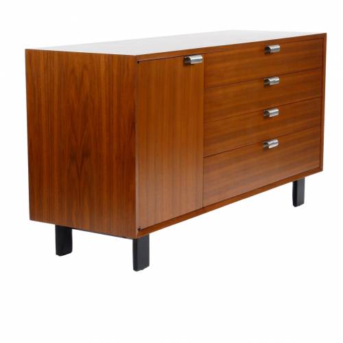1950s George Nelson "BCS (Basic Cabinet Series)" dresser in walnut with silver pulls. Features open storage with an adjustable shelf behind a single door and four drawers.