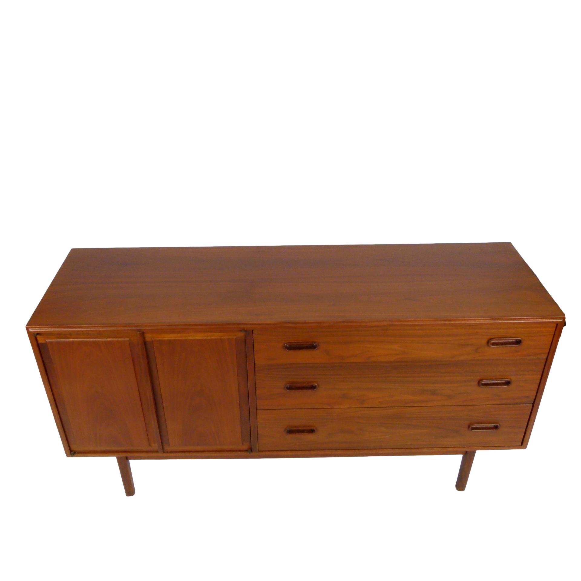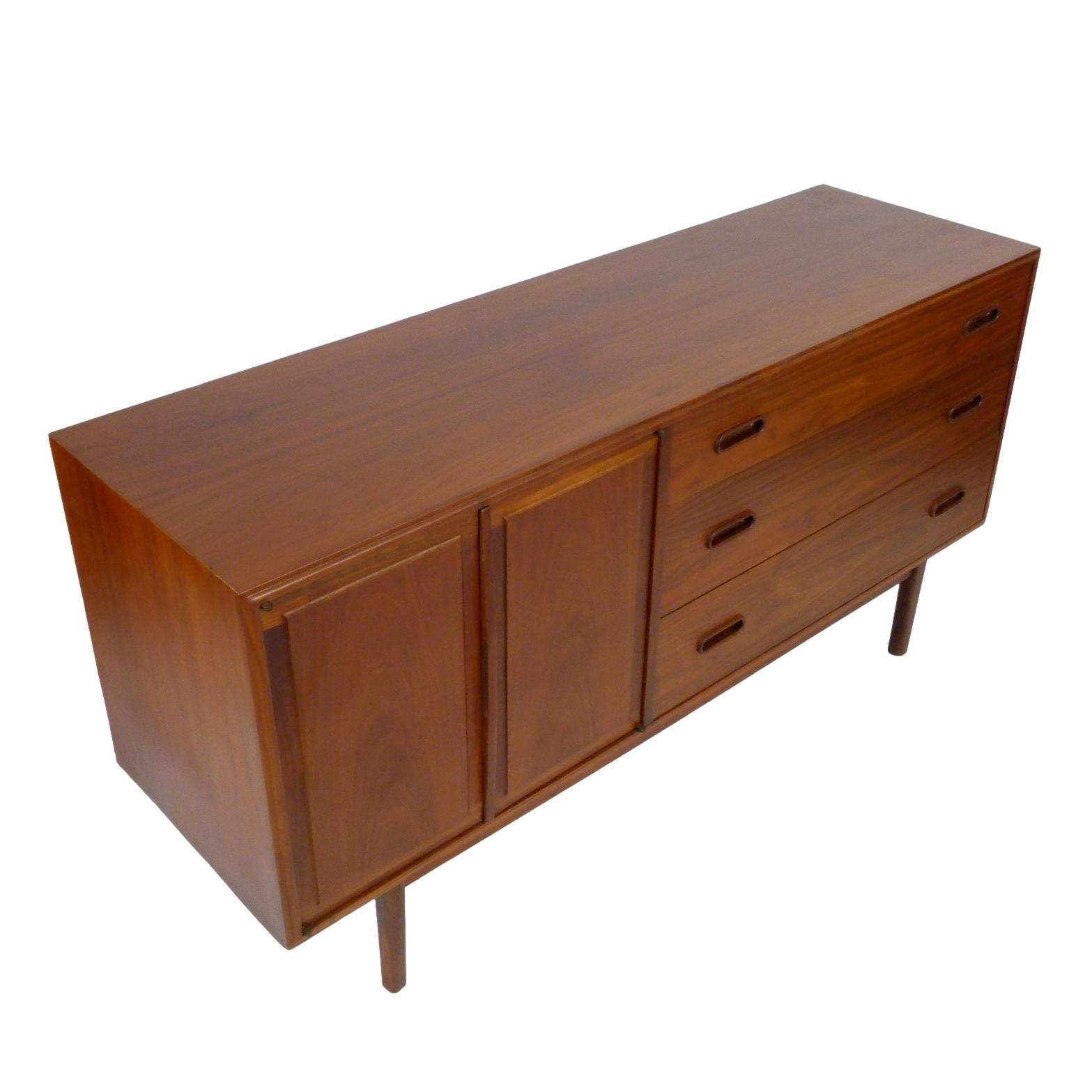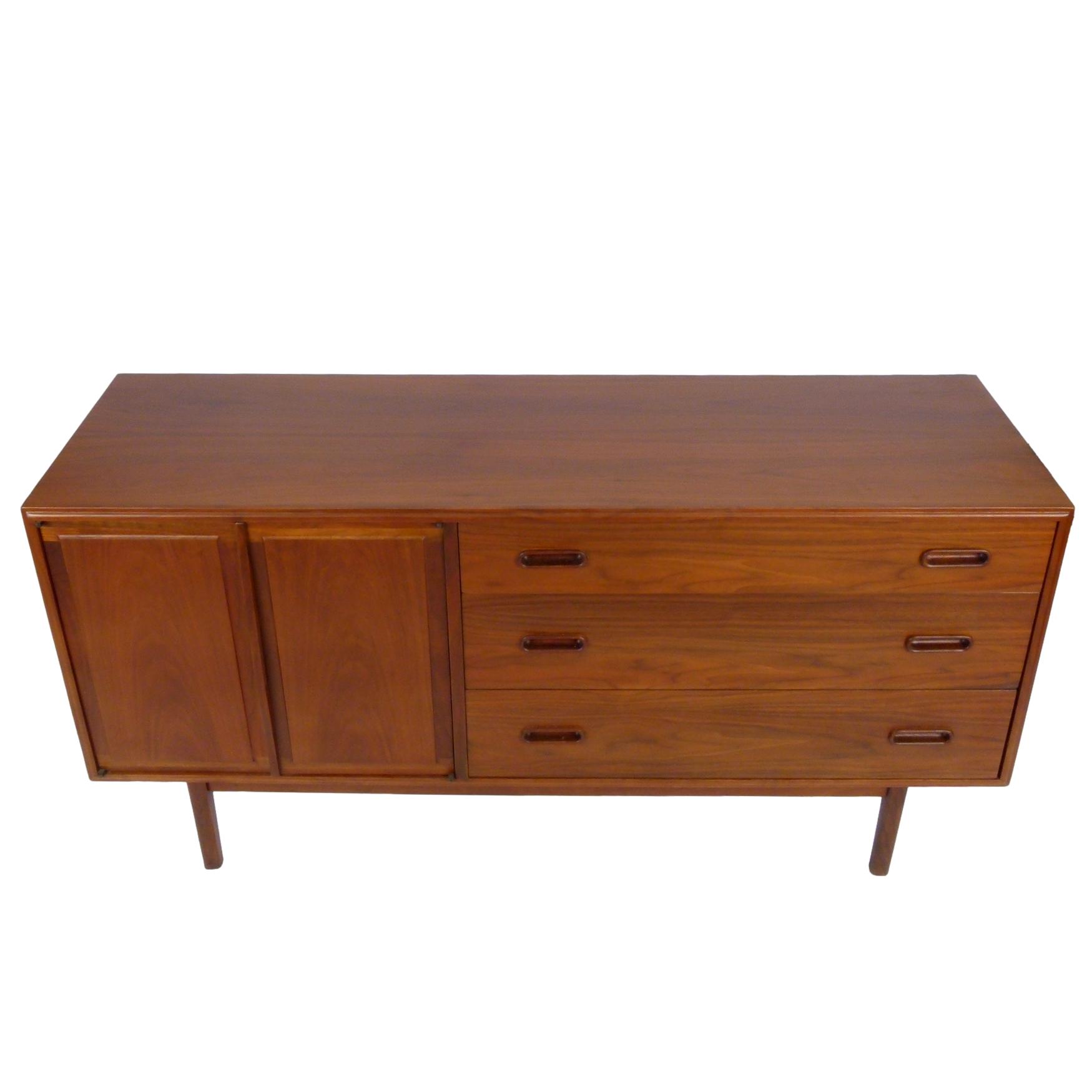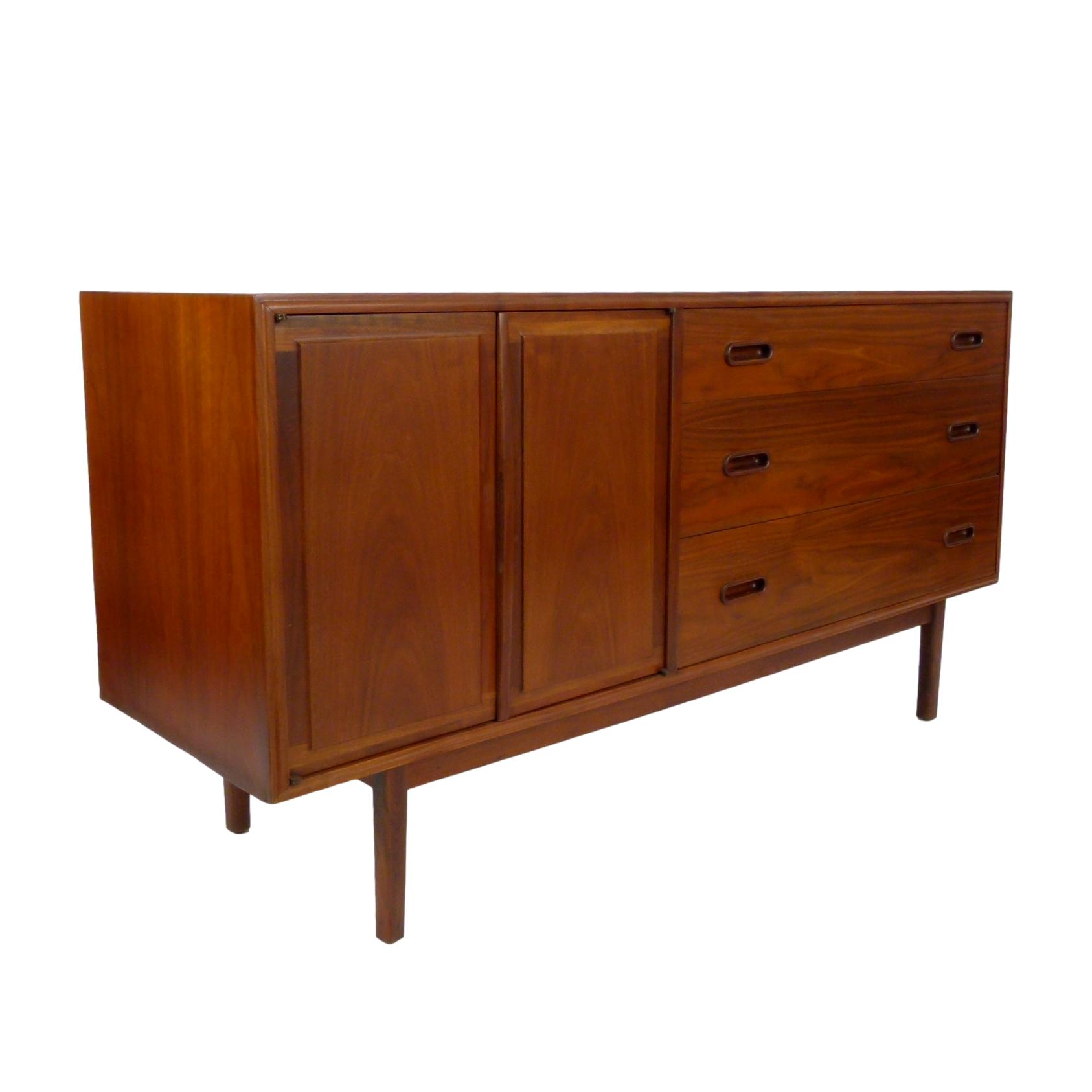1960s walnut, 3 drawer credenza by Jack Cartwright for Founders. 3 deep drawers on the right and 1 adjustable height shelf behind double doors on left.