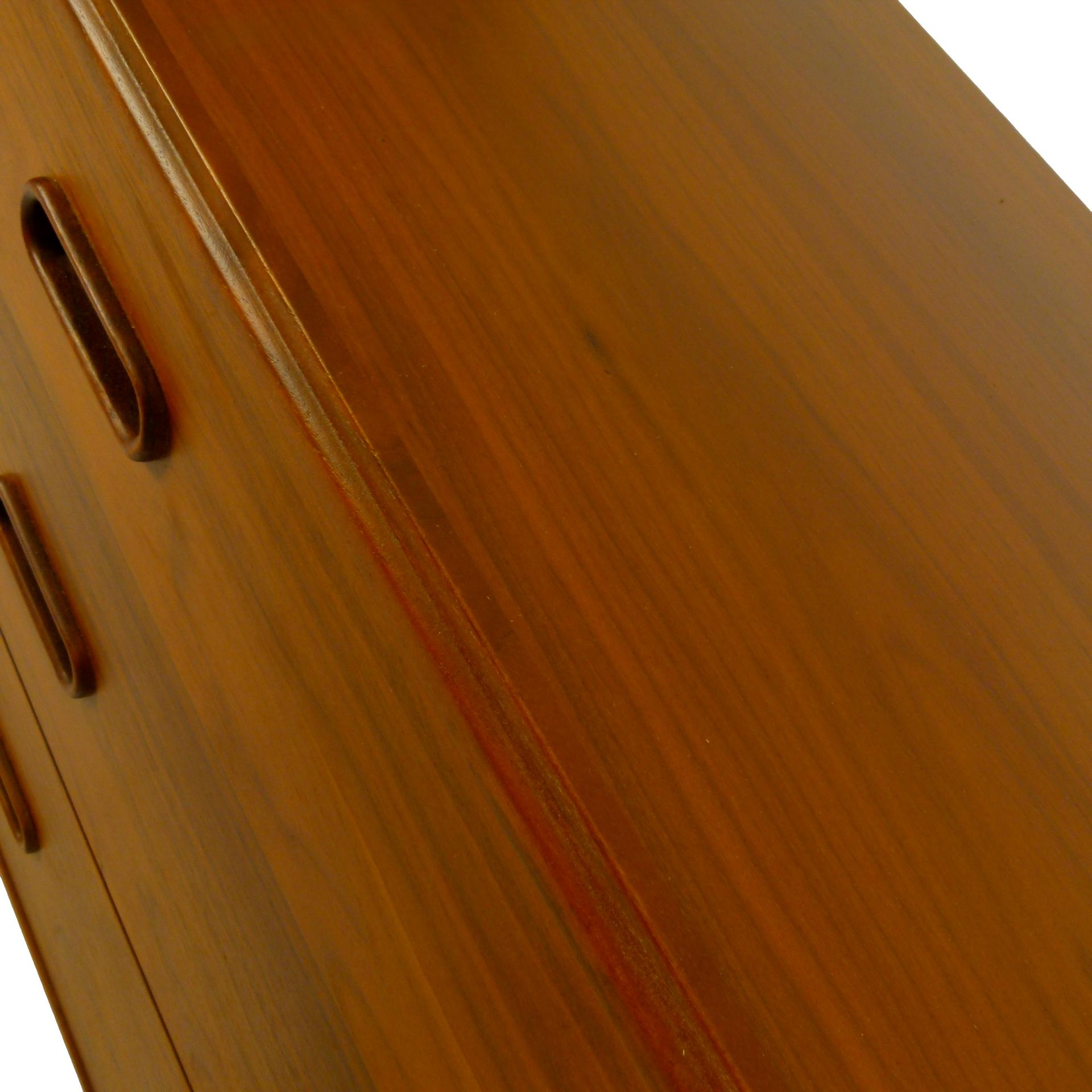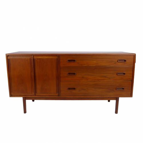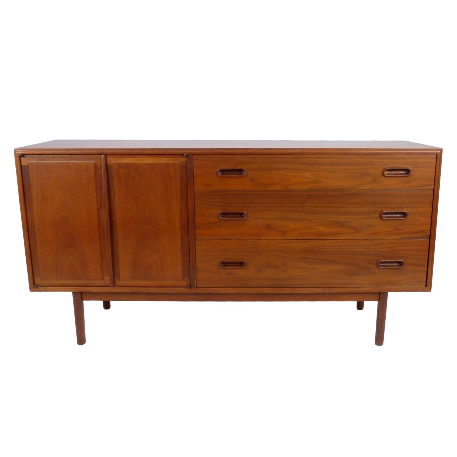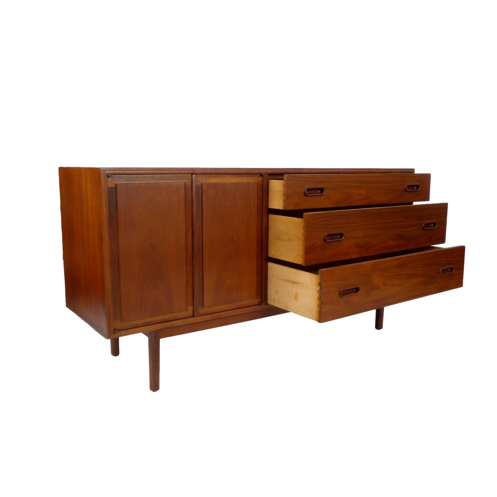 1960s walnut, 3 drawer credenza by Jack Cartwright for Founders. 3 deep drawers on the right and 1 adjustable height shelf behind double doors on left.