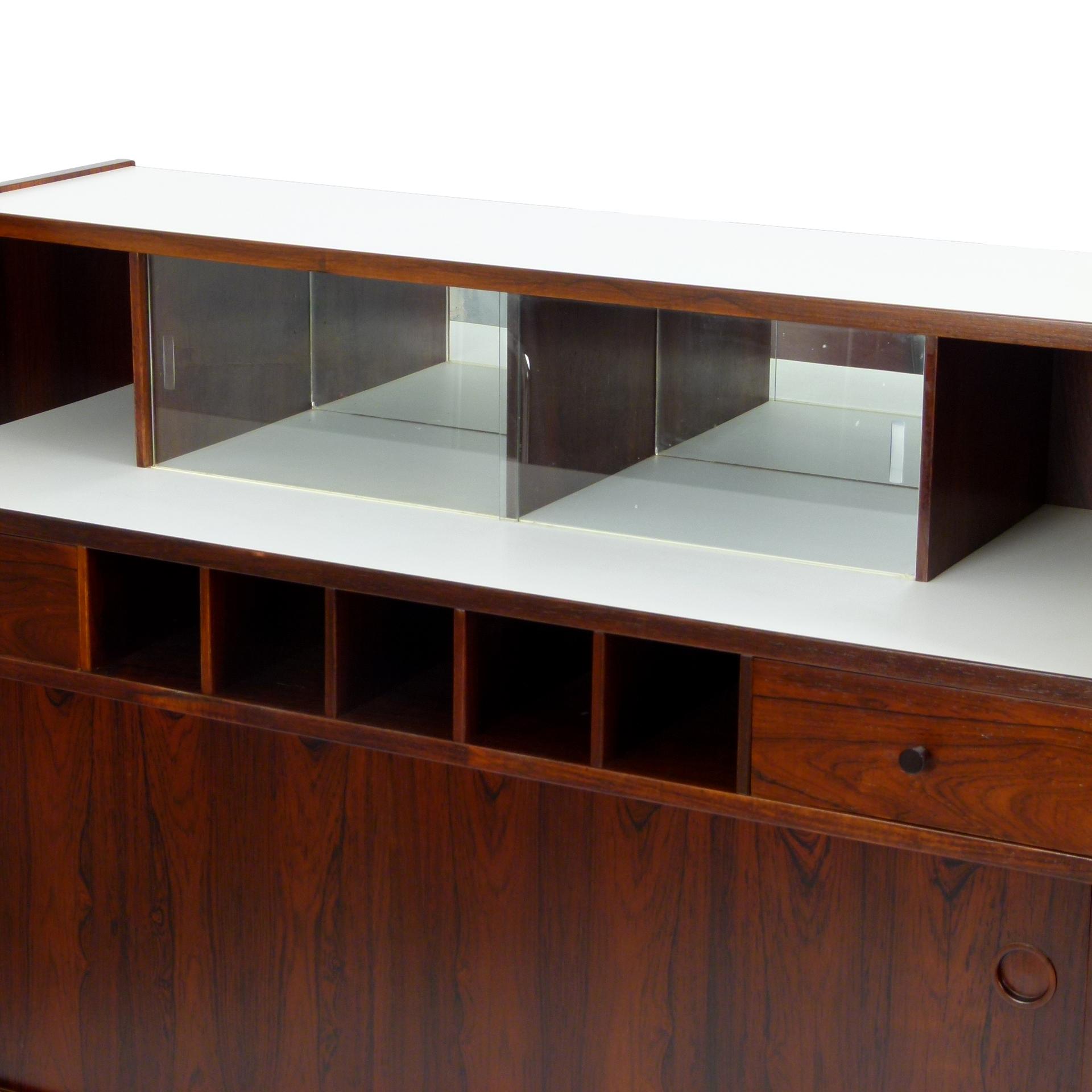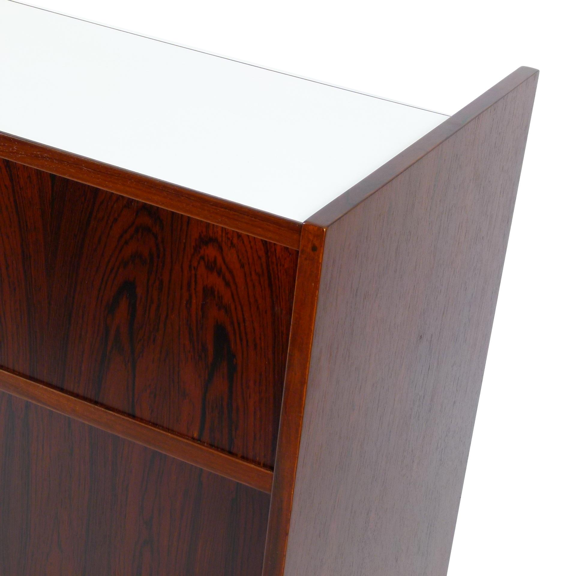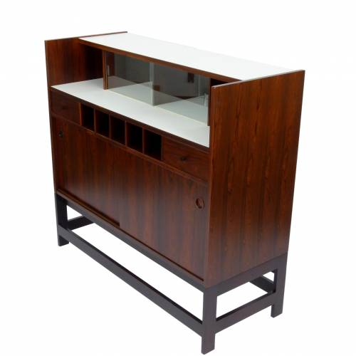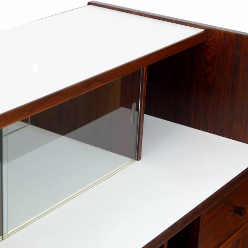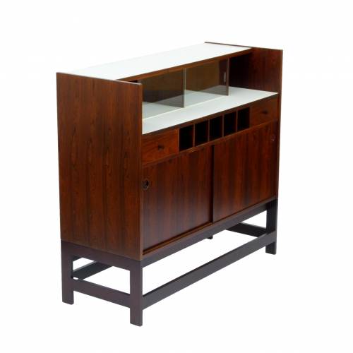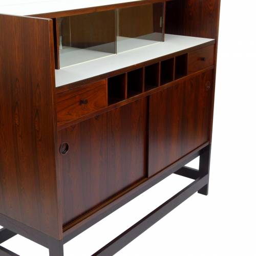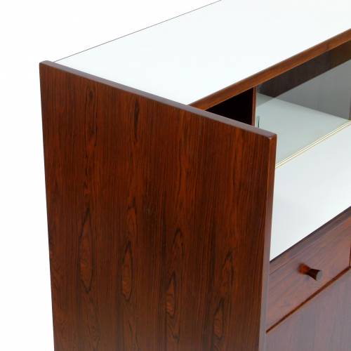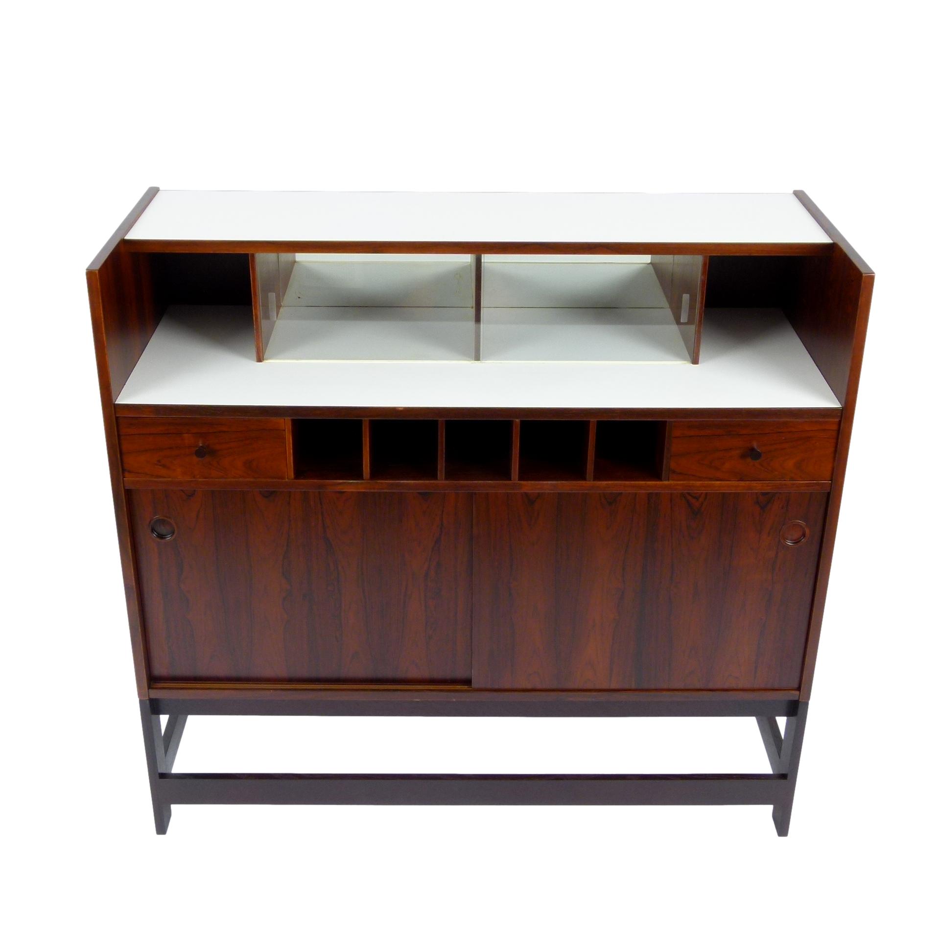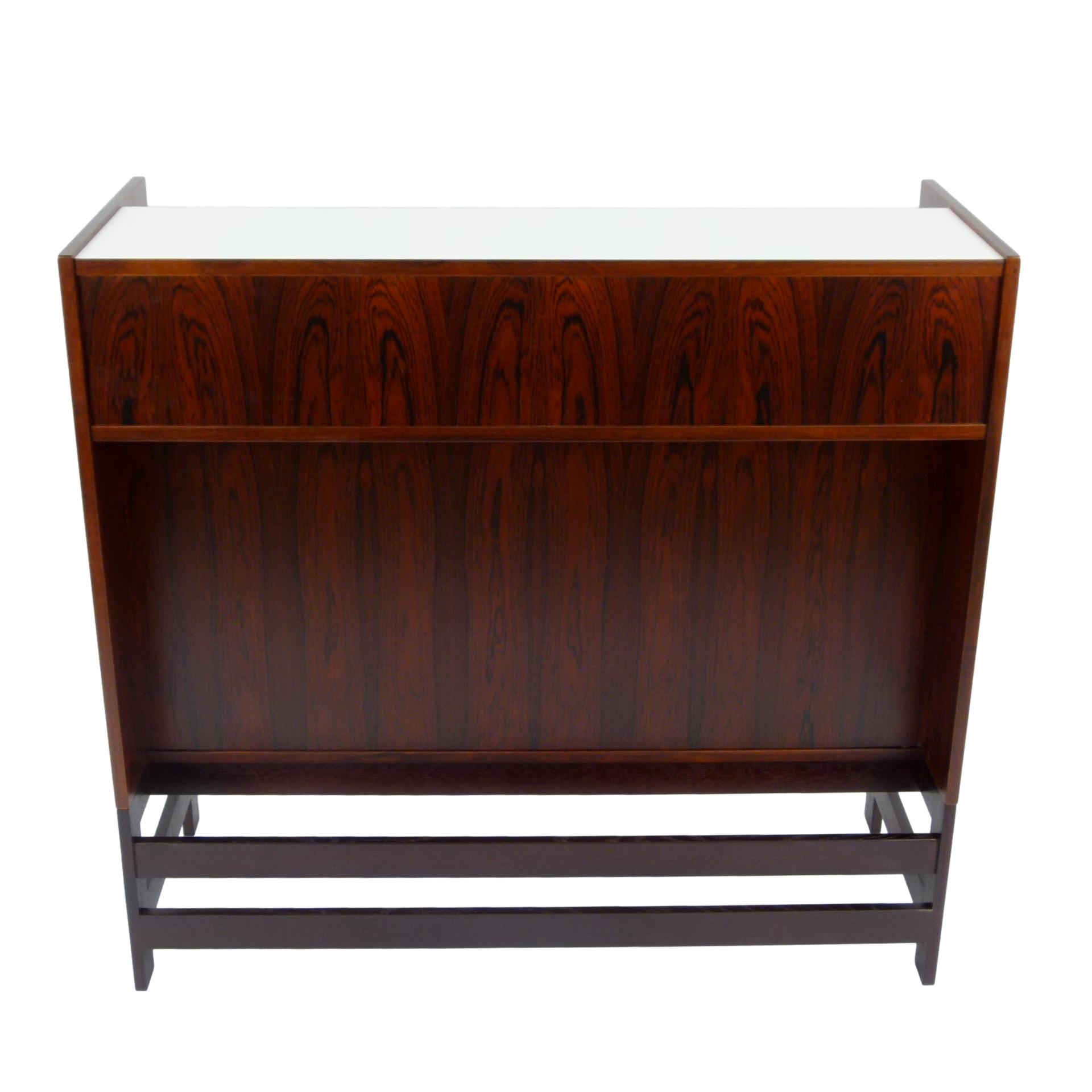 1960s rosewood bar from Norway. Rich rosewood graining with white laminate surfaces, bottle + glass storage, and open storage behind sliding doors.