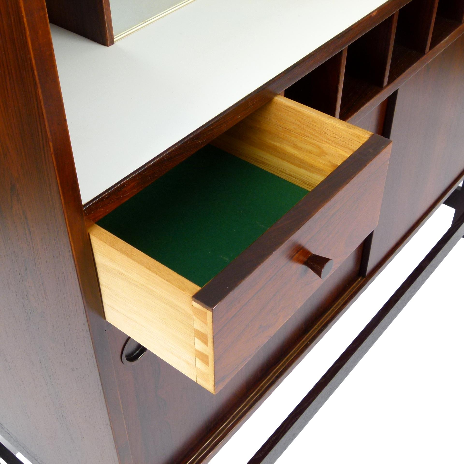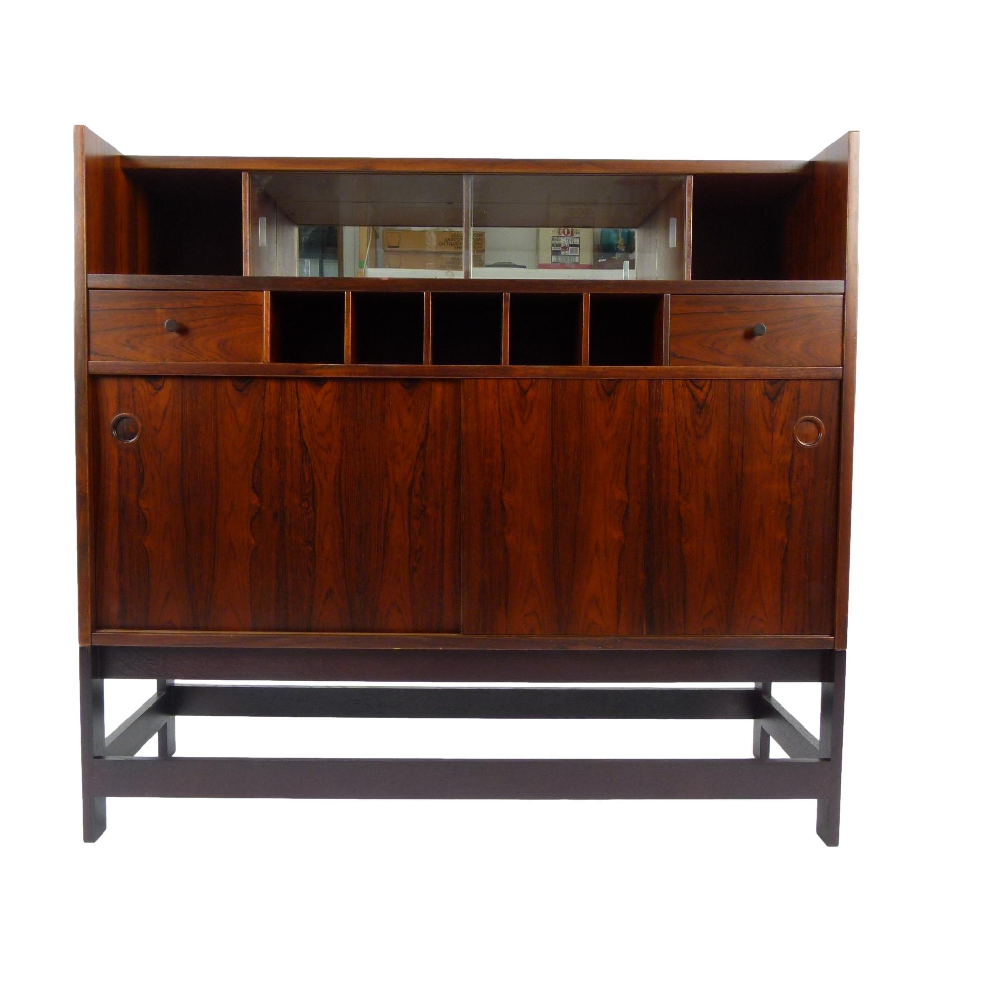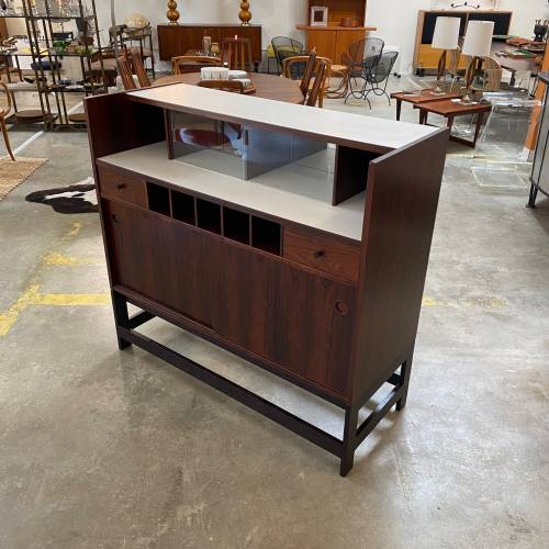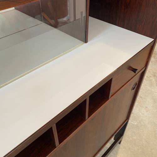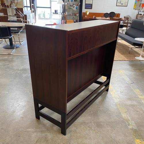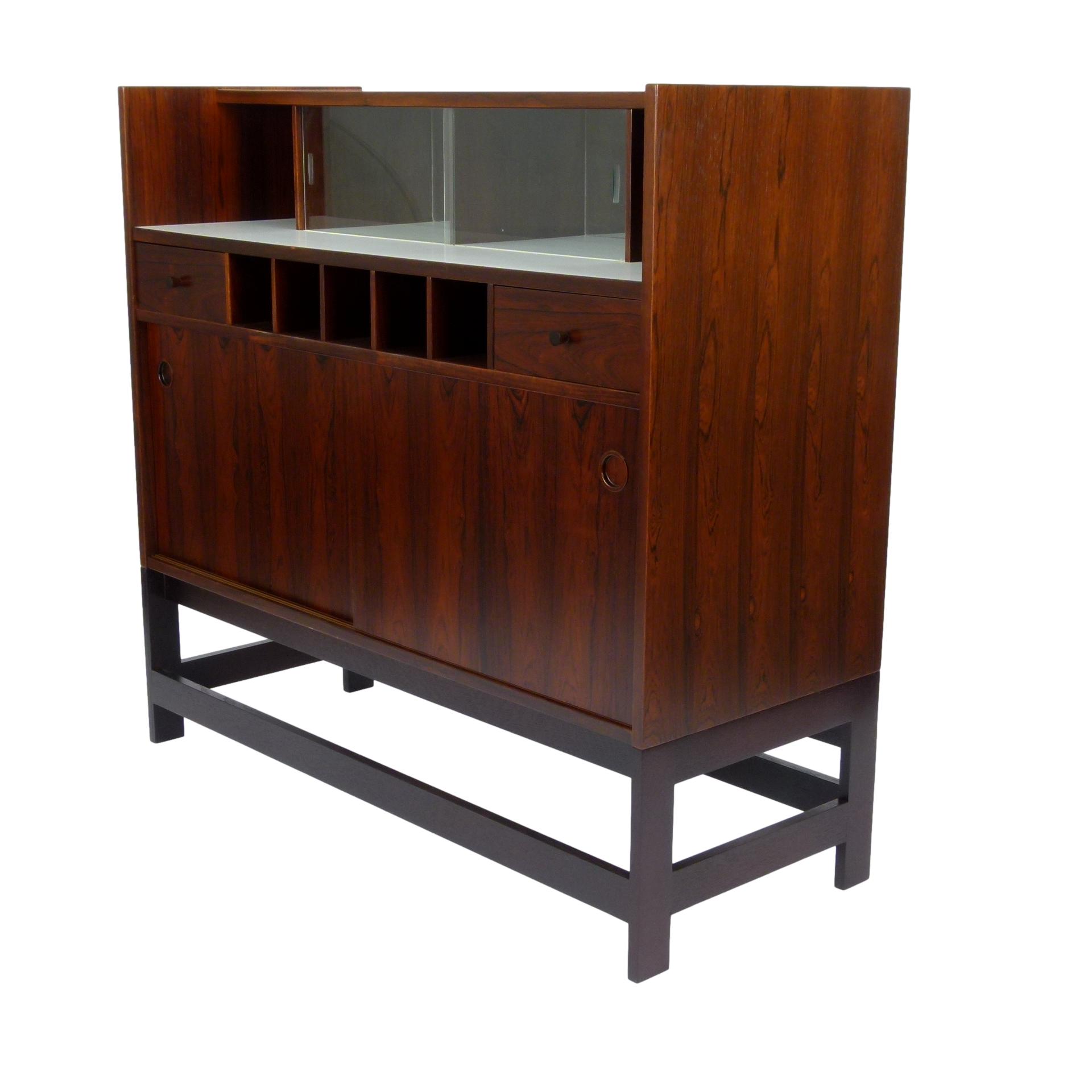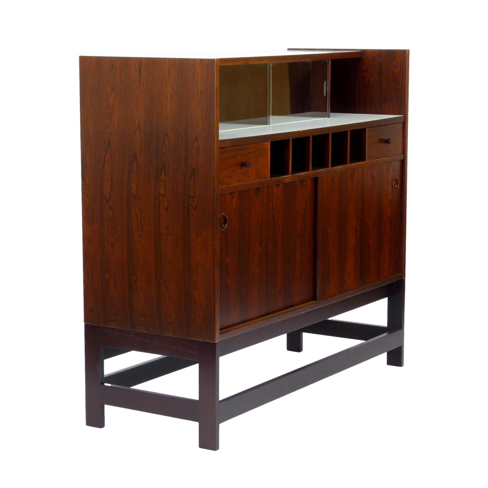 1960s rosewood bar from Norway. Rich rosewood graining with white laminate surfaces, bottle + glass storage, and open storage behind sliding doors.