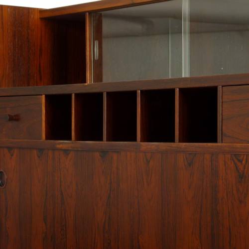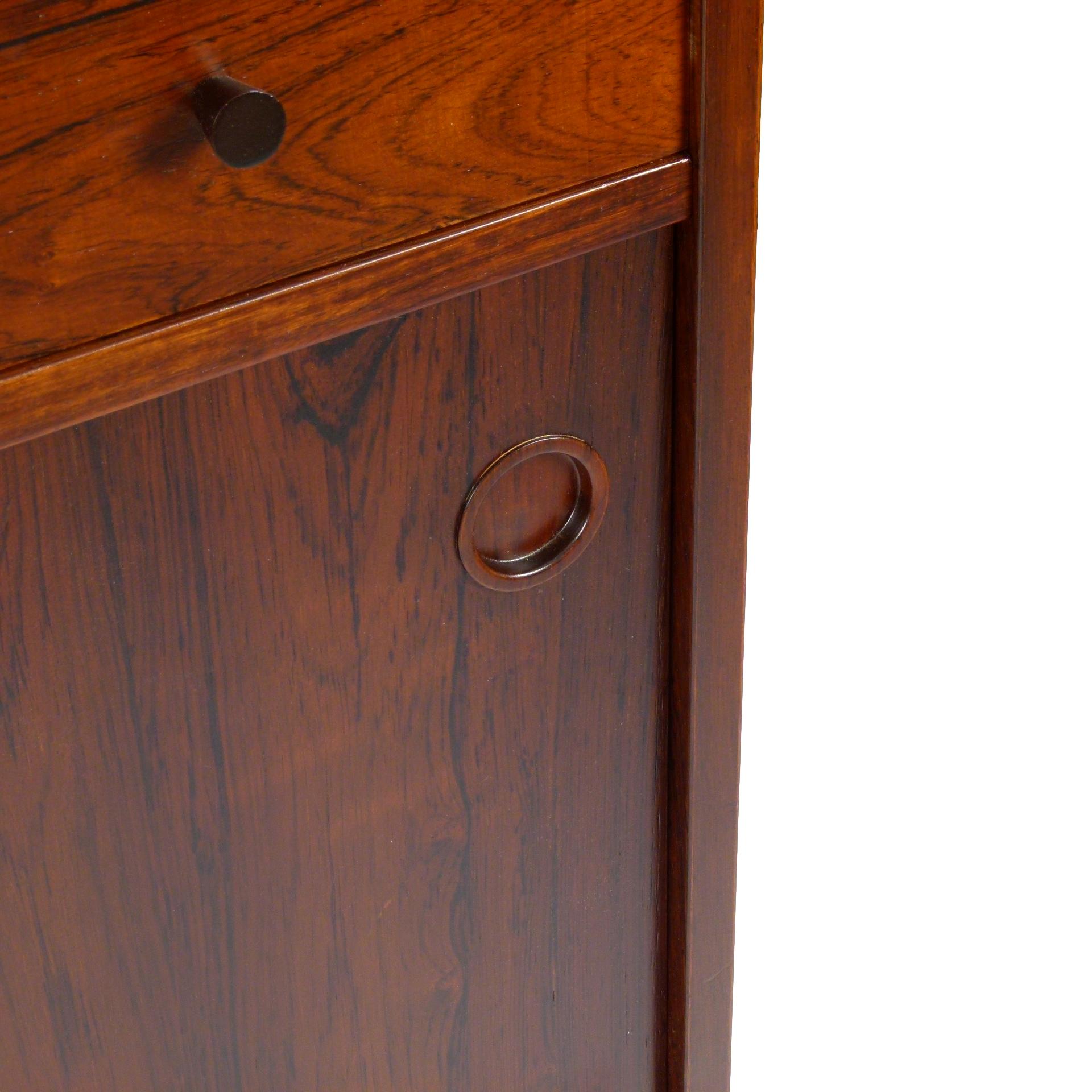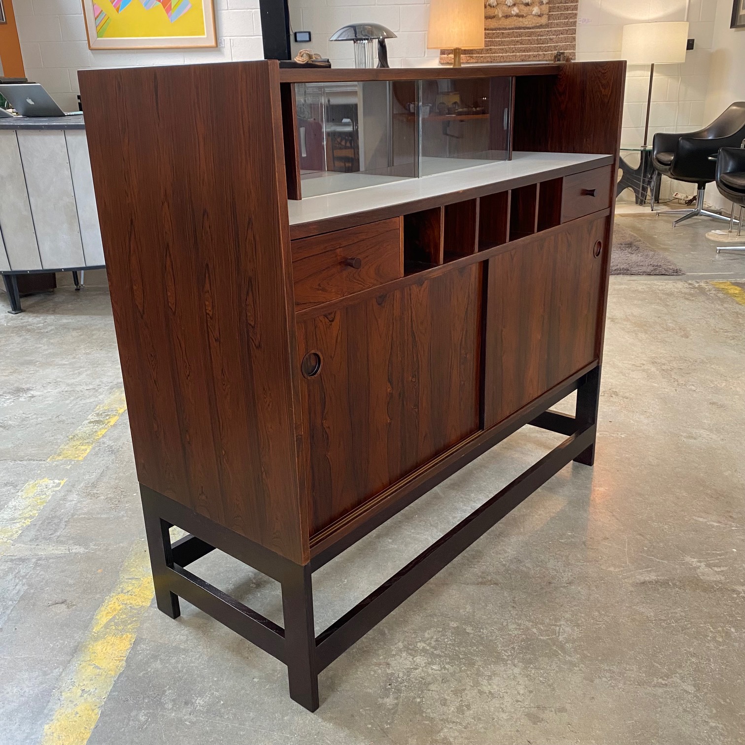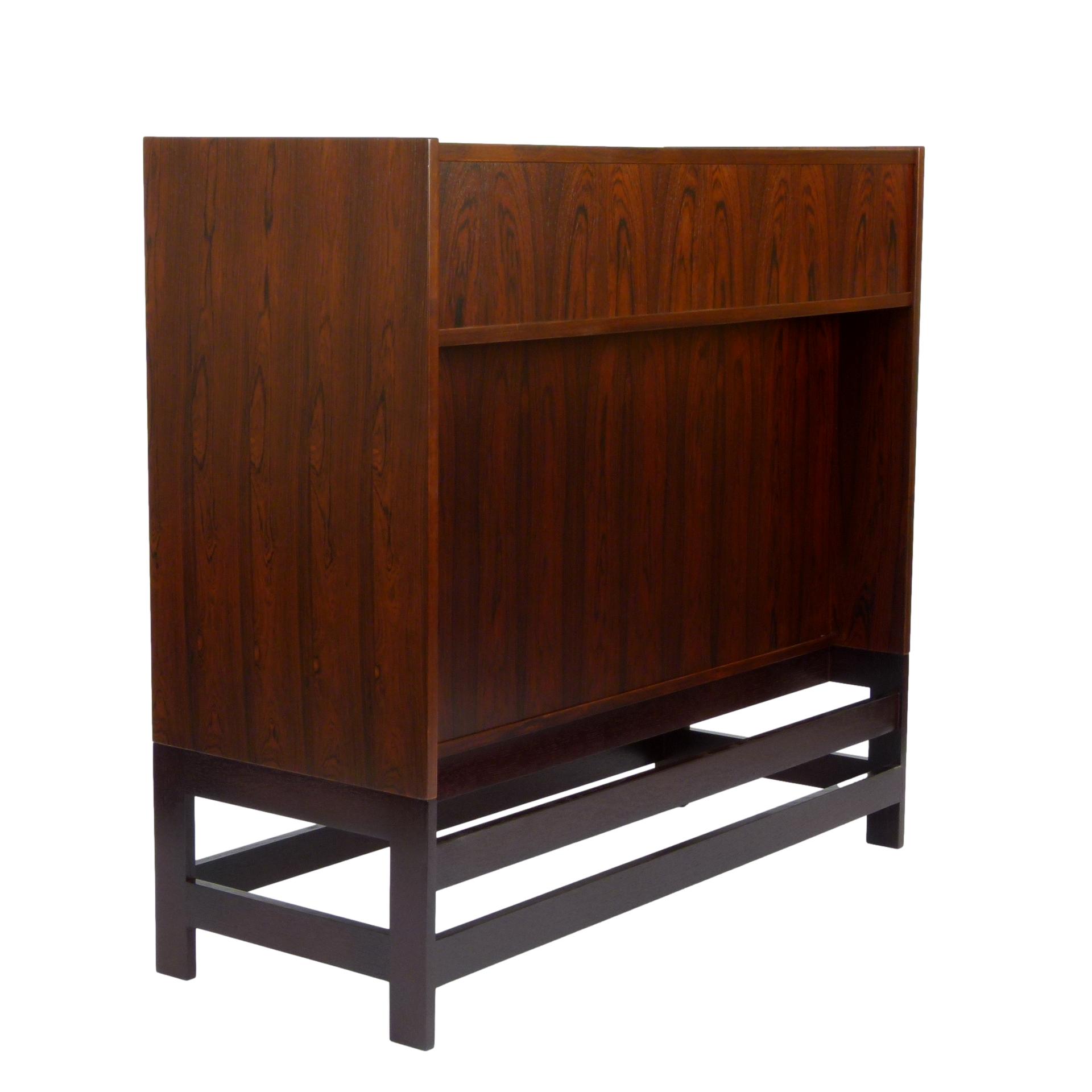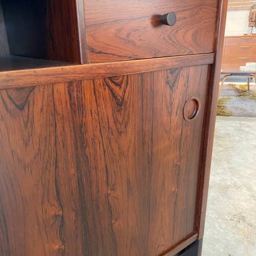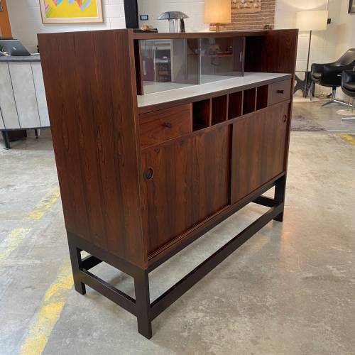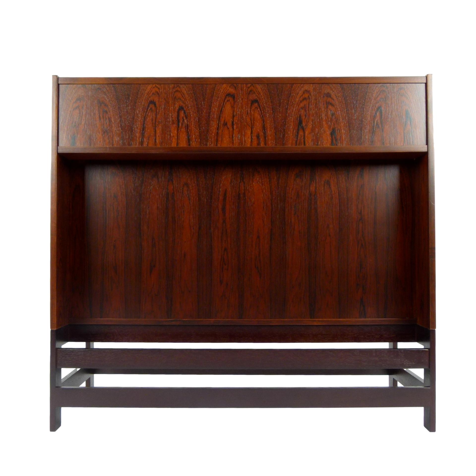 1960s rosewood bar from Norway. Rich rosewood graining with white laminate surfaces, bottle + glass storage, and open storage behind sliding doors.