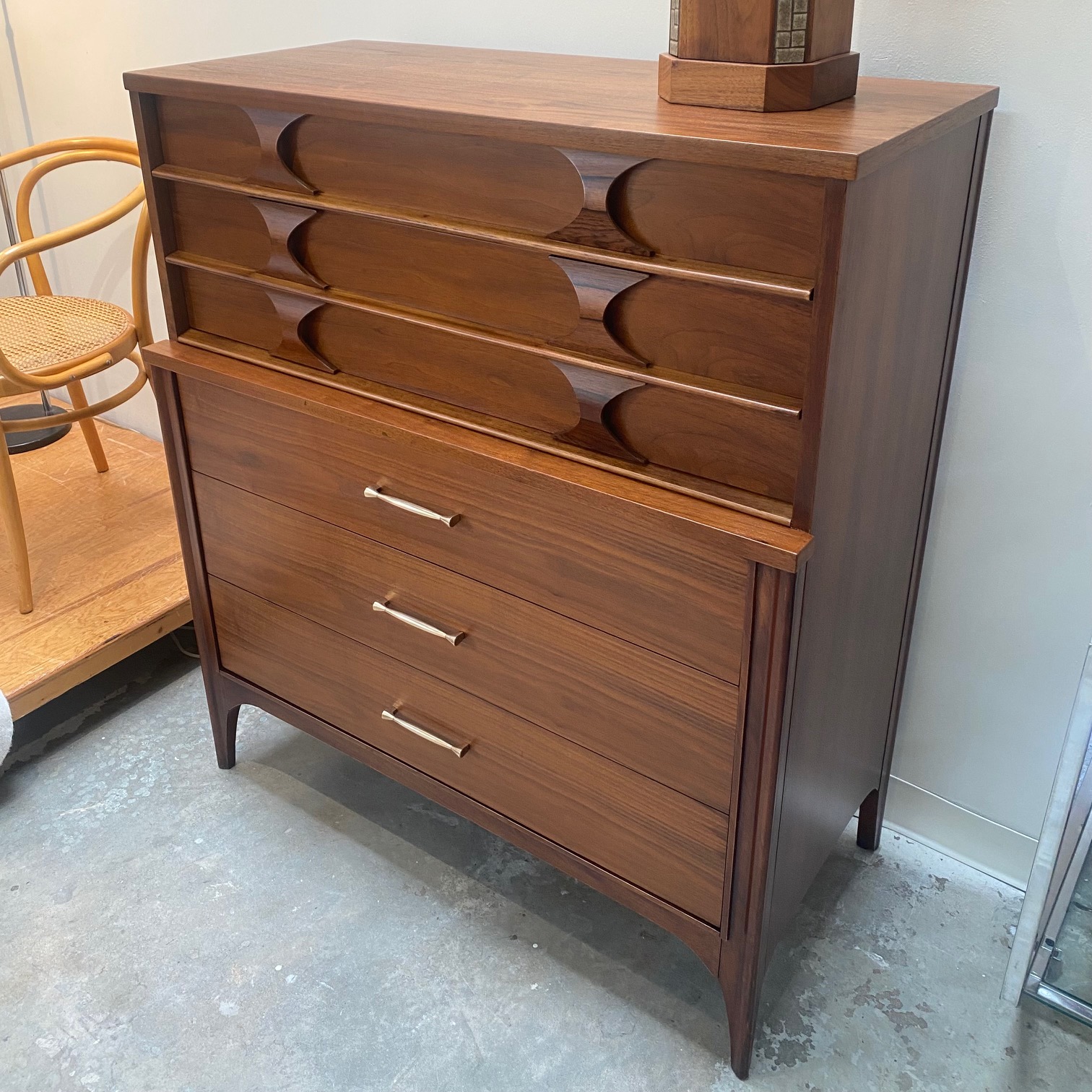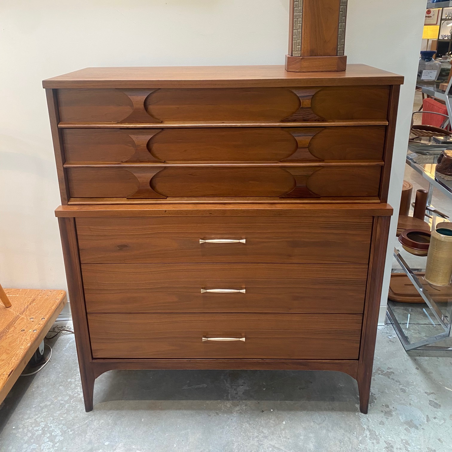 1960s walnut 5 drawer chest with rosewood pulls from Kent Coffey's "Perspecta" line.