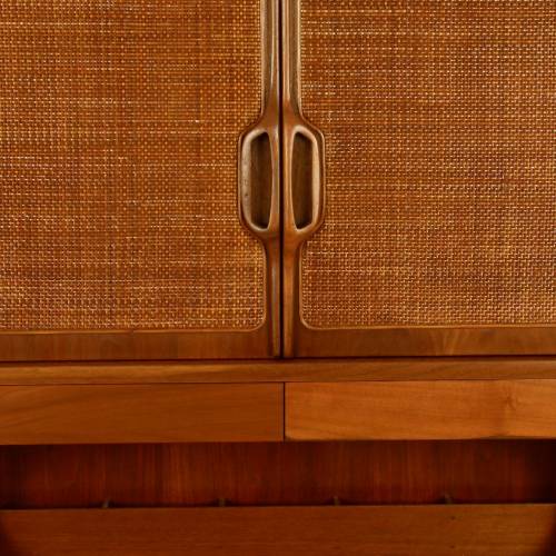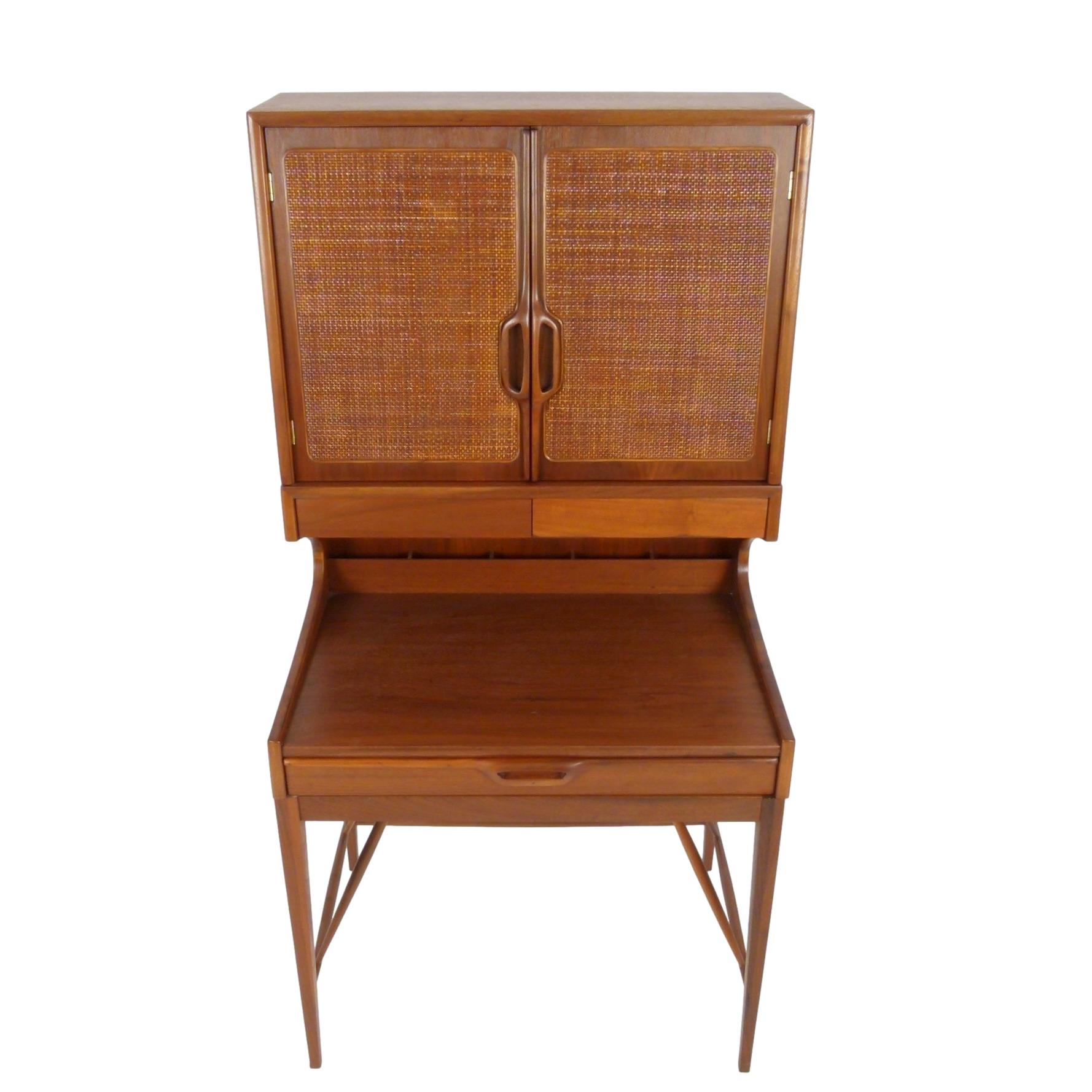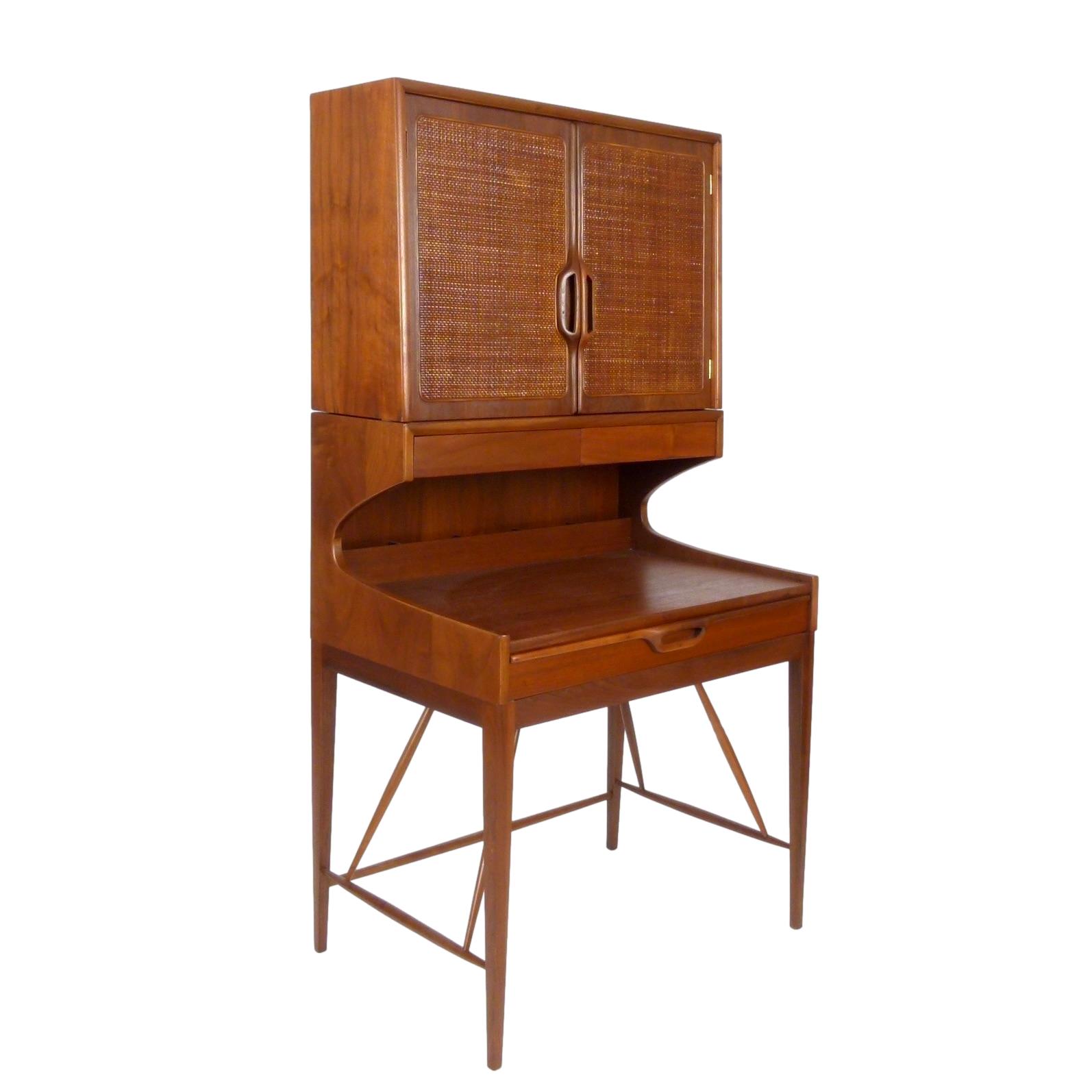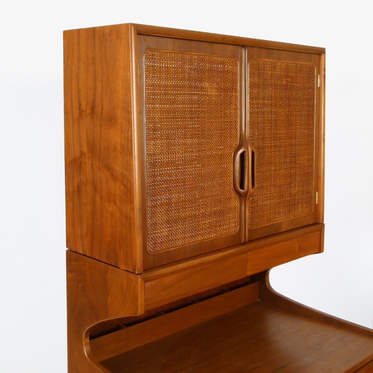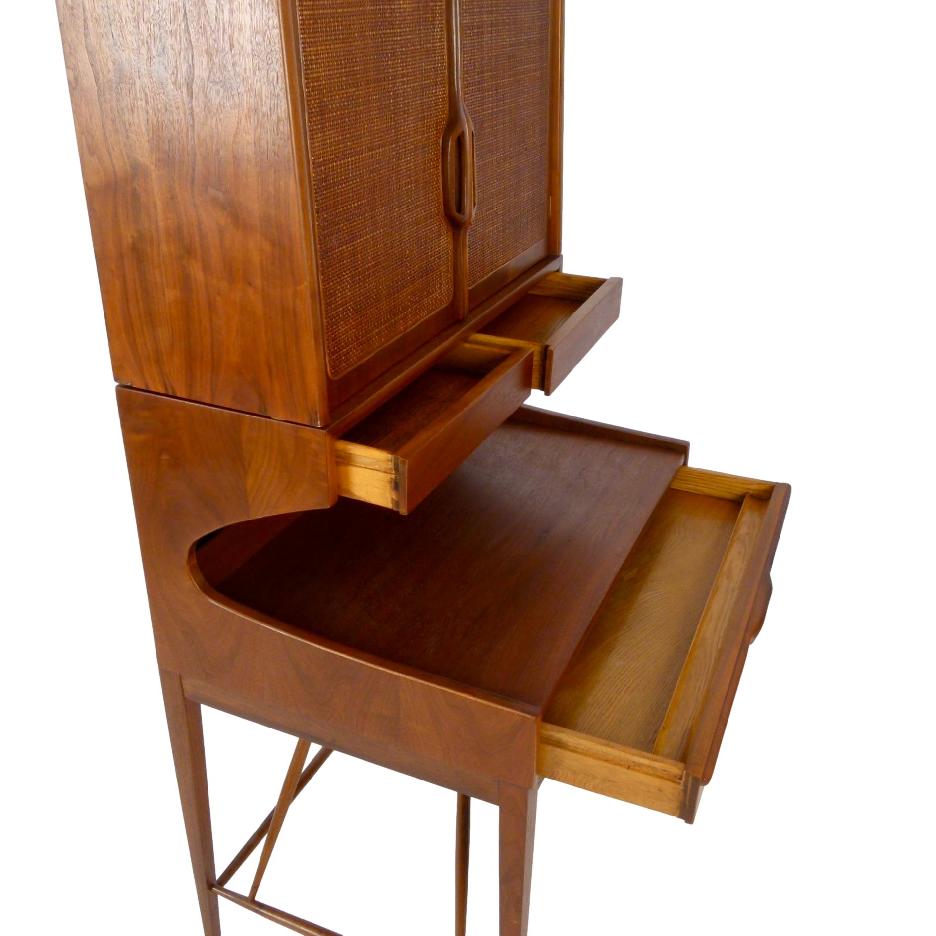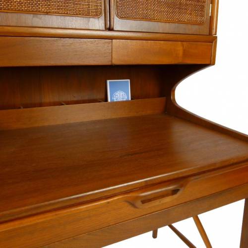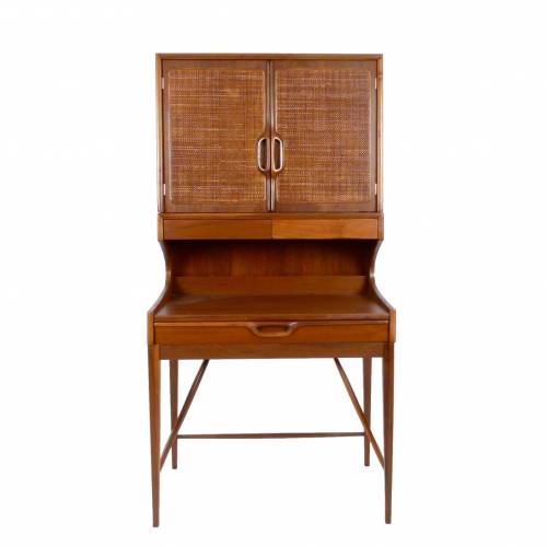Compact two-piece secretary with top cabinet in walnut. 3 drawers and storage cubbies on the back of the writing surface in the lower section and 1 adjustable shelf behind the cane front doors on top.