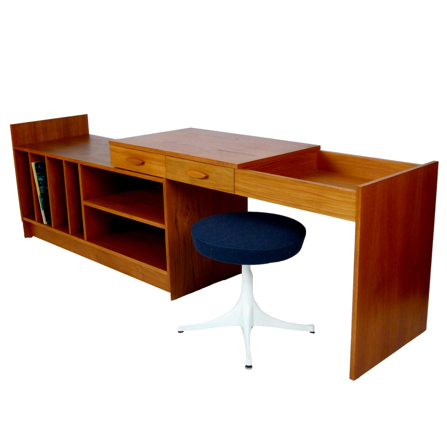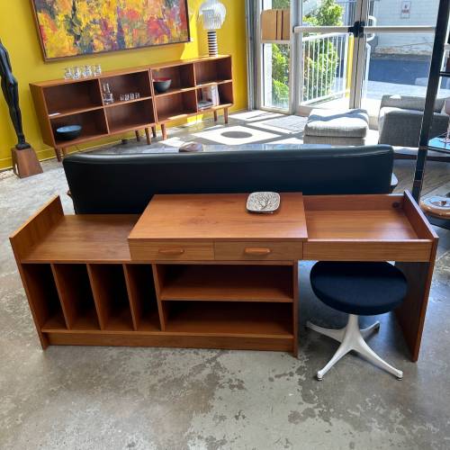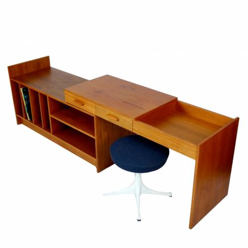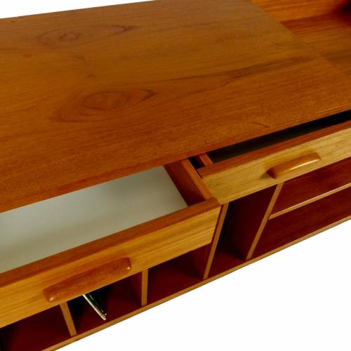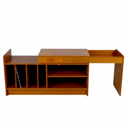 1970s two-piece record console in teak with 2 drawers, shelves, record storage, and adjustable width, Denmark.
