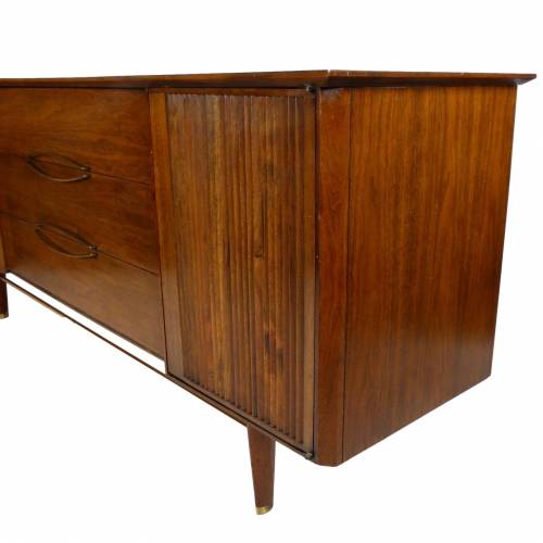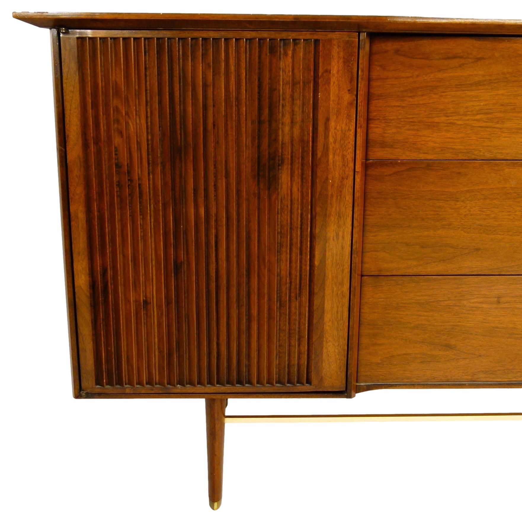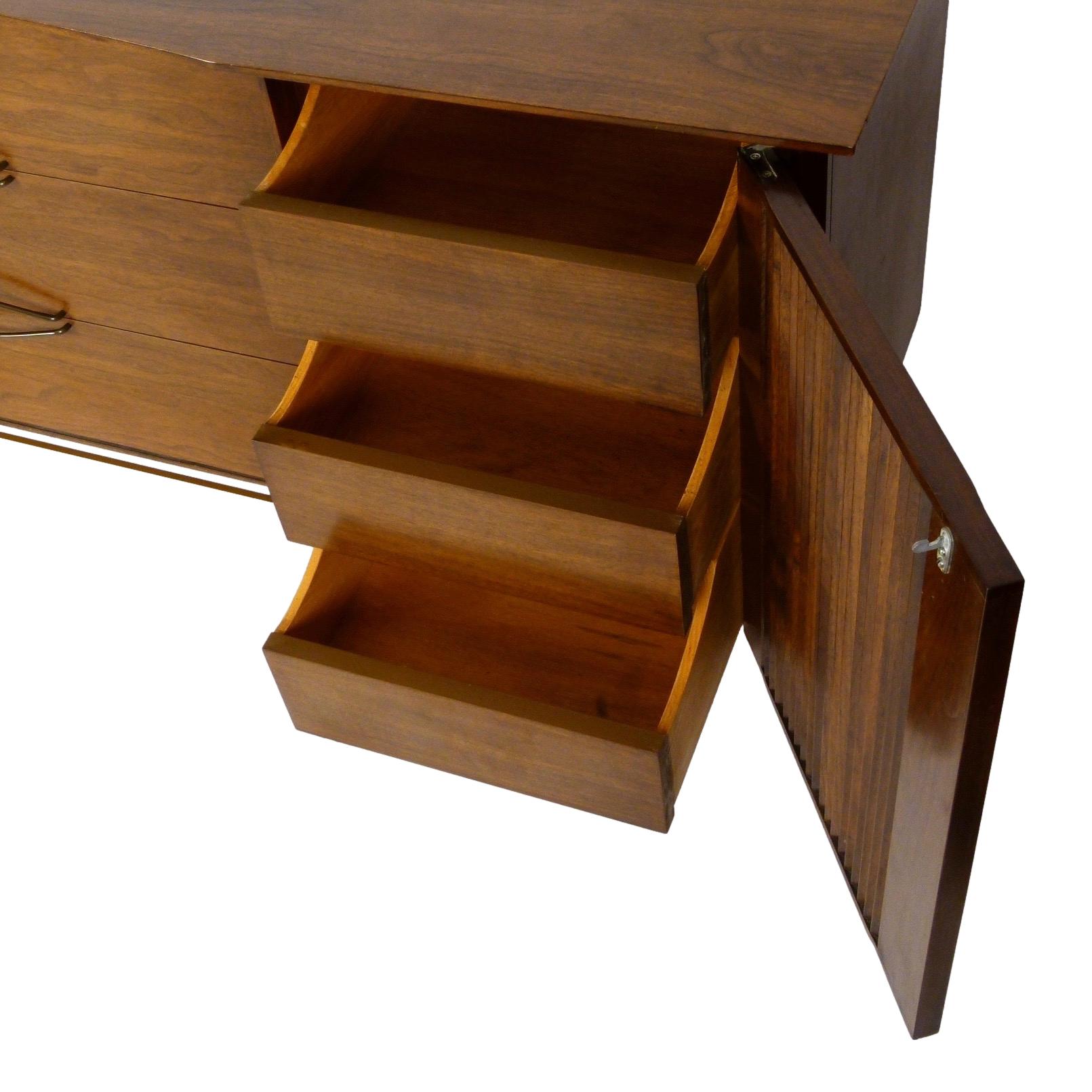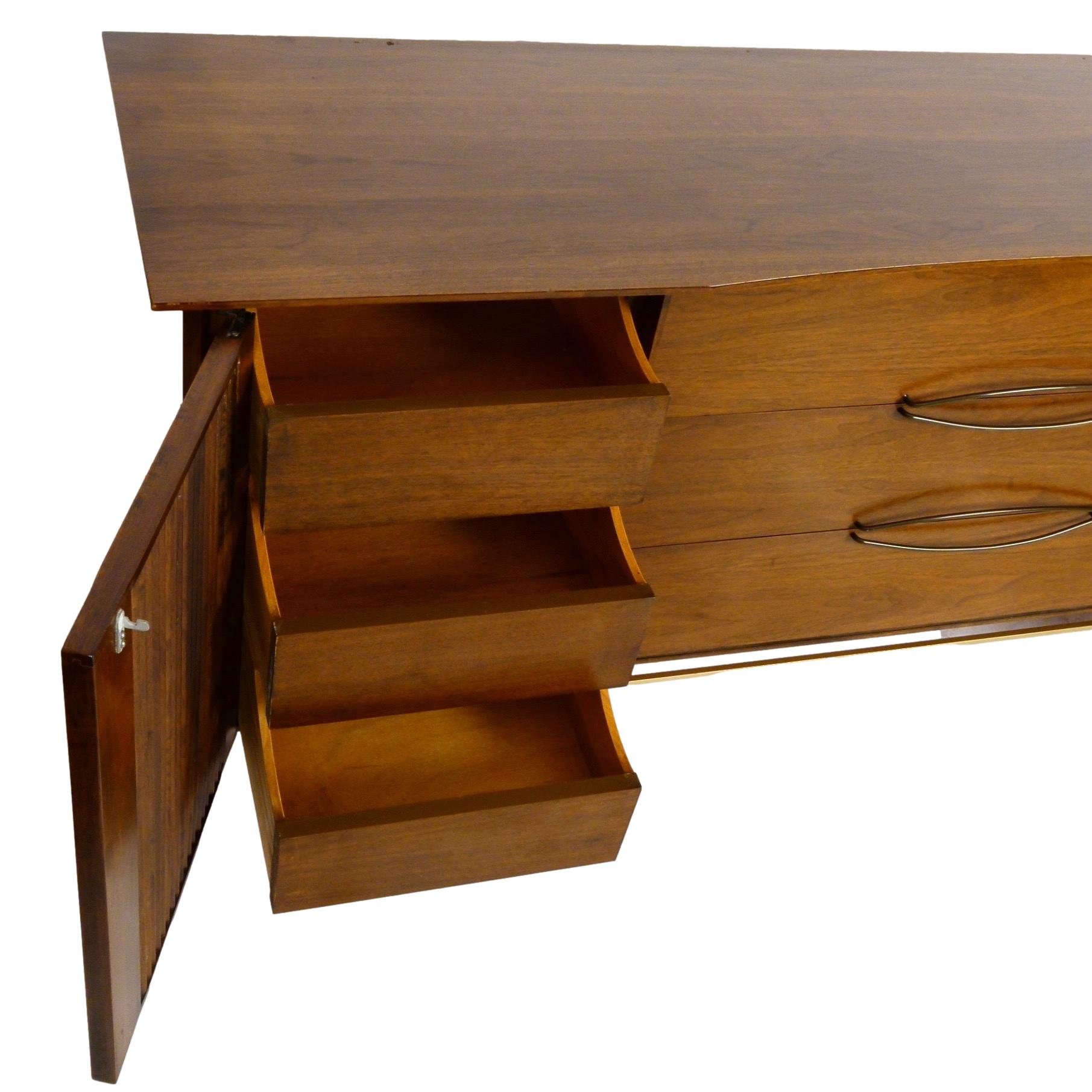 C.1960 9 drawer walnut dresser with solid brass details by Helen Hobey Baker. Includes original attachable mirror.