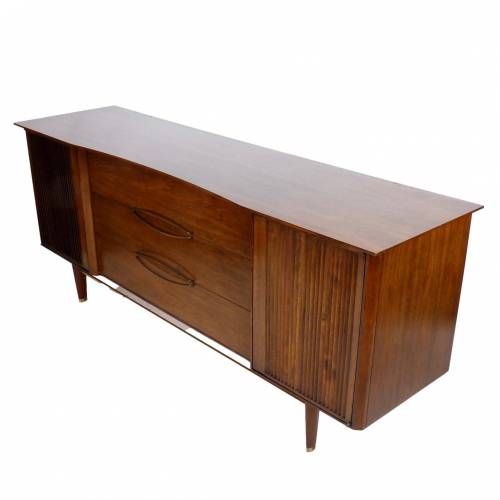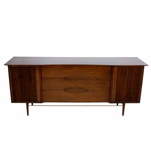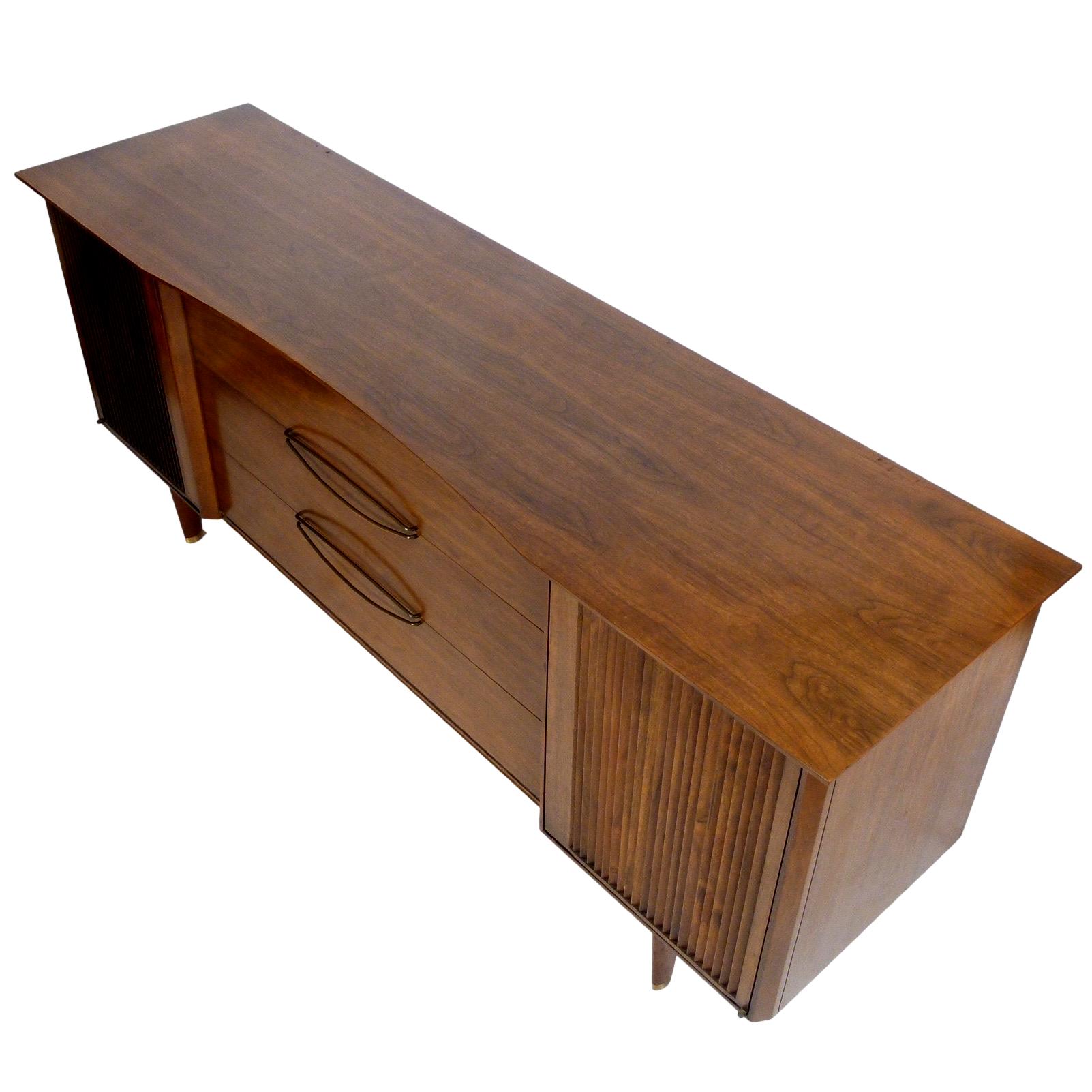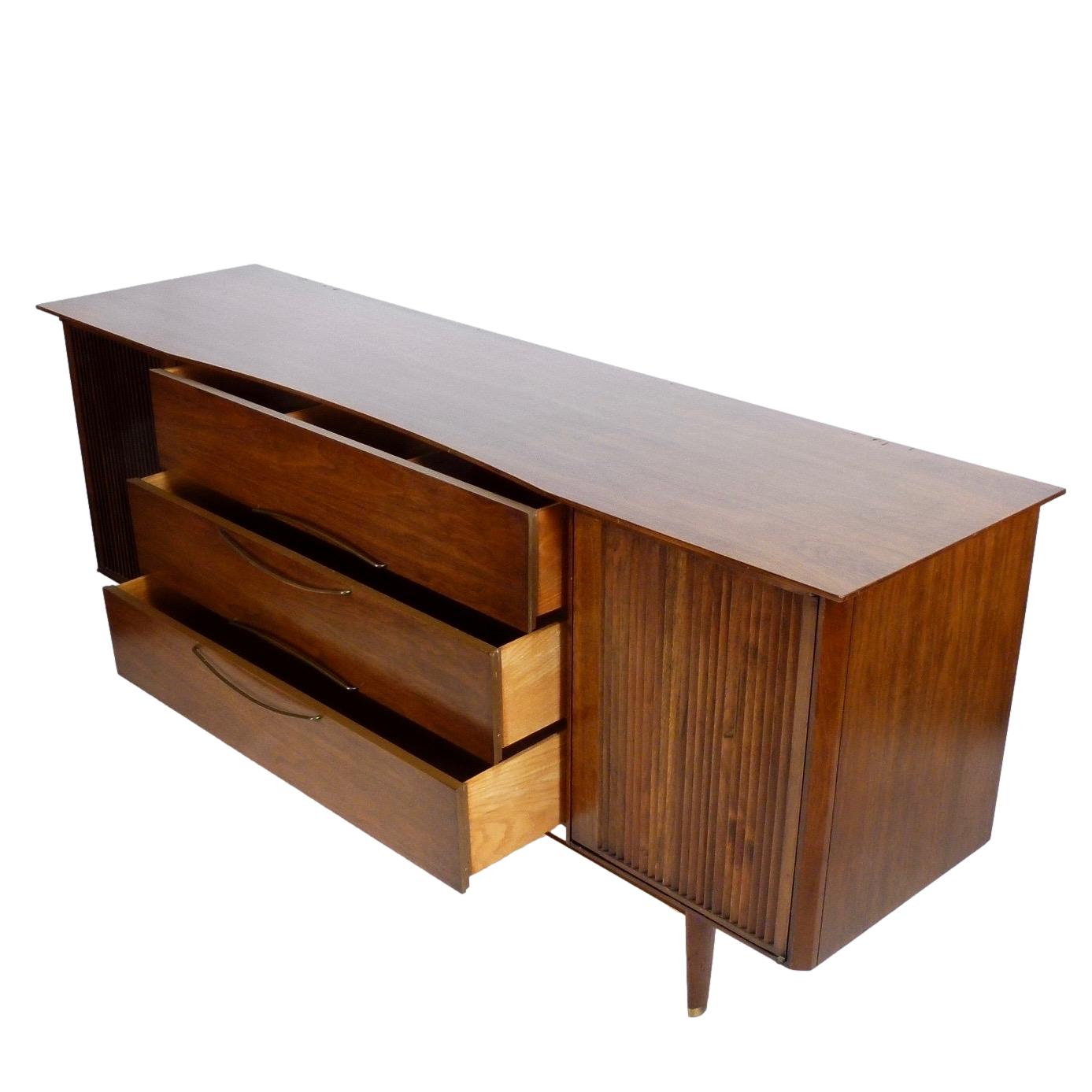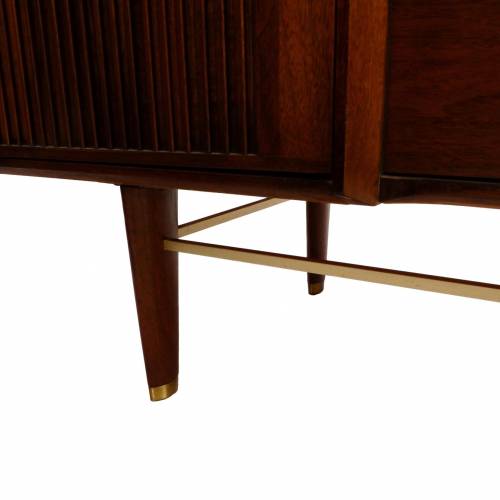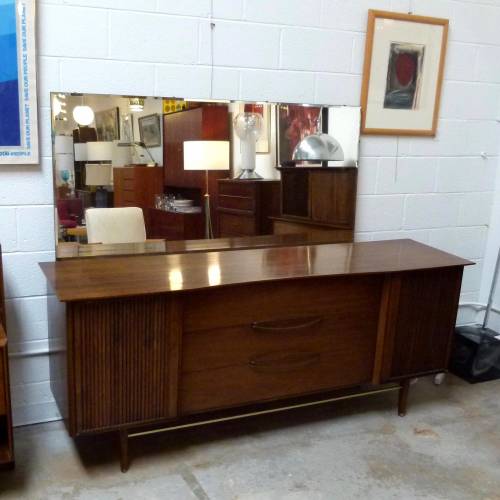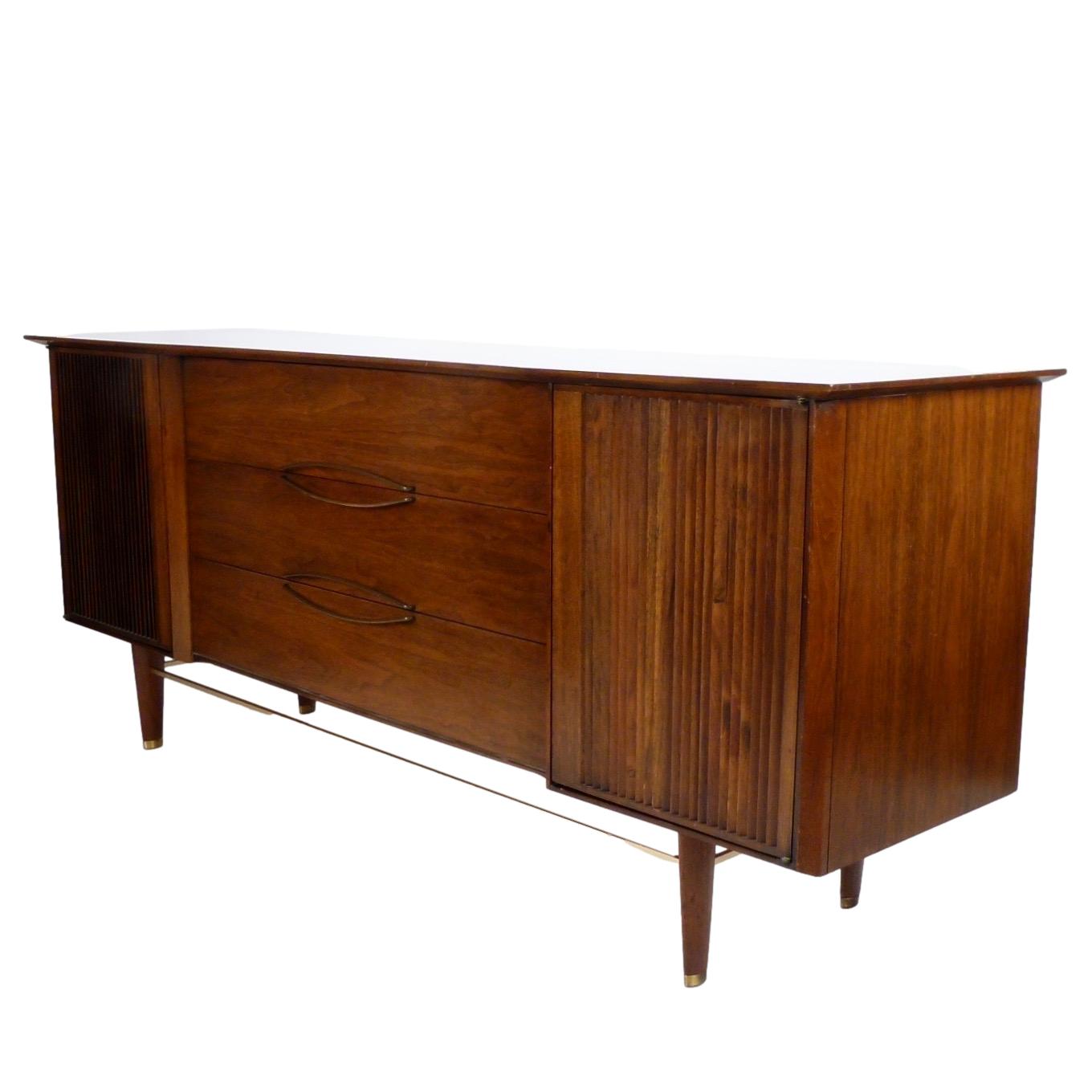 C.1960 9 drawer walnut dresser with solid brass details by Helen Hobey Baker. Includes original attachable mirror.