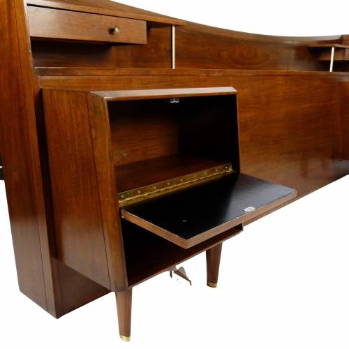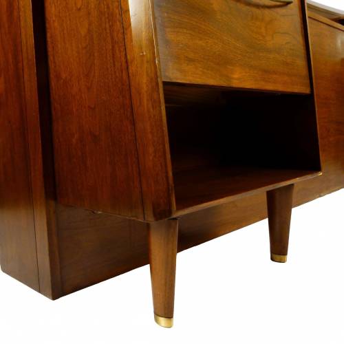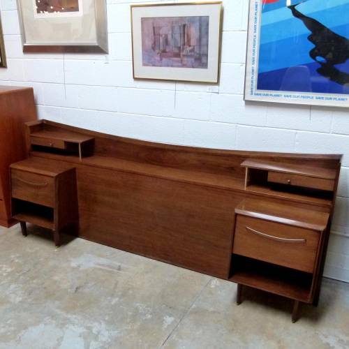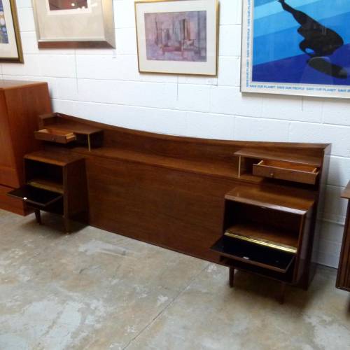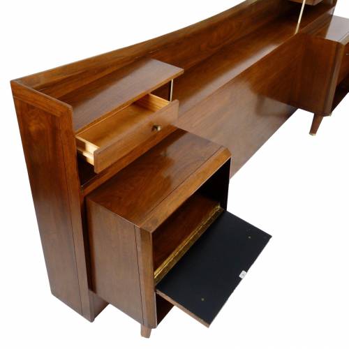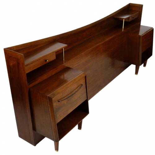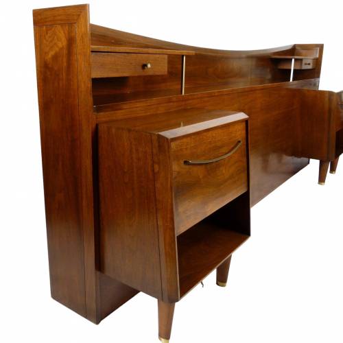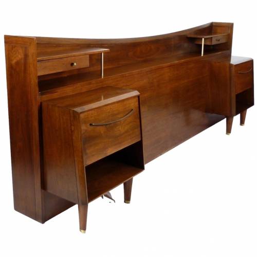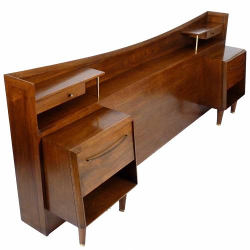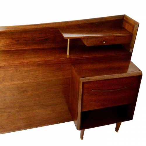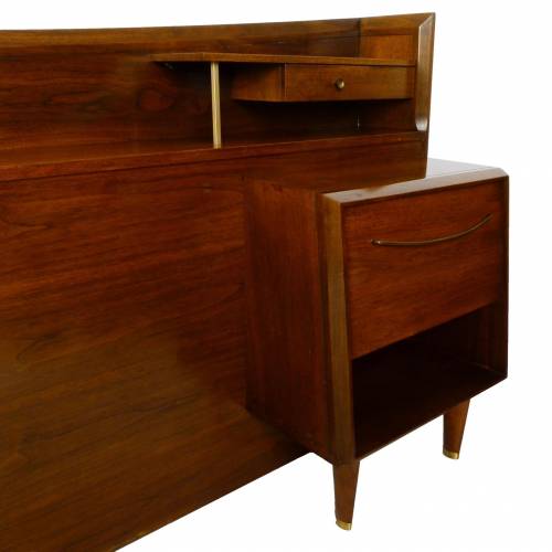 C.1960 full size walnut with brass details headboard with attached nightstands by Helen Hobey Baker. Nightstands each have a drawer and pull down door.