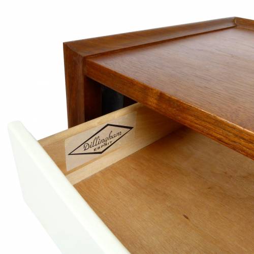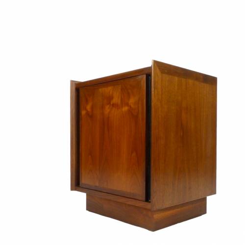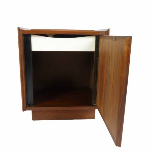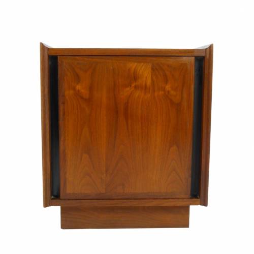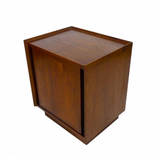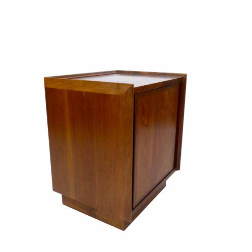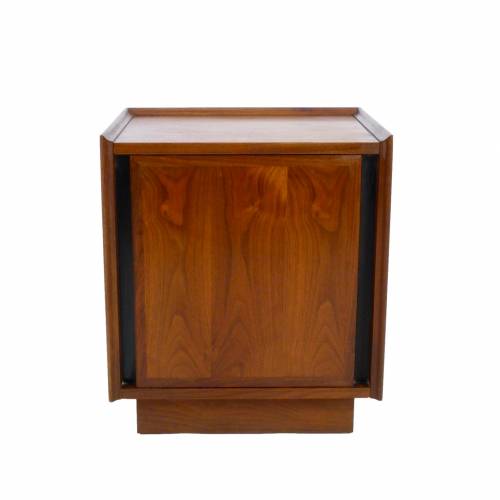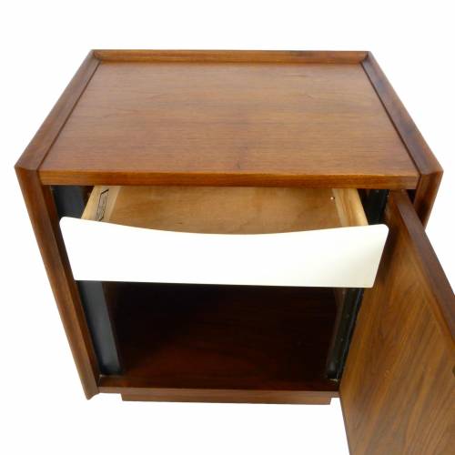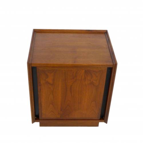 1960s single nightstand from Merton Gershun's Esprit line for Dillingham. Oiled walnut with black laminate detail around door, open storage and a shallow drawer behind the door.