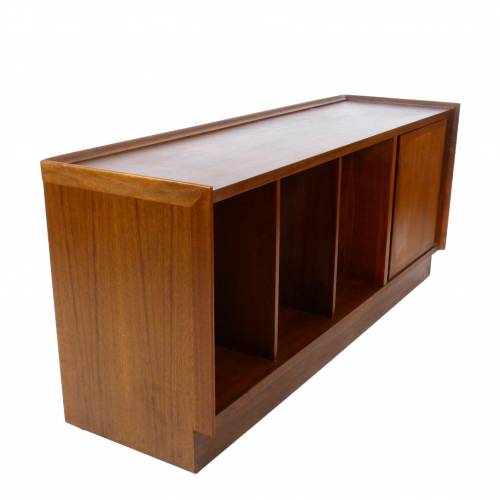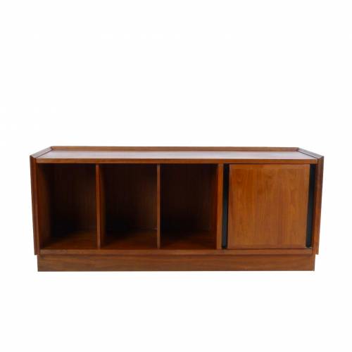 1960s oiled walnut bench with open storage behind the door on the right and divided nooks suitable for records, designed by Merton Gershun for his Esprit line by Dillingham. Would also work well as an entry bench for shoes.