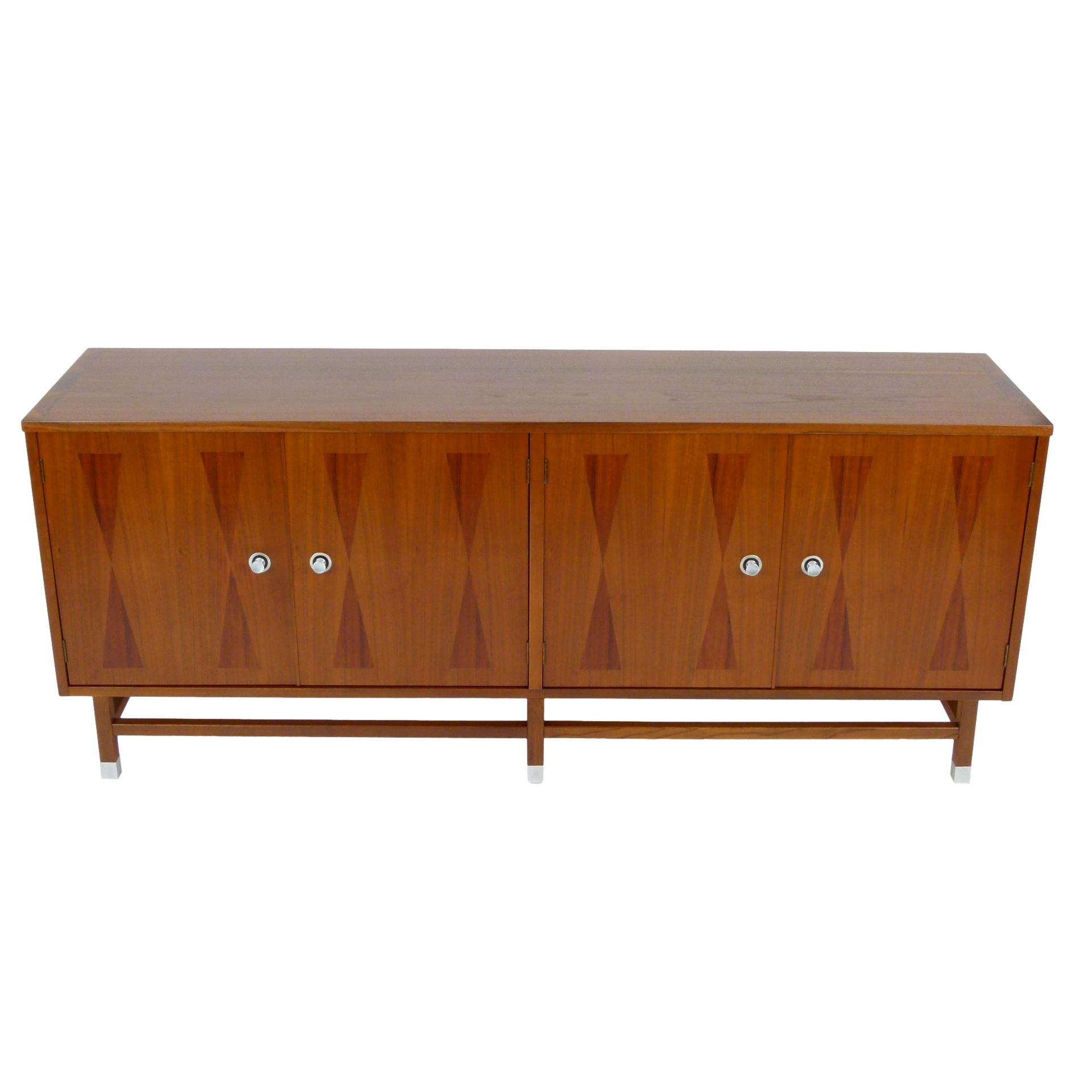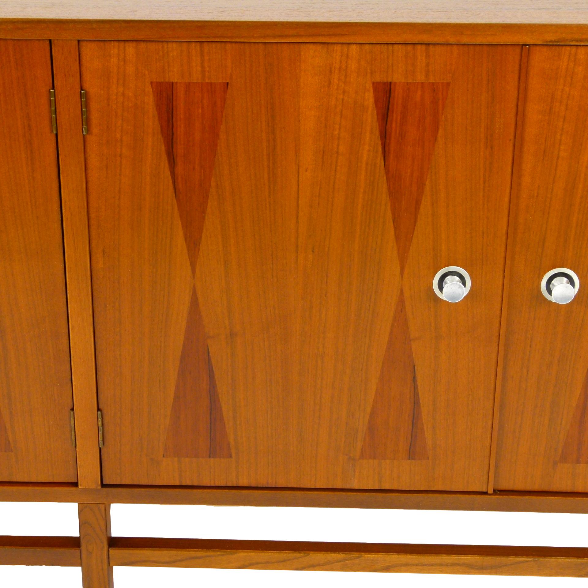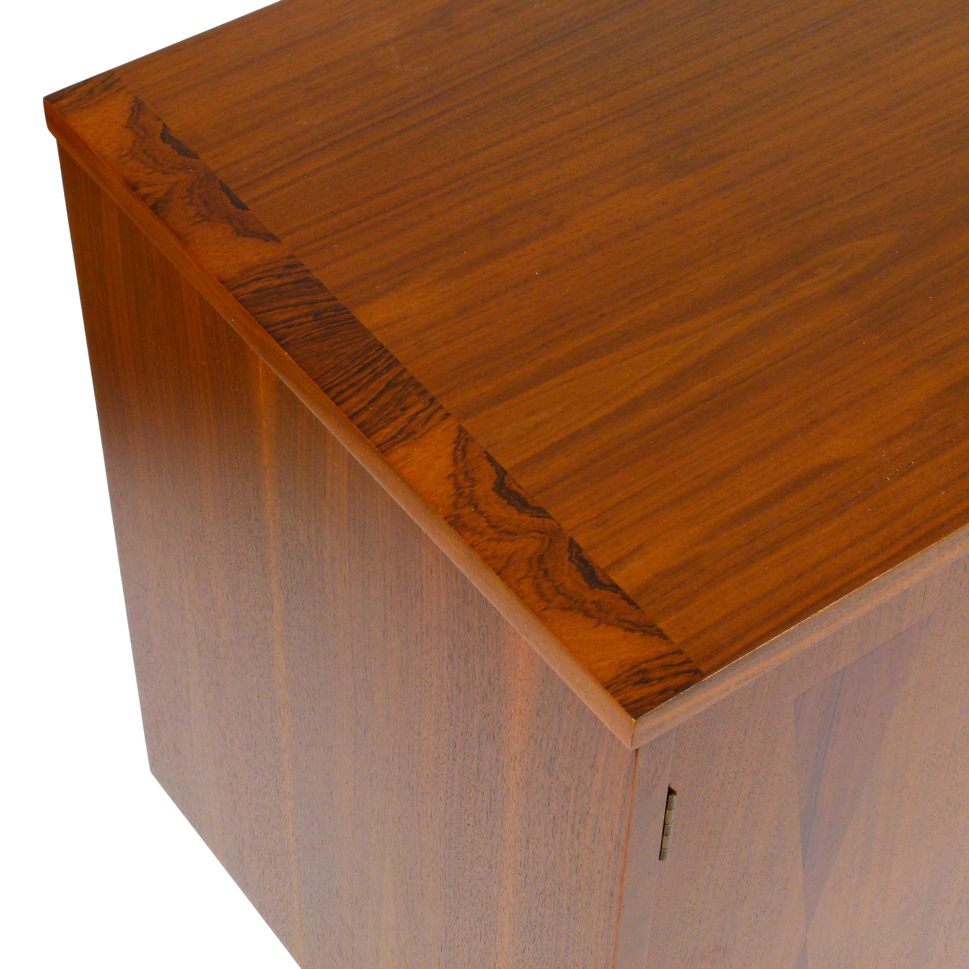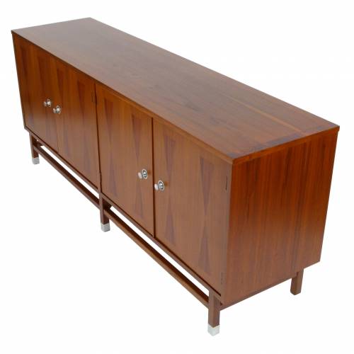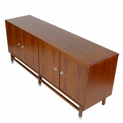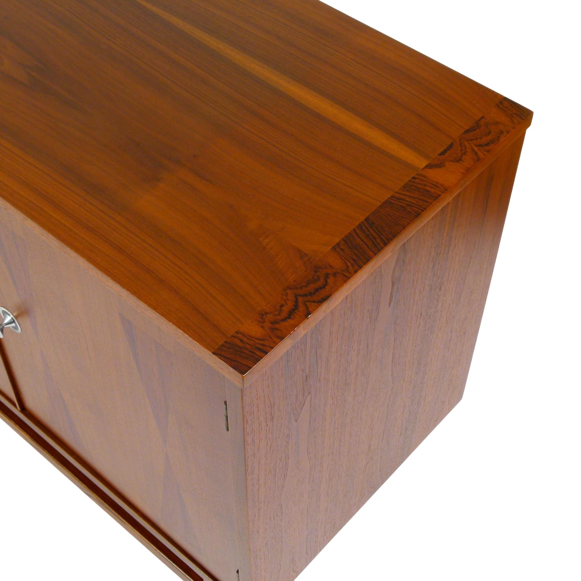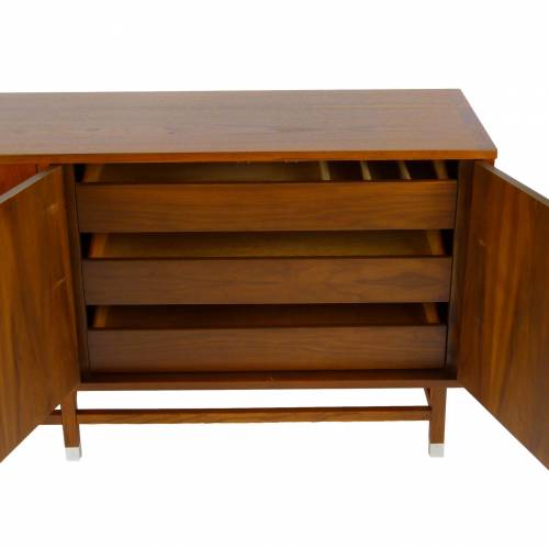 1960s rosewood and walnut credenza designed by Paul Browning for Stanley. Features an adjustable shelf on the left side and three drawers on the right.