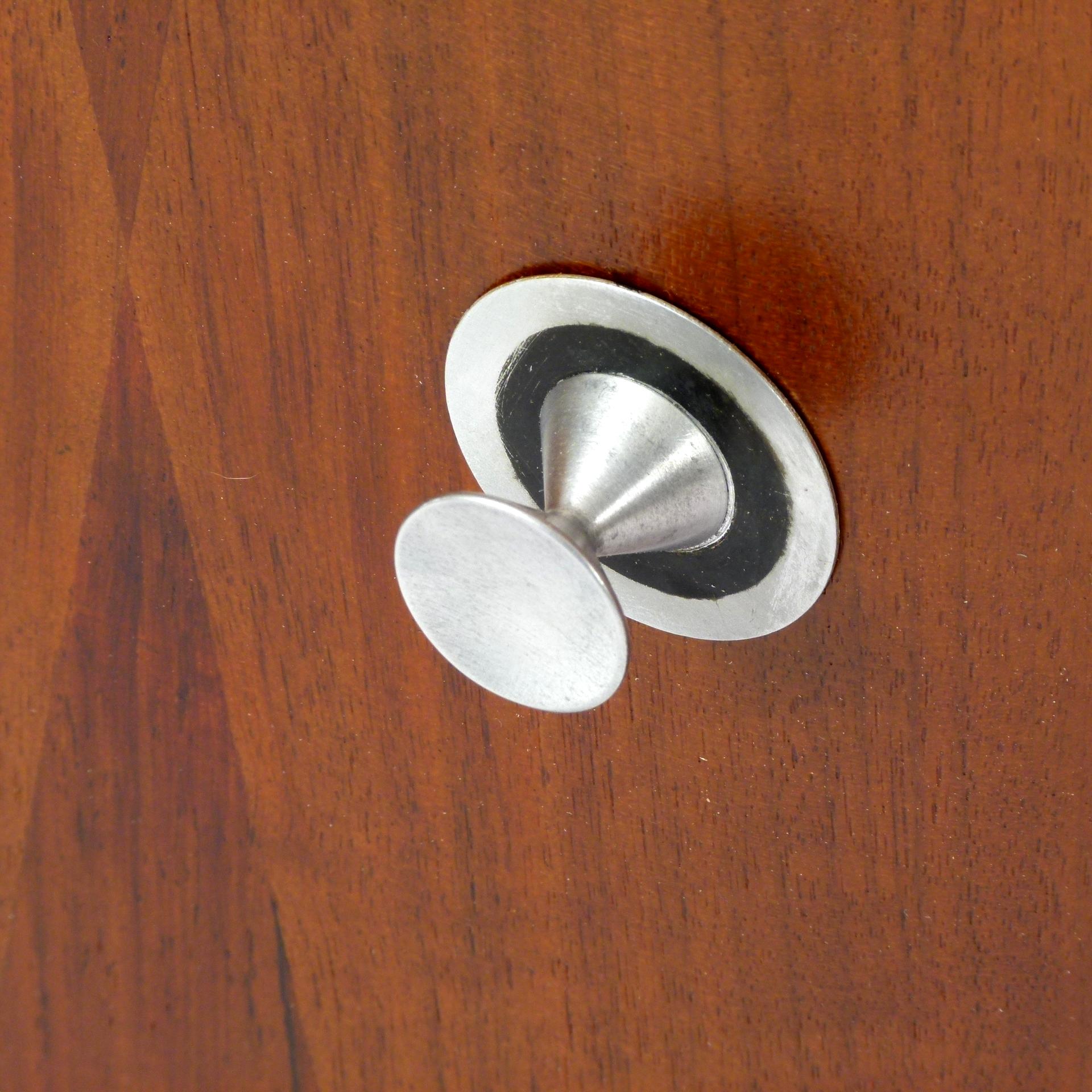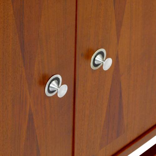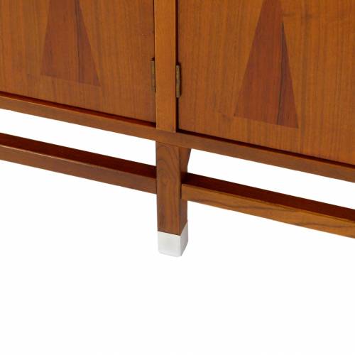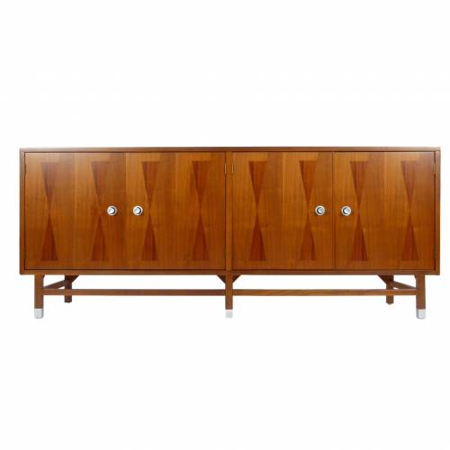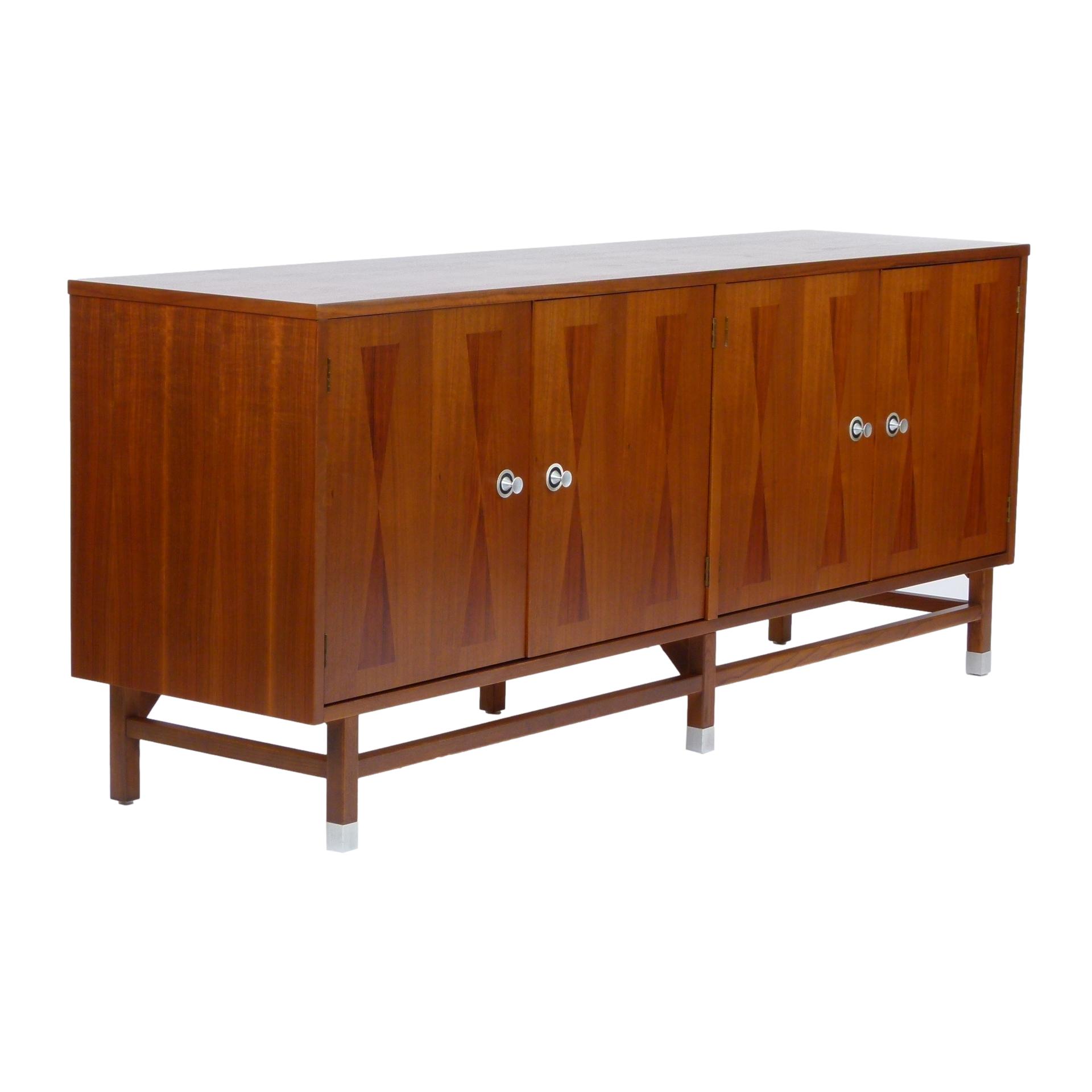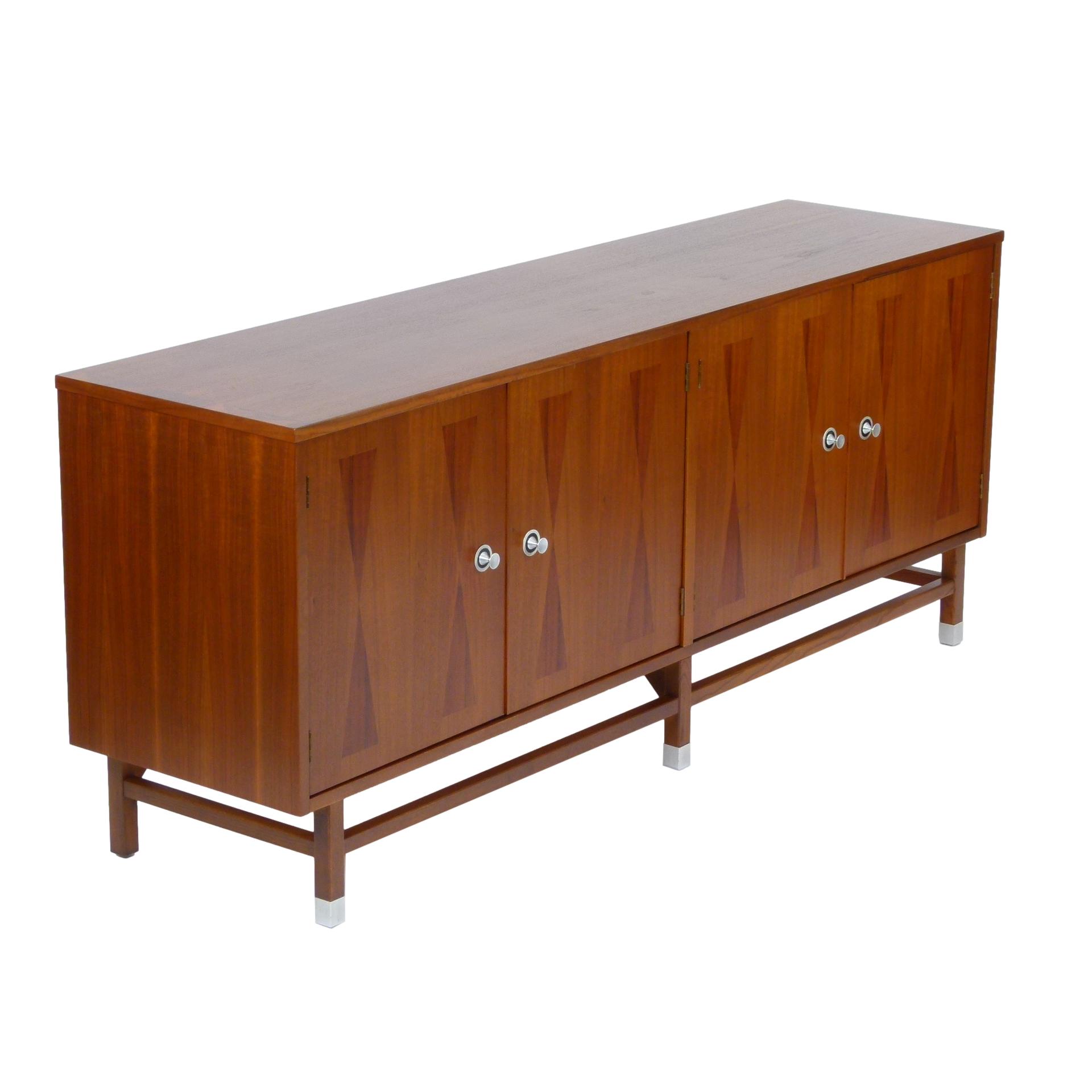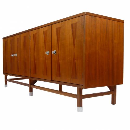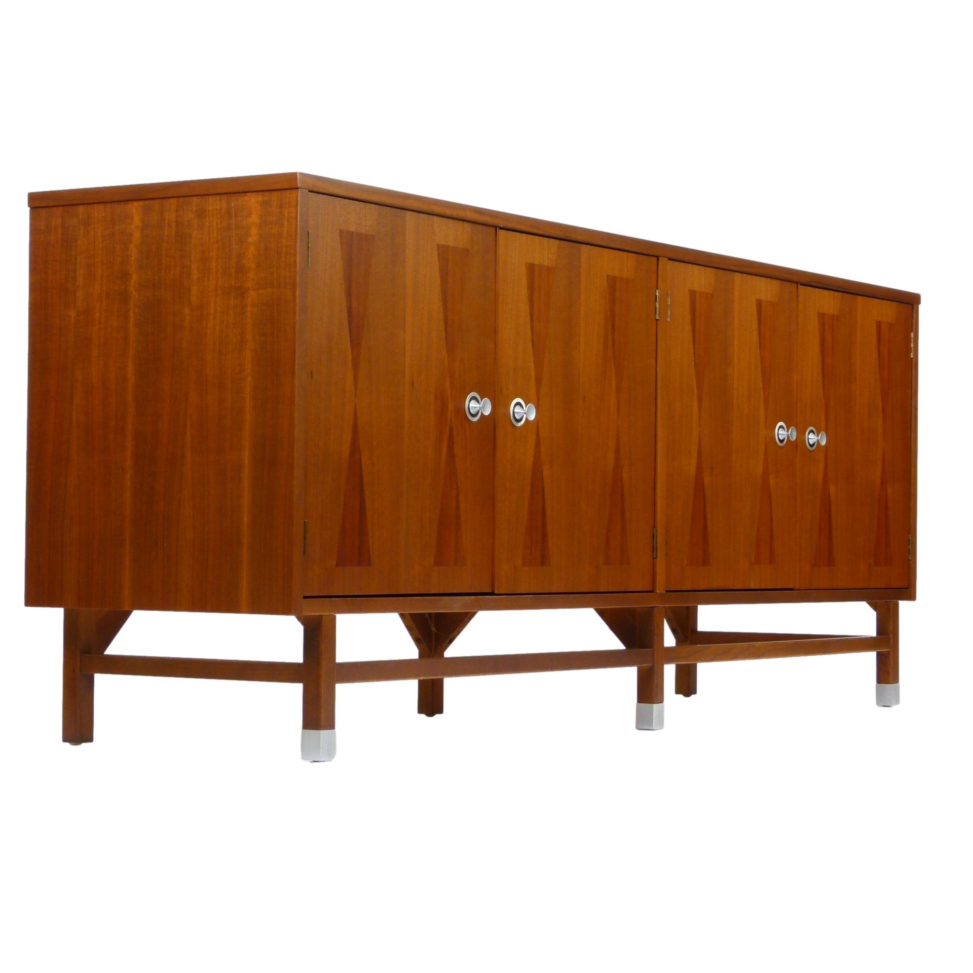 1960s rosewood and walnut credenza designed by Paul Browning for Stanley. Features an adjustable shelf on the left side and three drawers on the right.