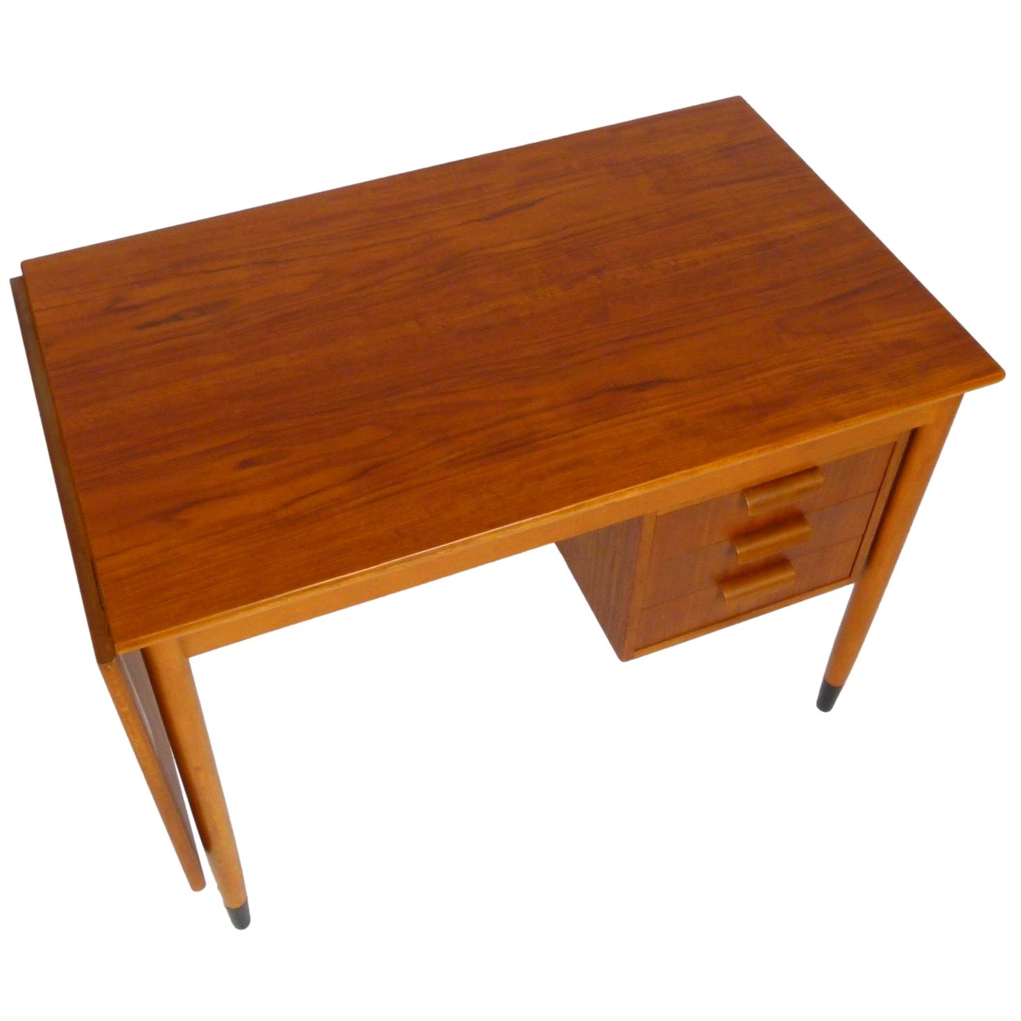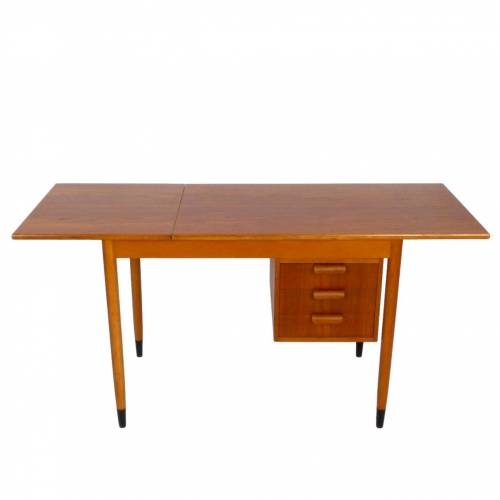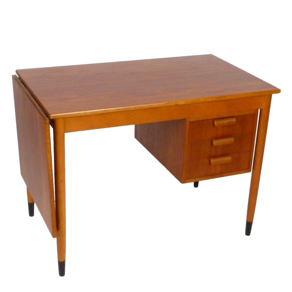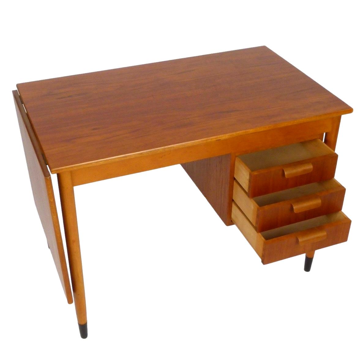 1960s teak and beech Arne Vodder-style desk from Sweden with drop-leaf sliding top and left or right side sliding drawers.