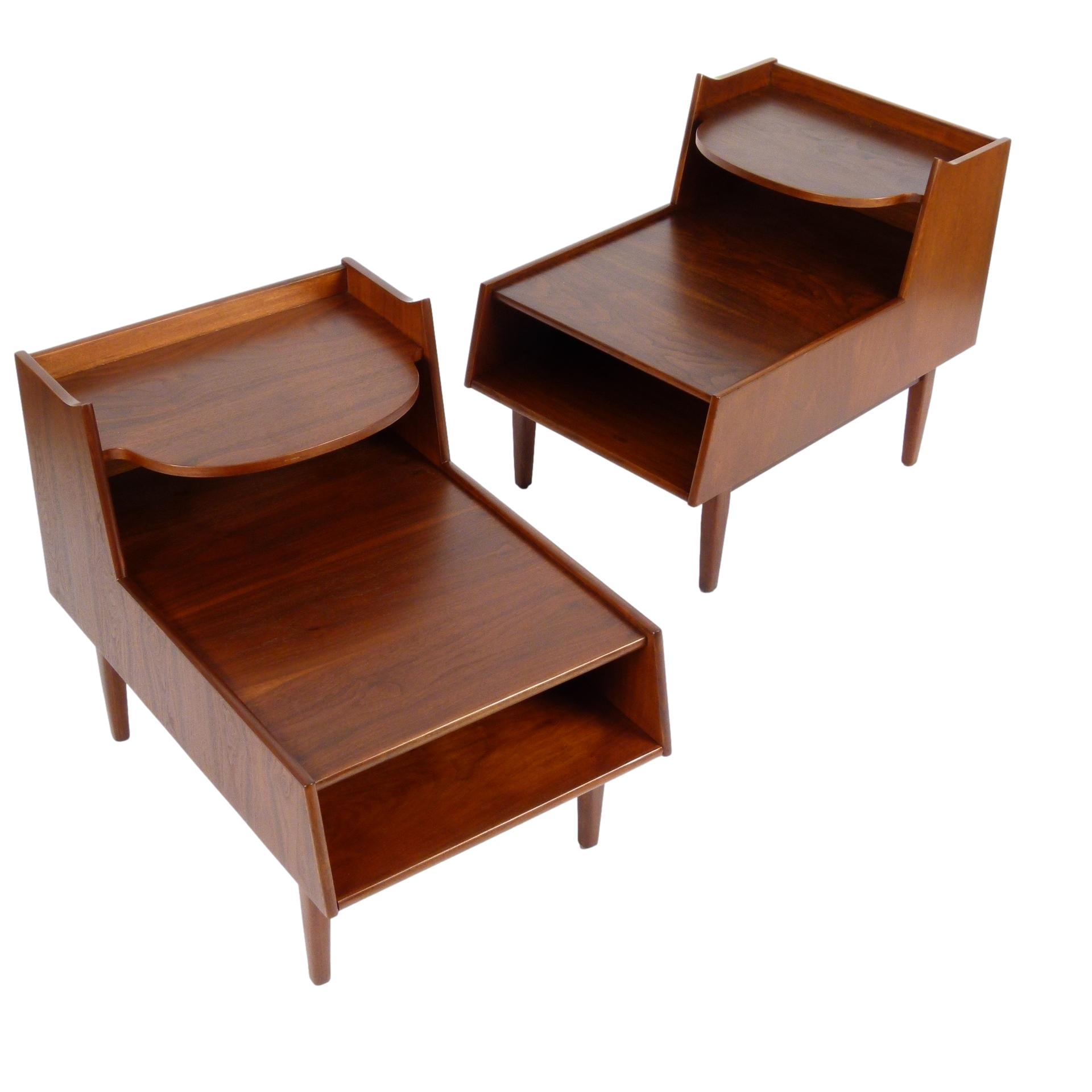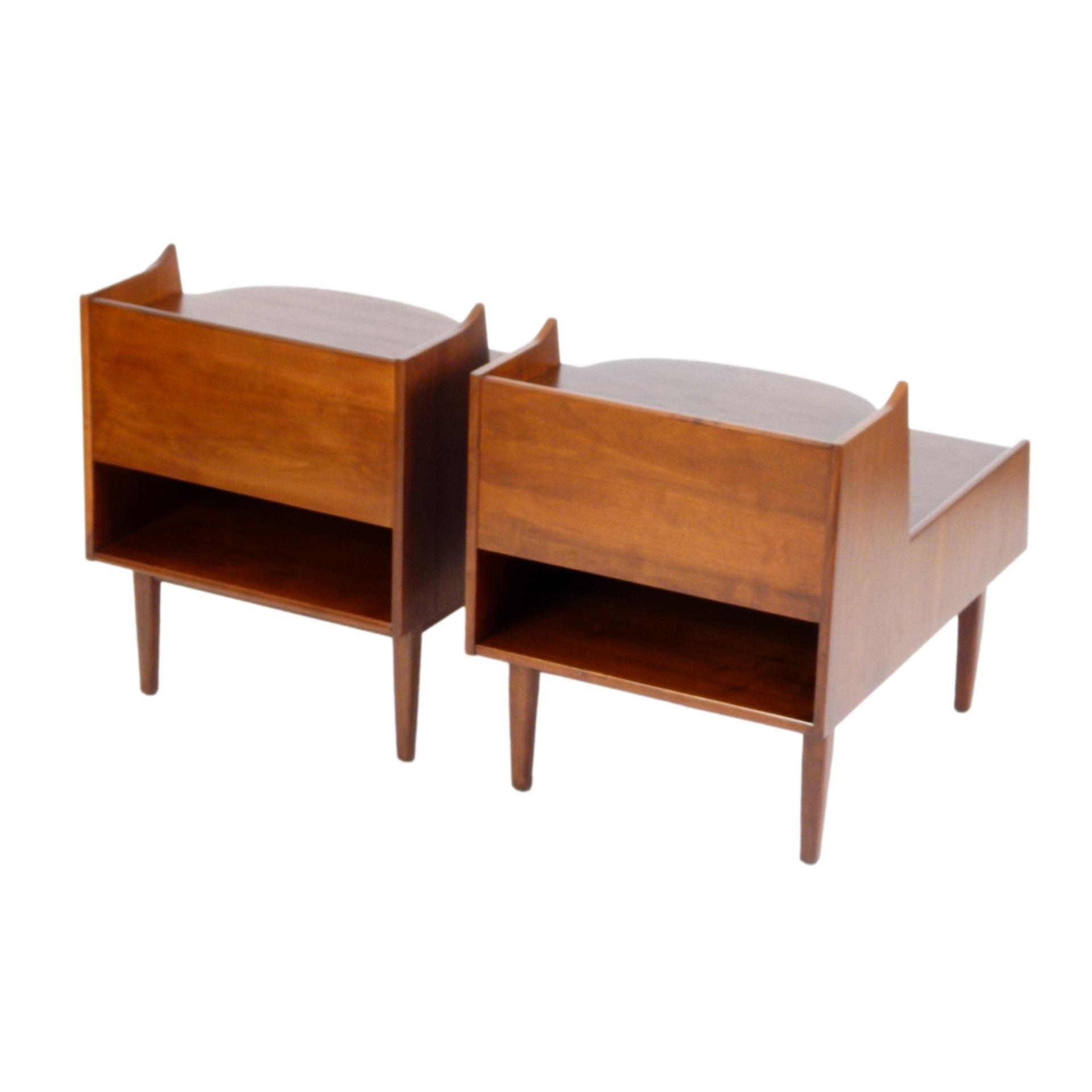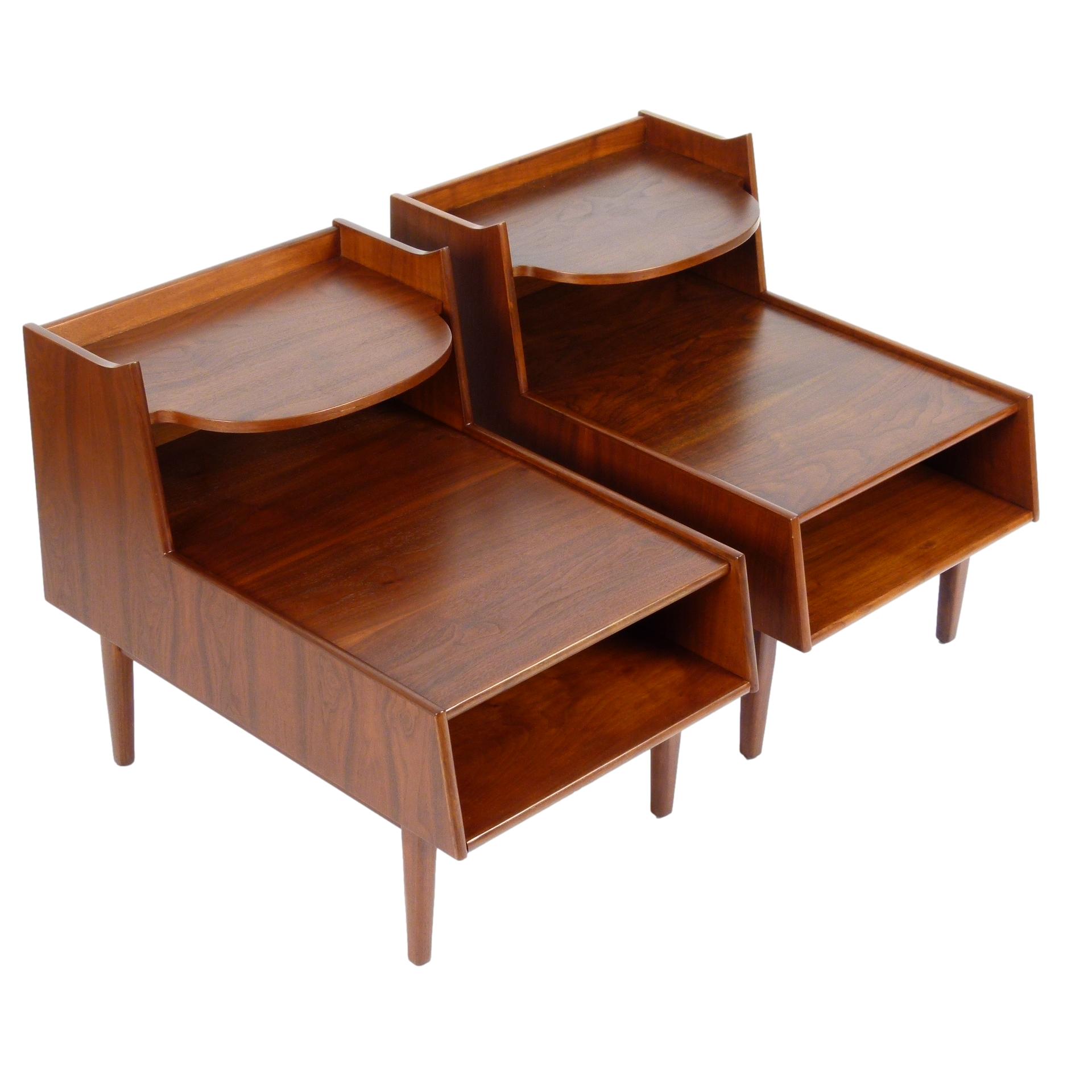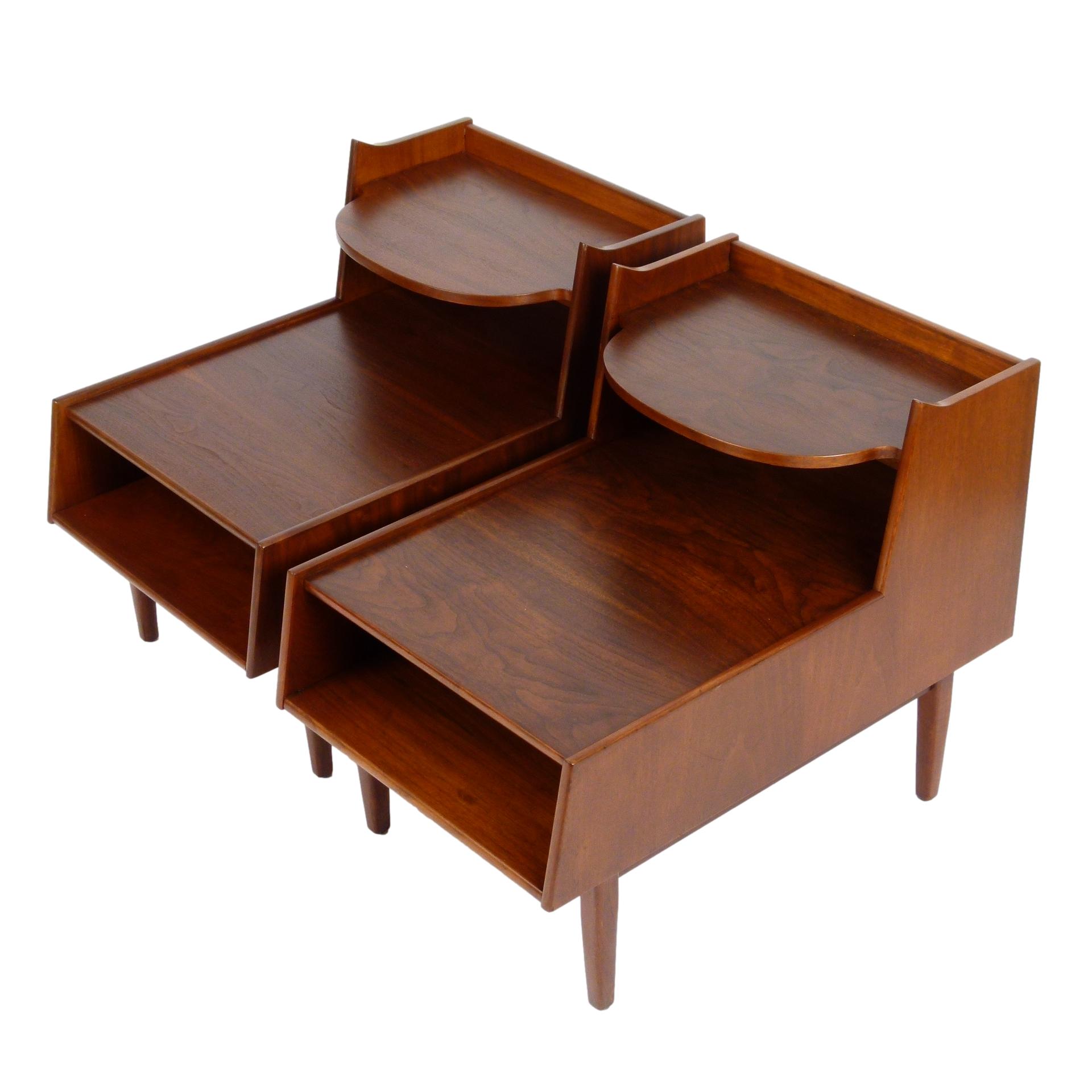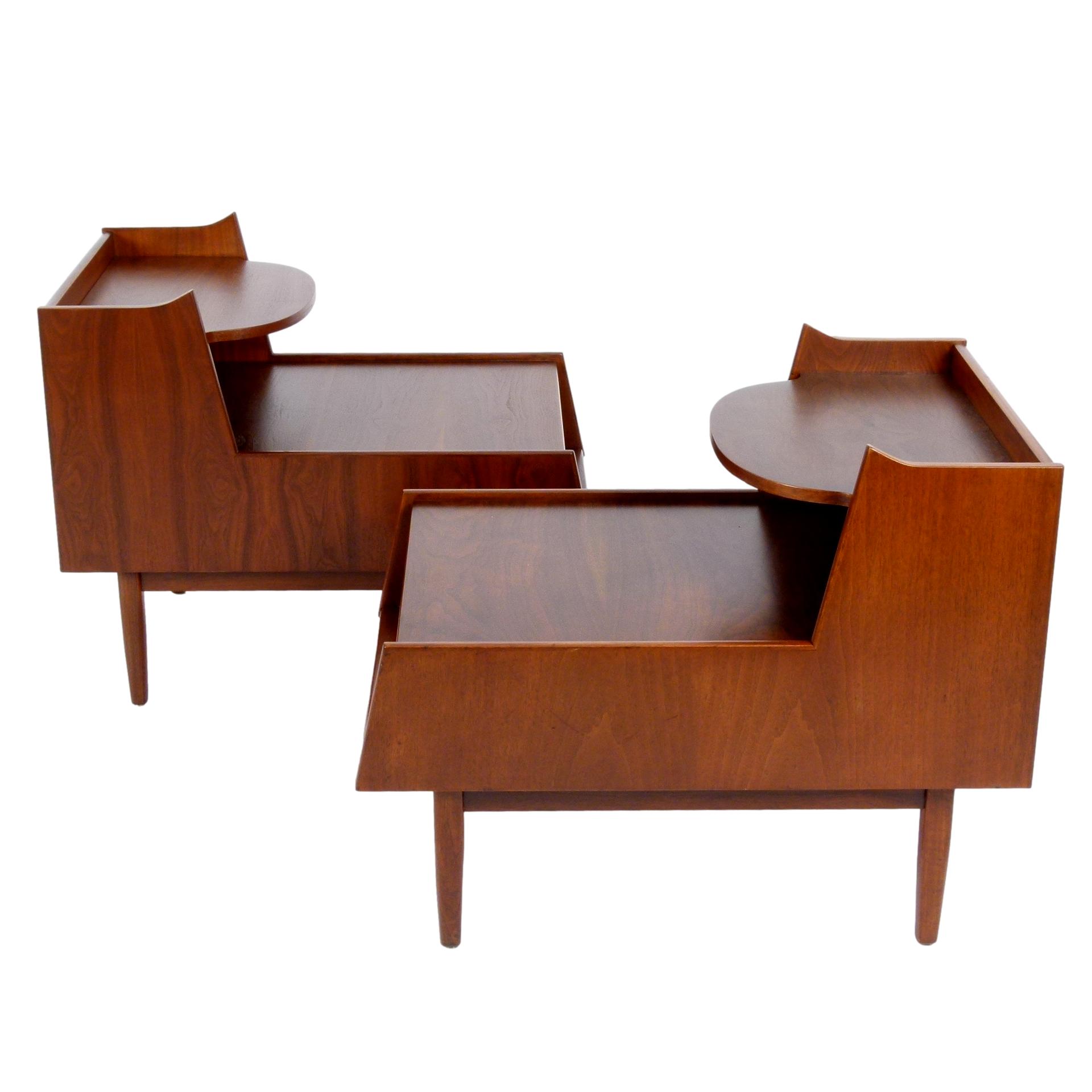 Pair of 1960s Drexel Declaration side tables designed by Kipp Stewart and Stewart MacDougall. Stunning walnut grain and sculptural lines.