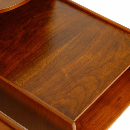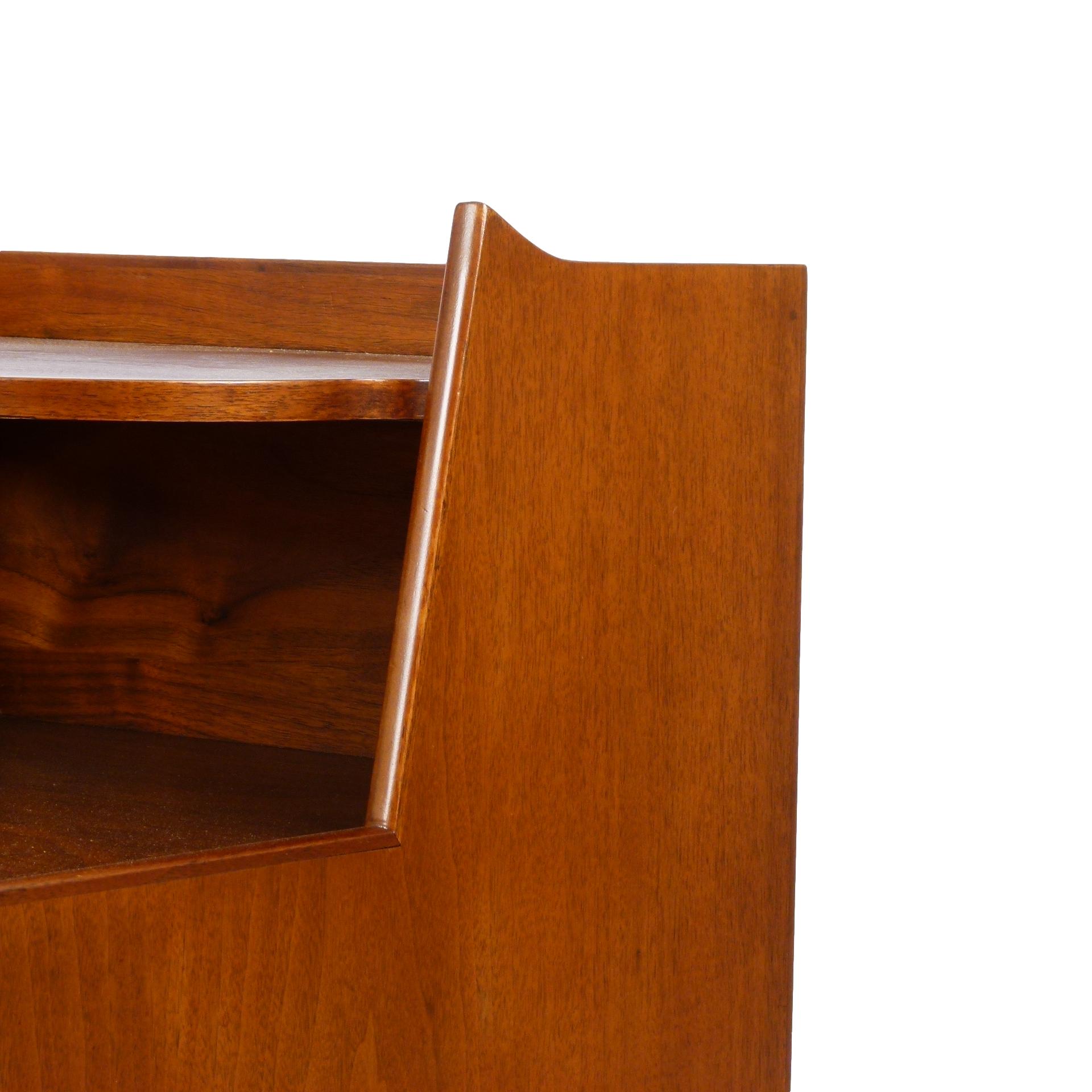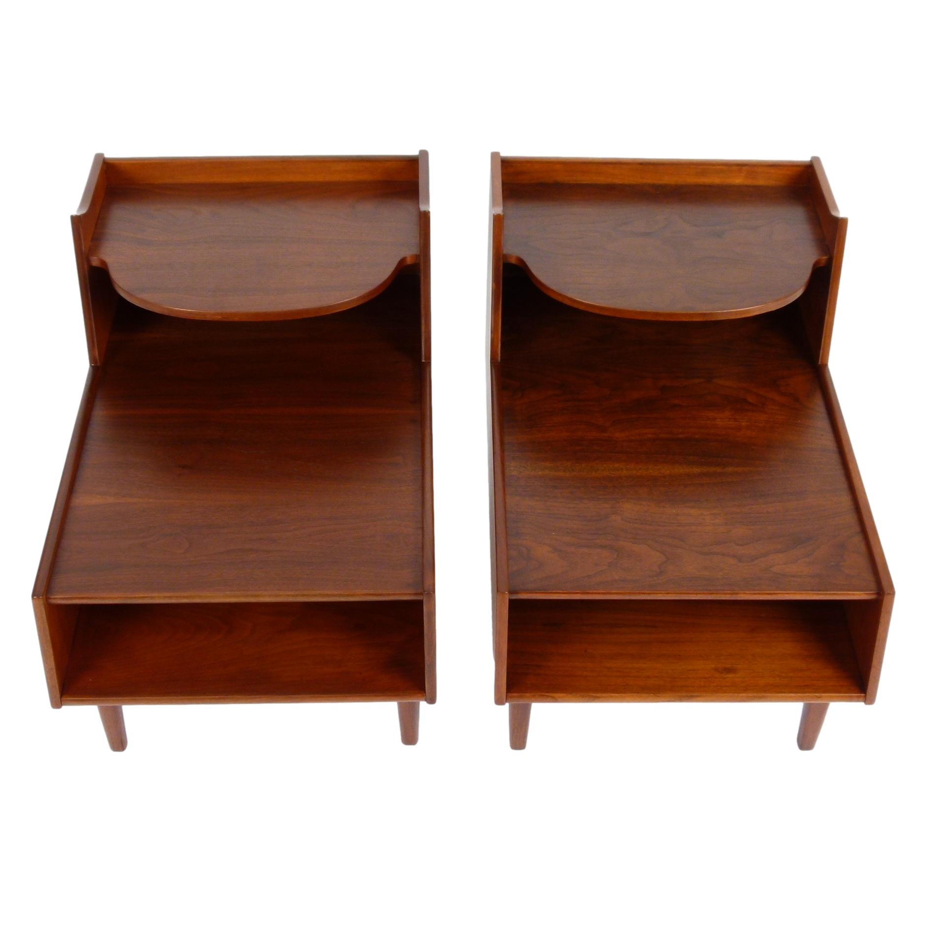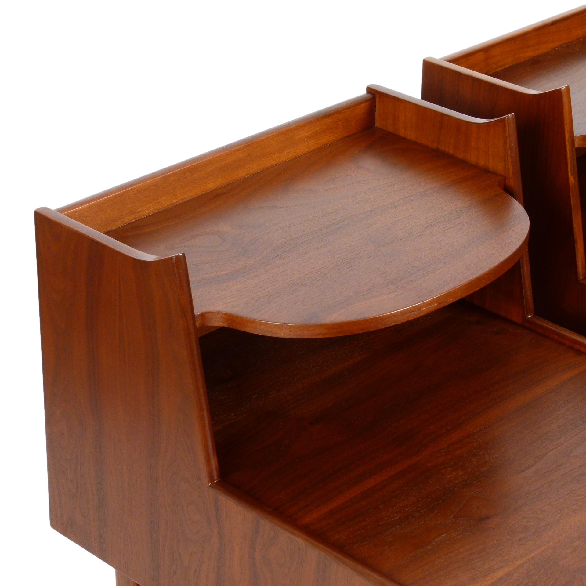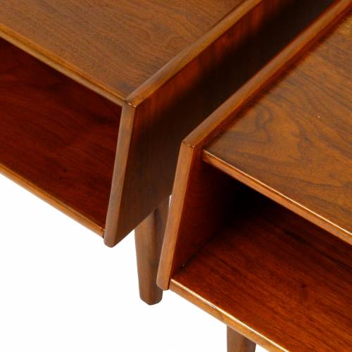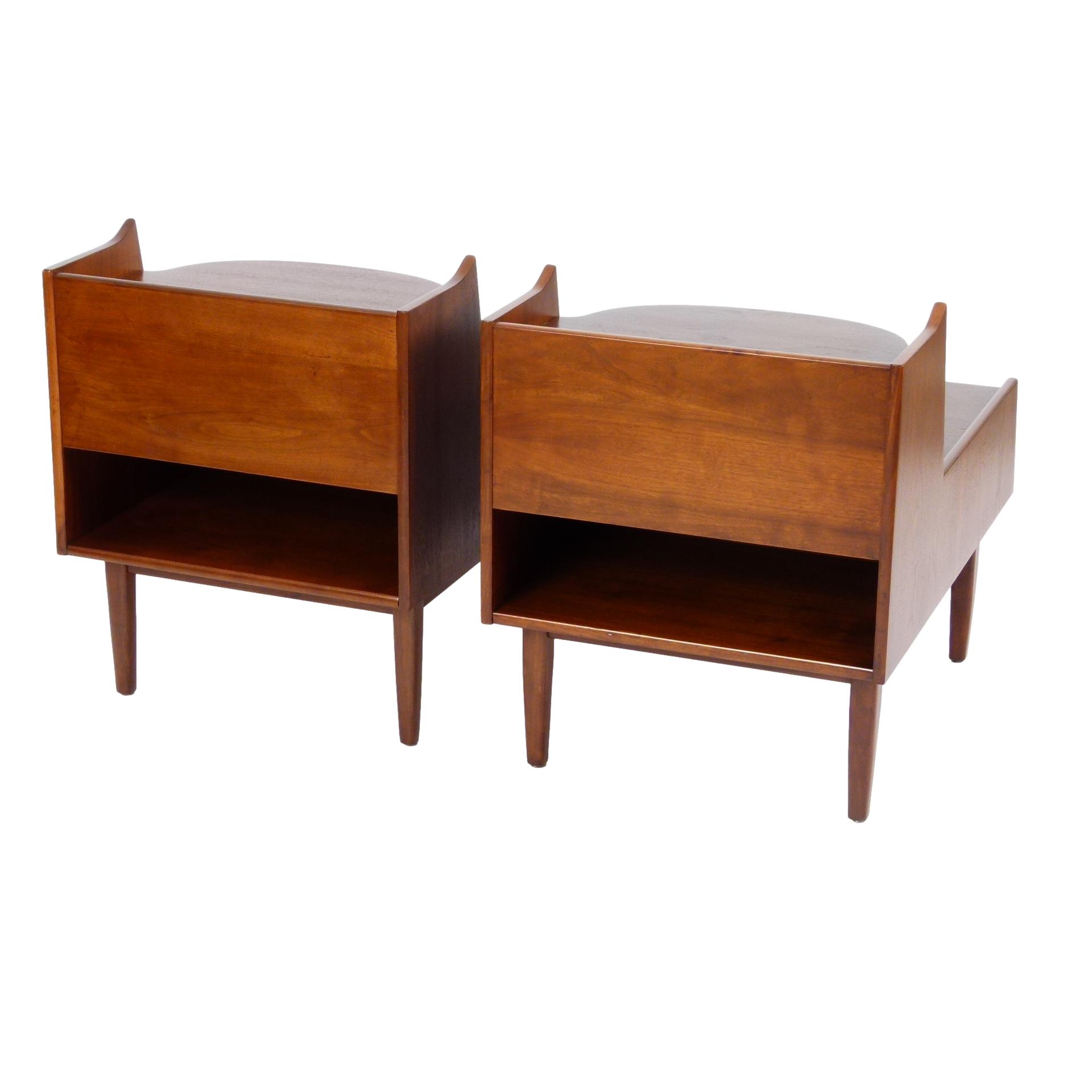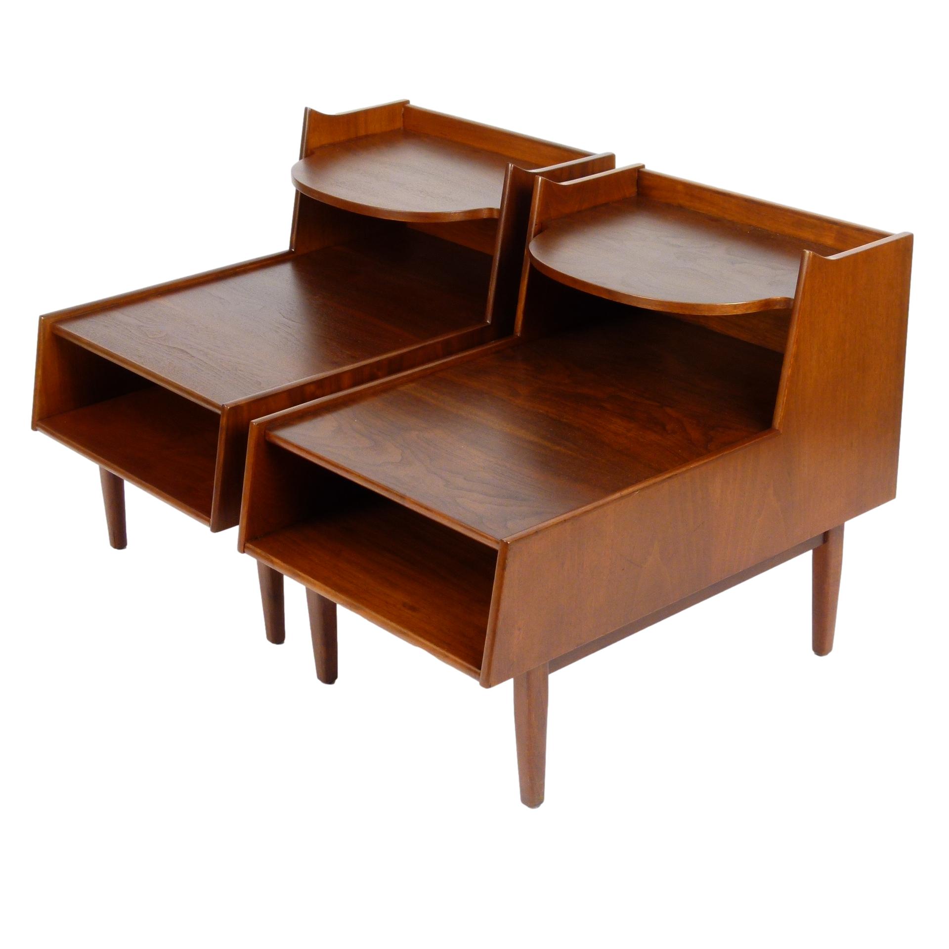 Pair of 1960s Drexel Declaration side tables designed by Kipp Stewart and Stewart MacDougall. Stunning walnut grain and sculptural lines.