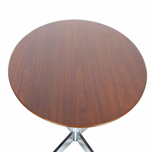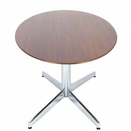 1960s chrome pedestal table with knife edge walnut top by Stow and Davis. Works great as a desk, entry table, or dining table.