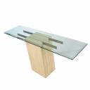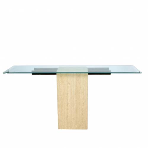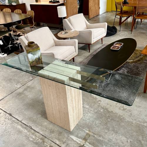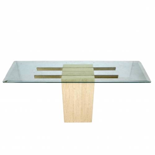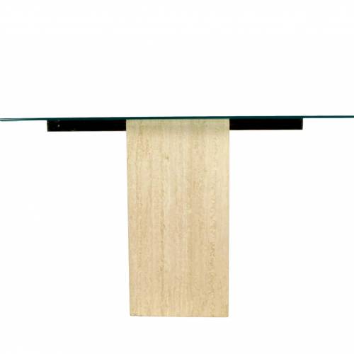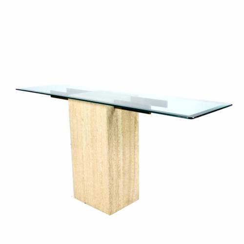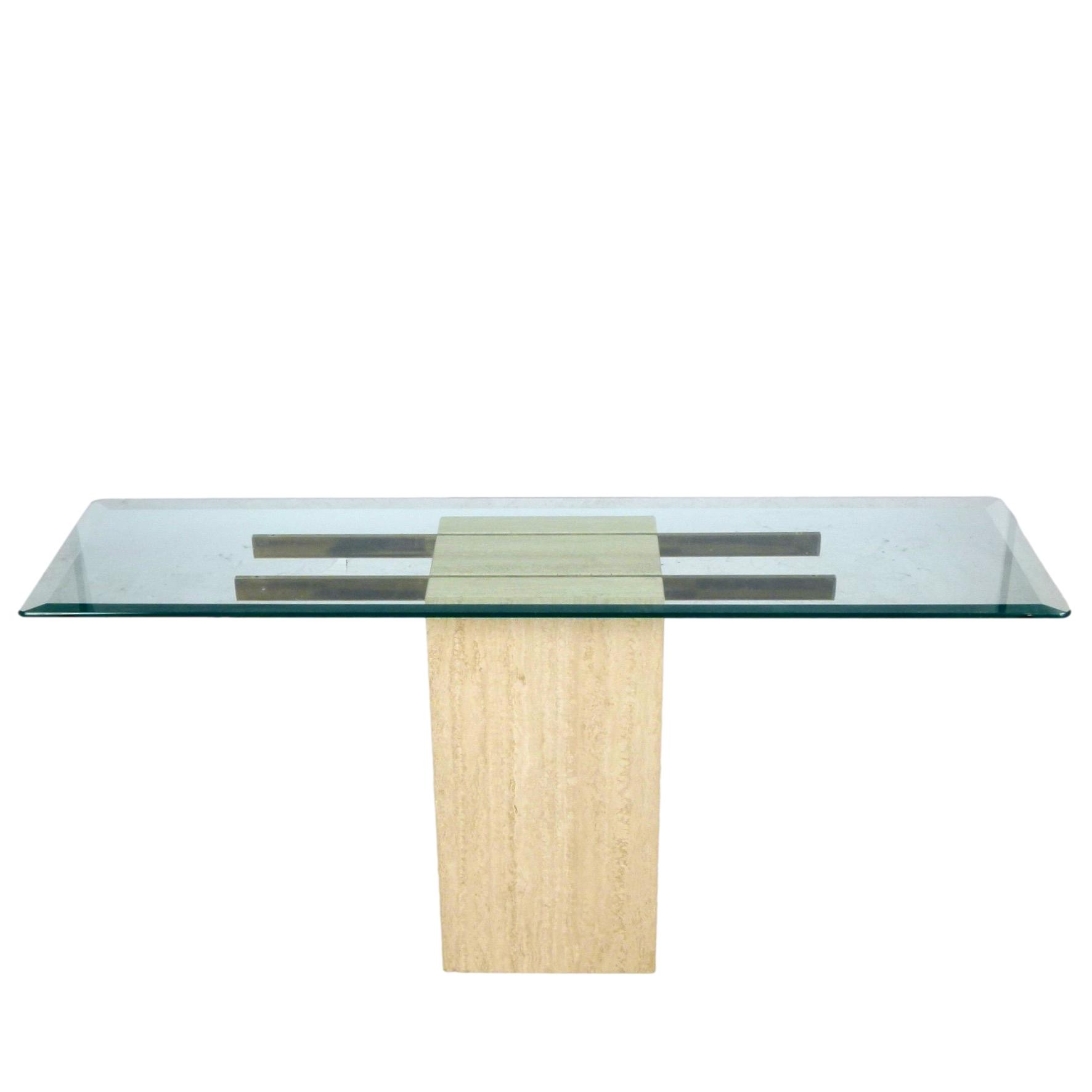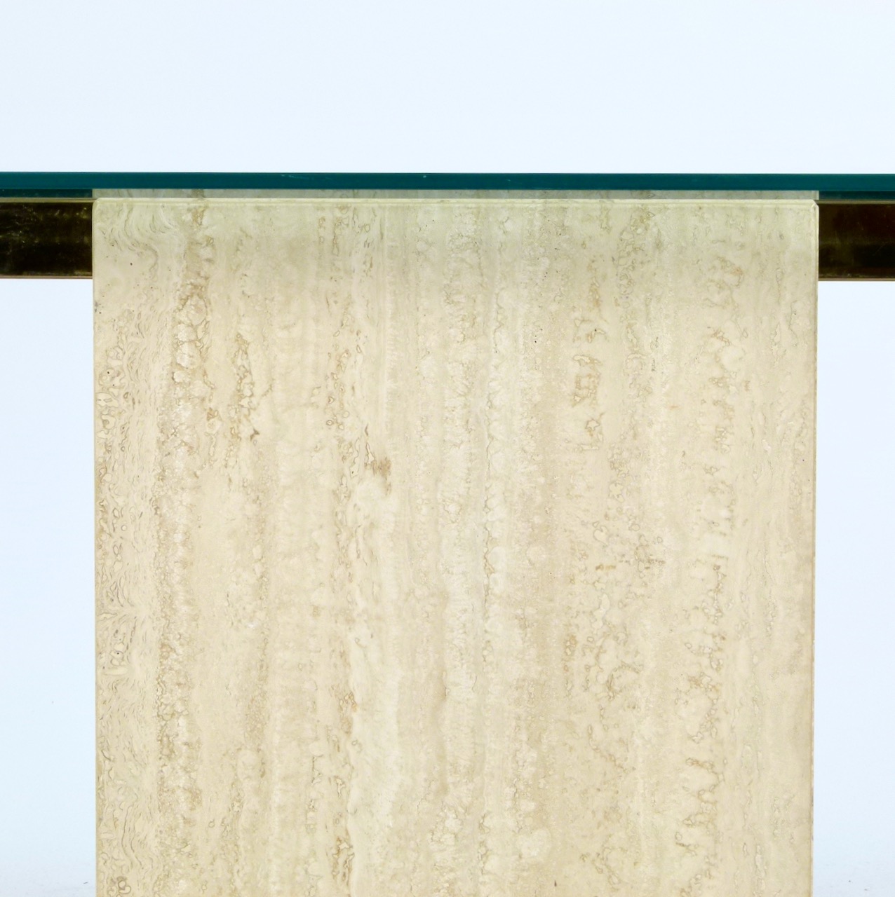 1970s Italian travertine, brass, and glass console or sofa table designed by Guy Barker for Ello furniture.