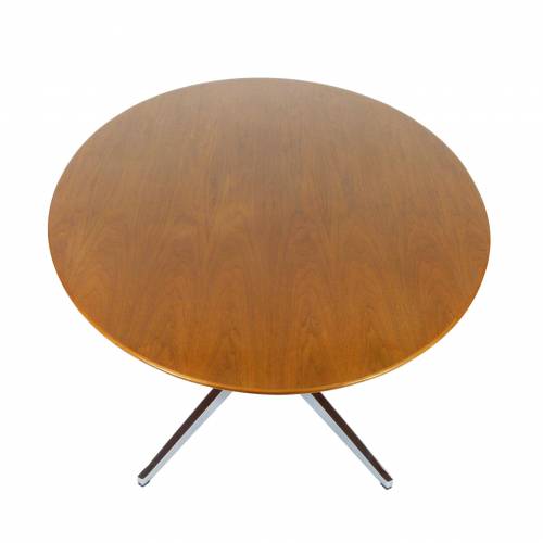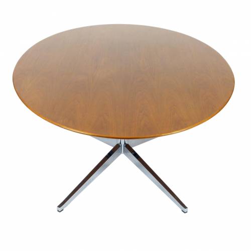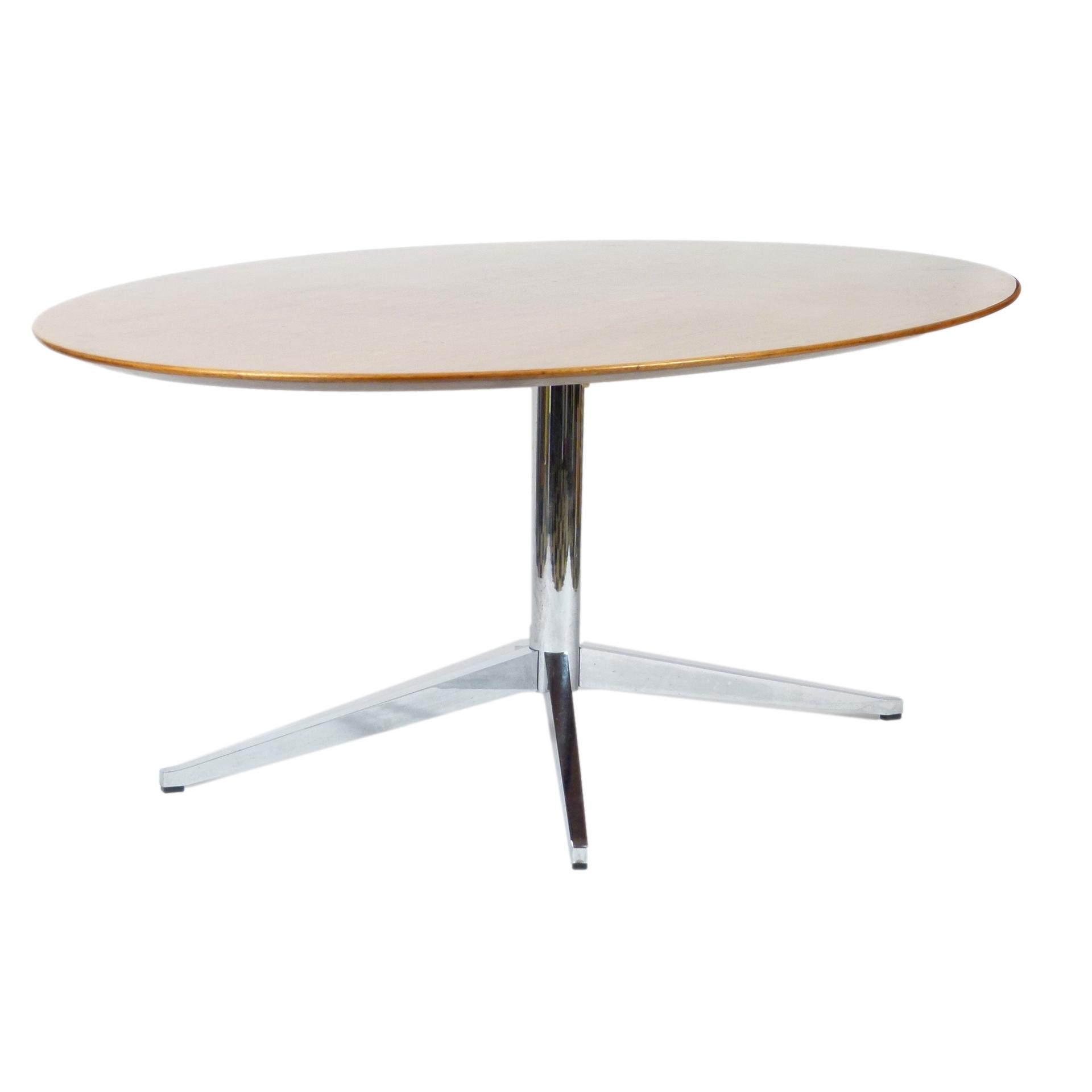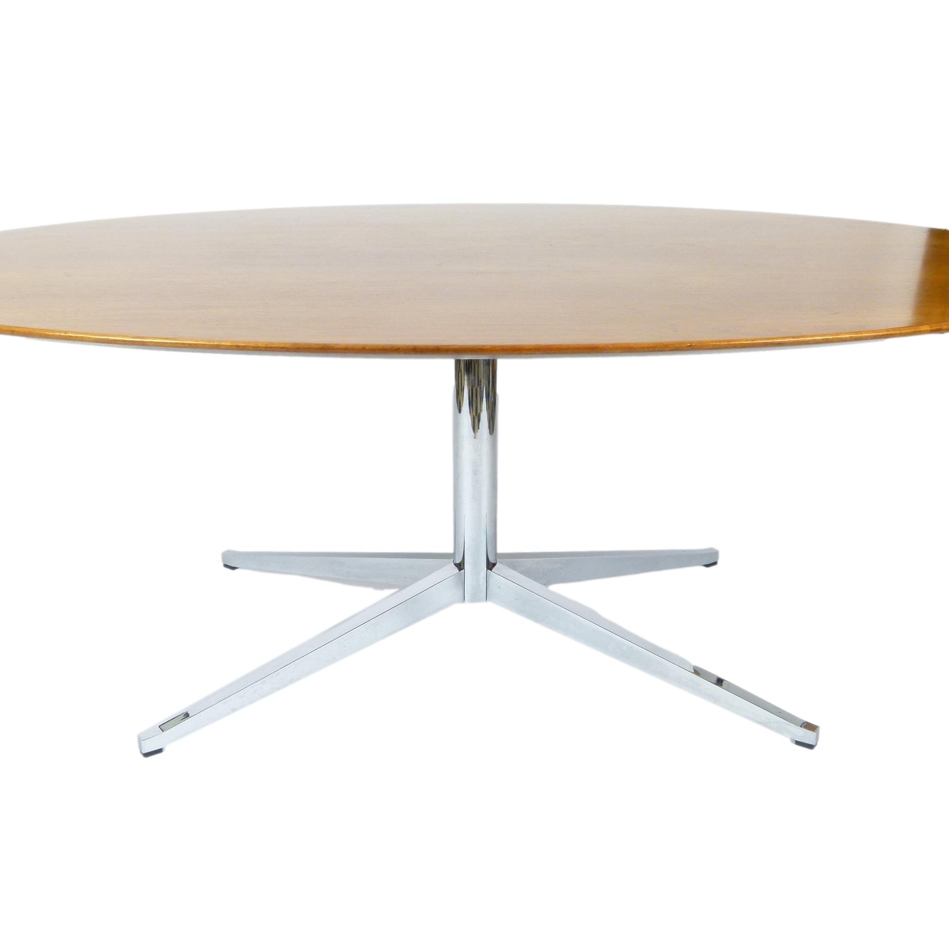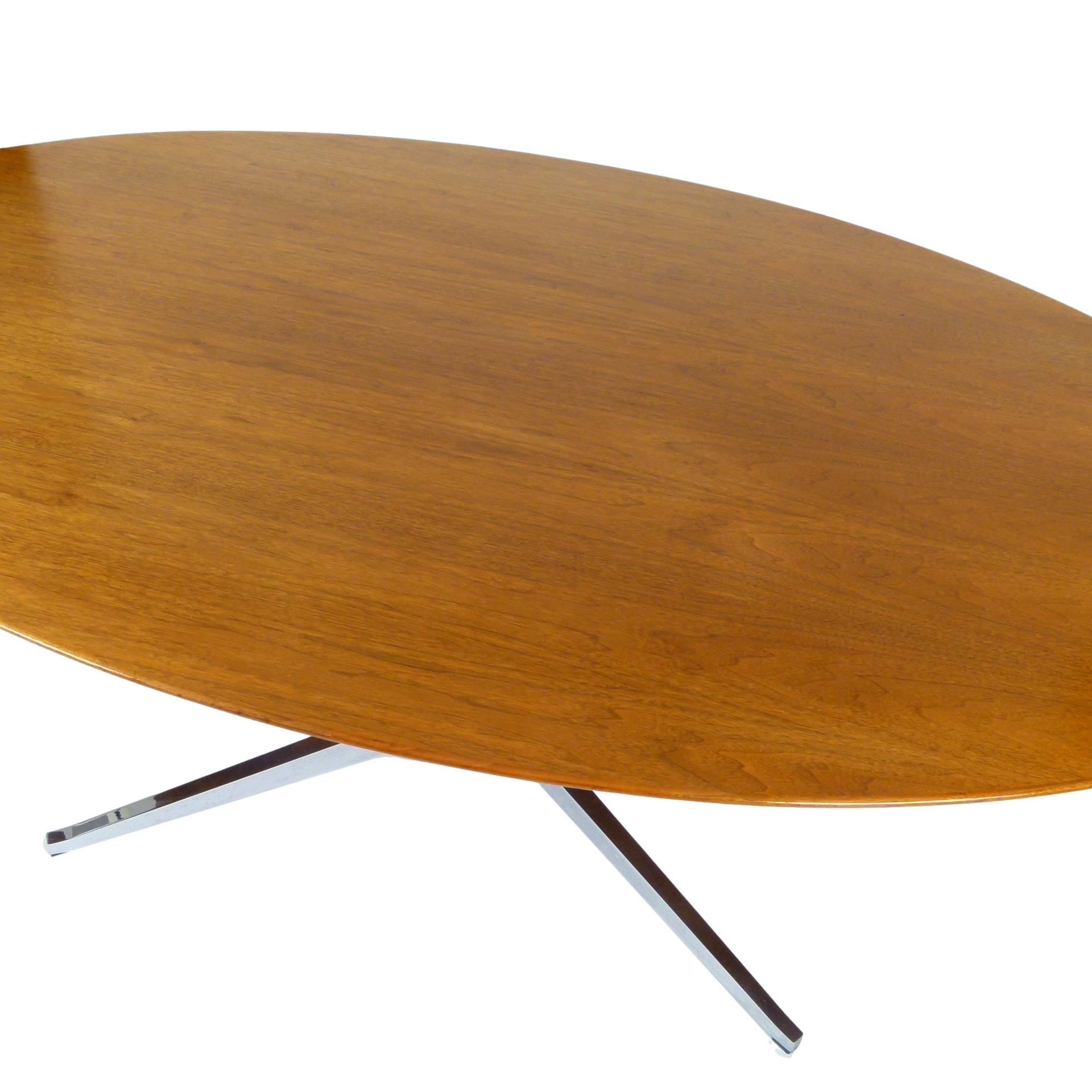 Classic Florence Knoll chromed steel pedestal table with knife edge oval walnut top by Knoll, 1970s. Can be used as a desk or dining table.