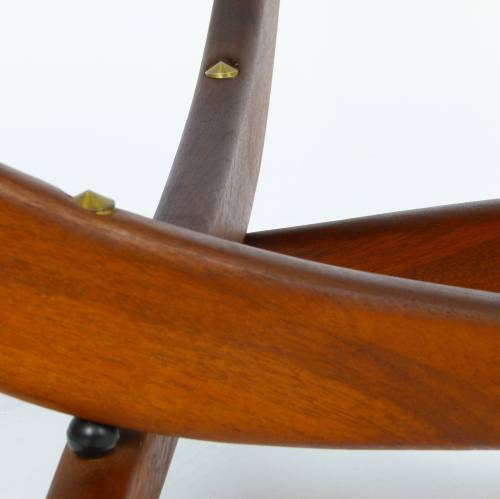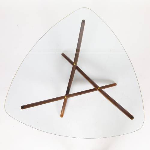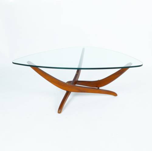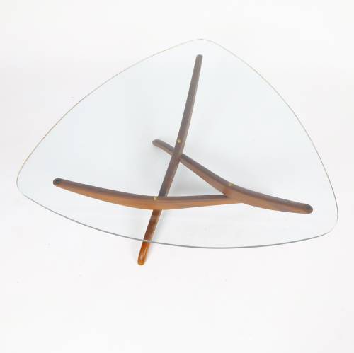 Walnut sculptural base with tempered glass top cocktail or coffee table designed by Forest Wilson.