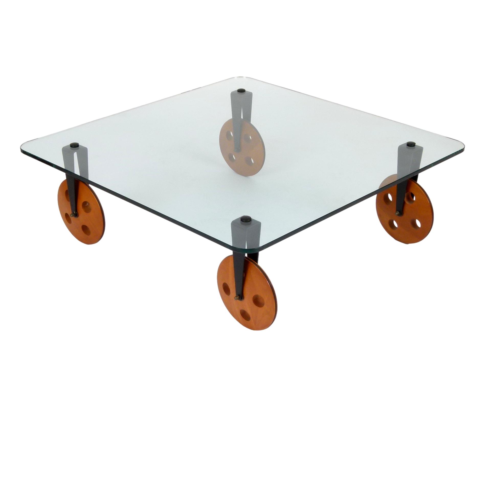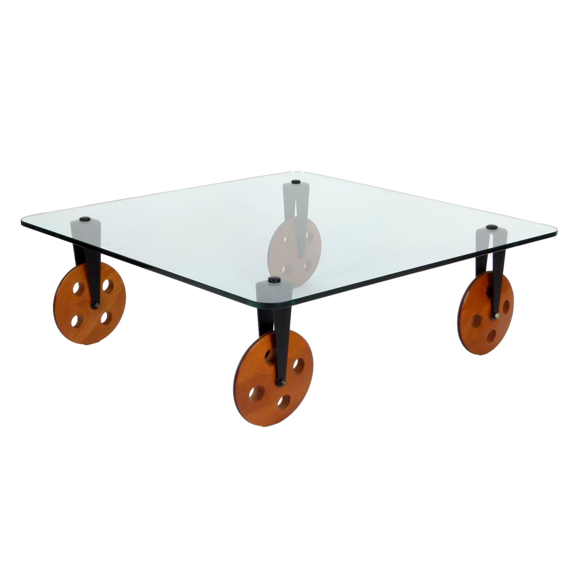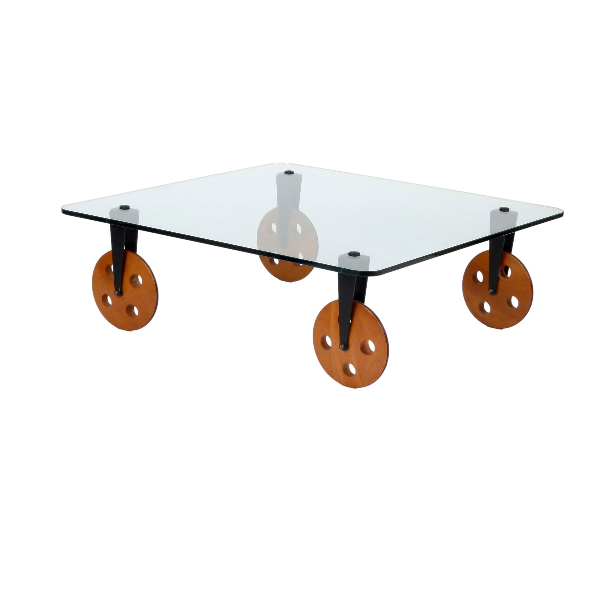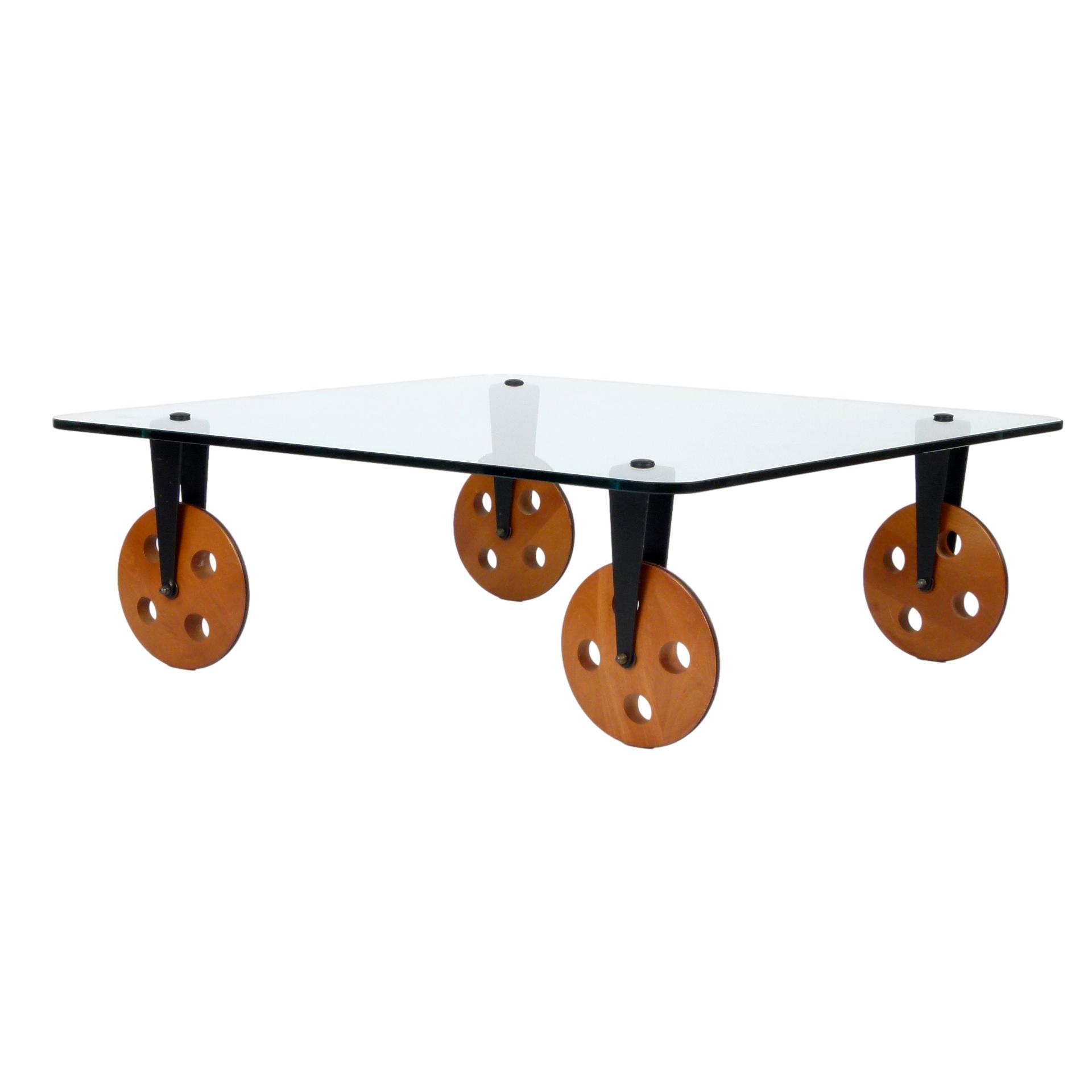 1970s Gae Aulenti for Fontana Arte coffee table on large wooden wheels, made in Italy.