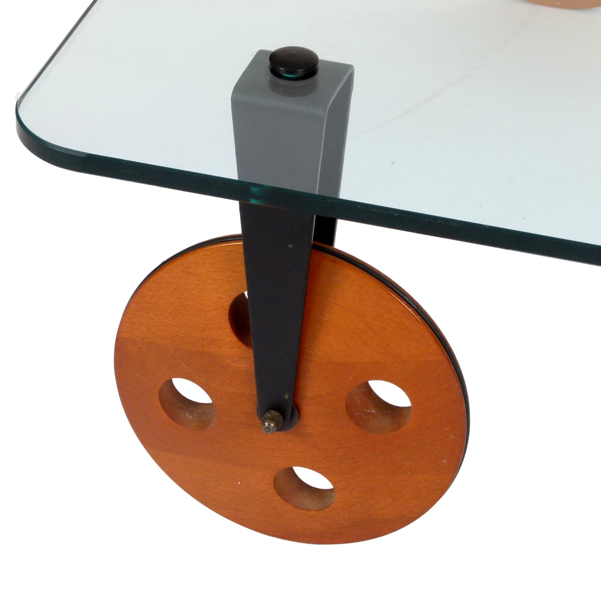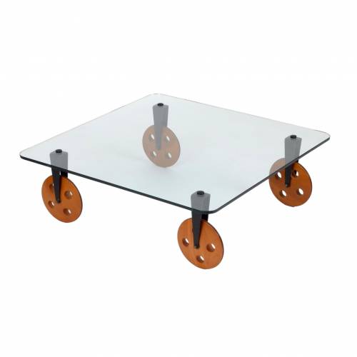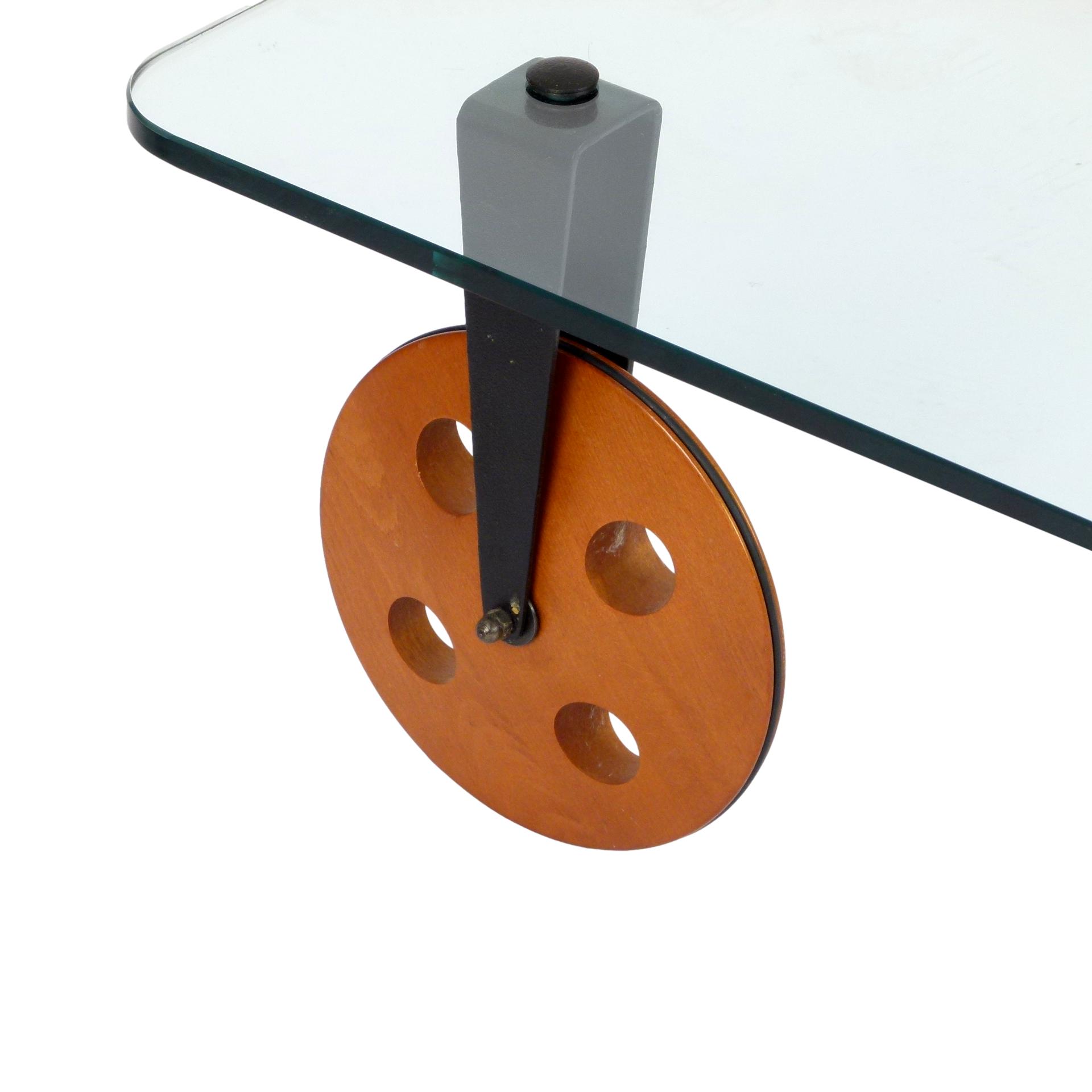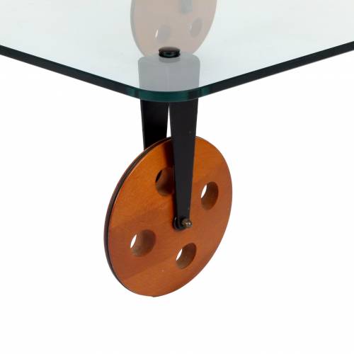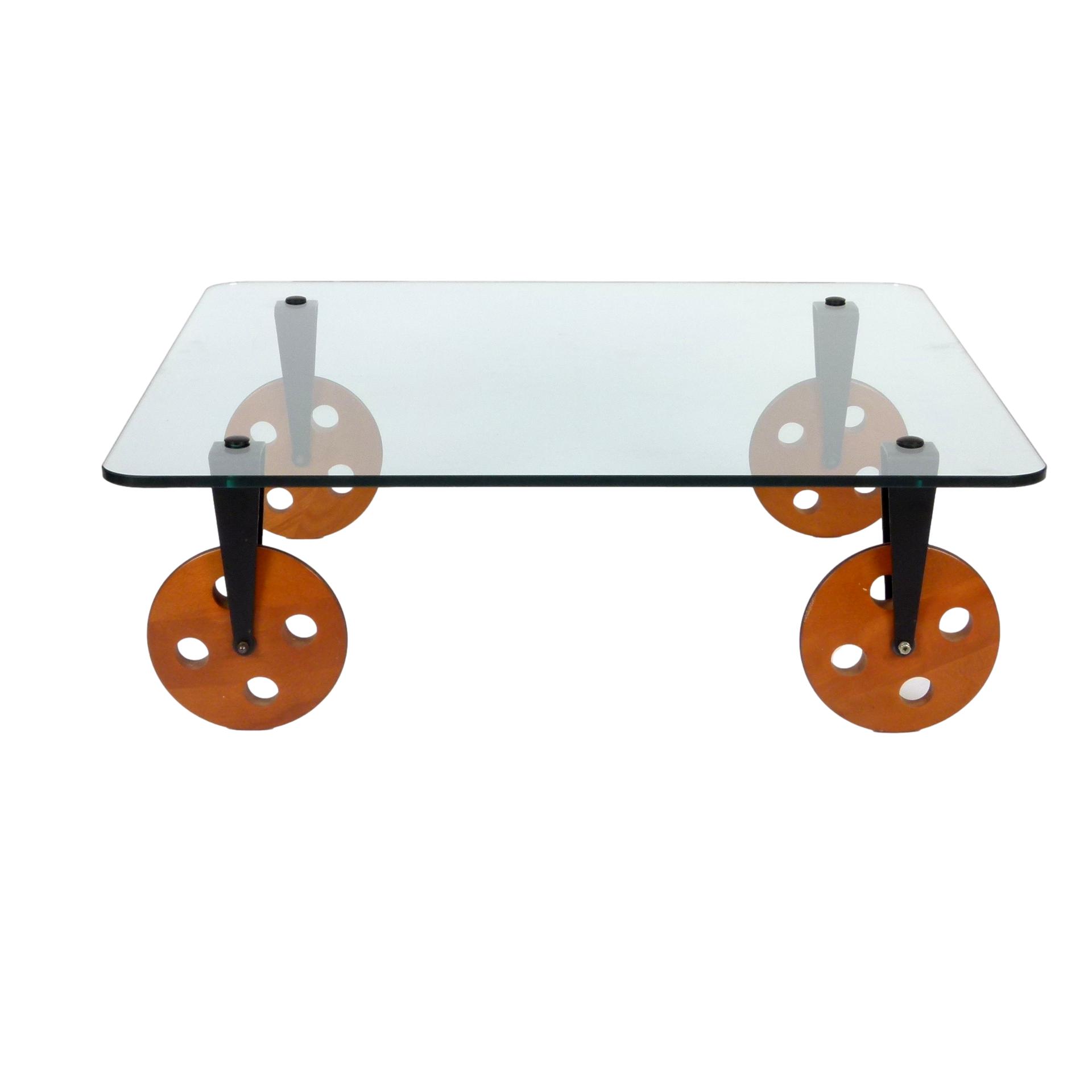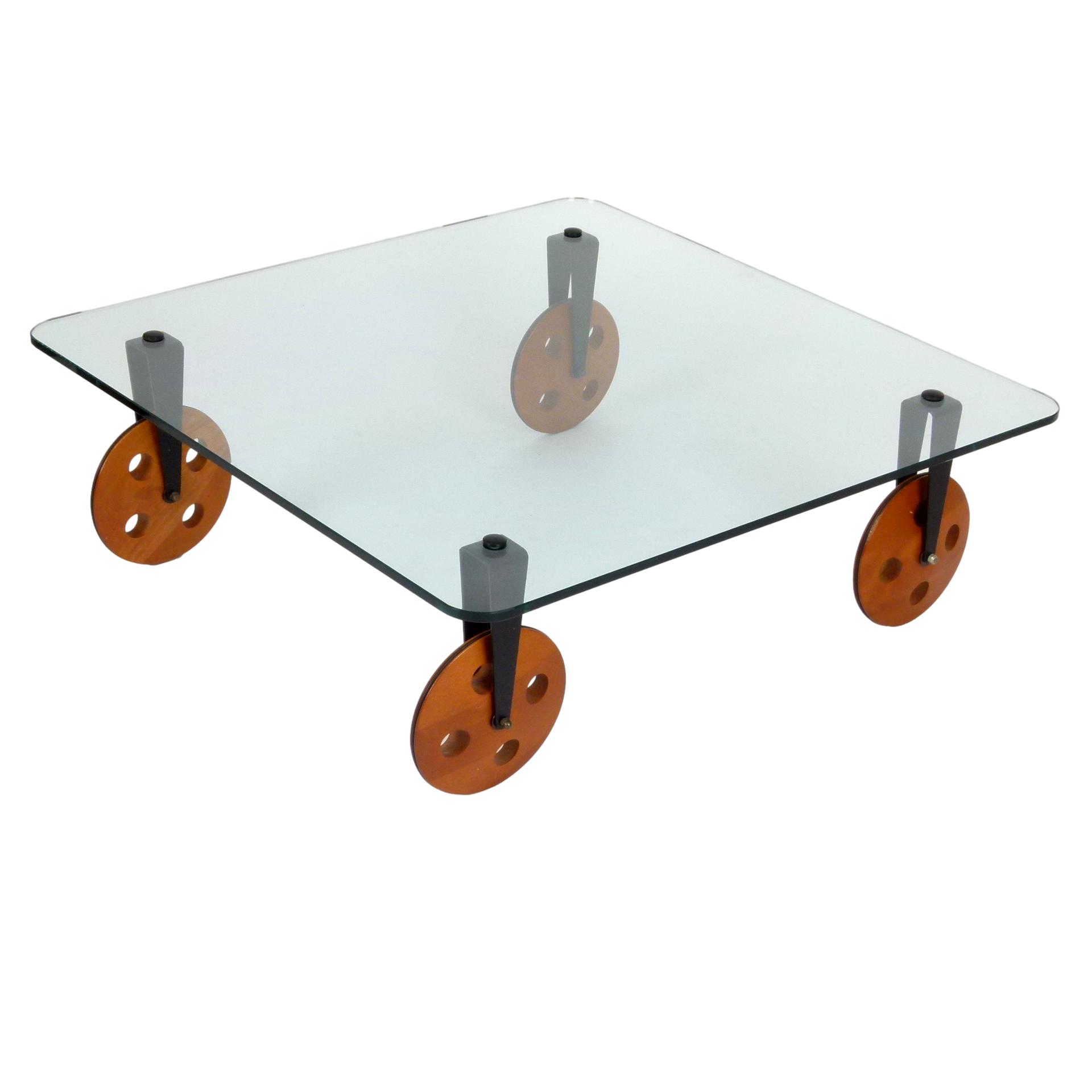 1970s Gae Aulenti for Fontana Arte coffee table on large wooden wheels, made in Italy.